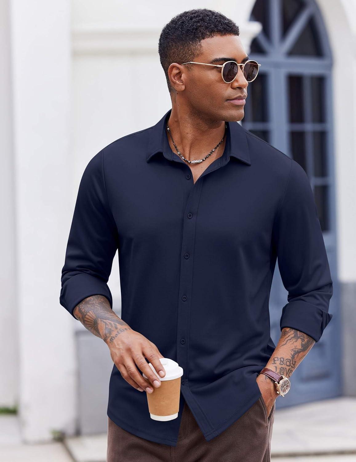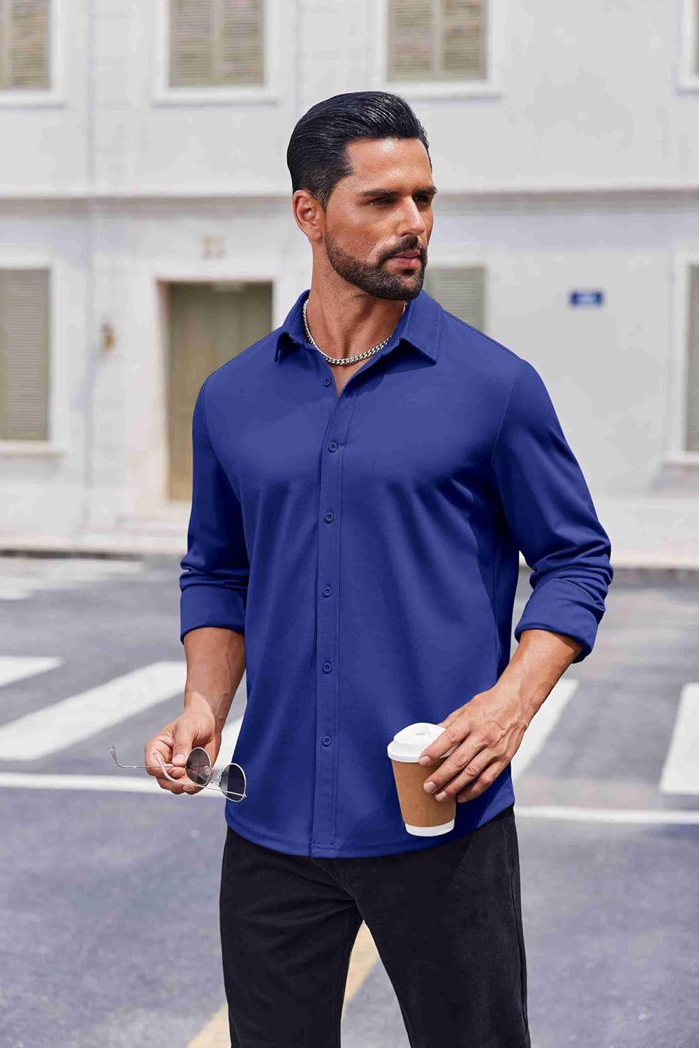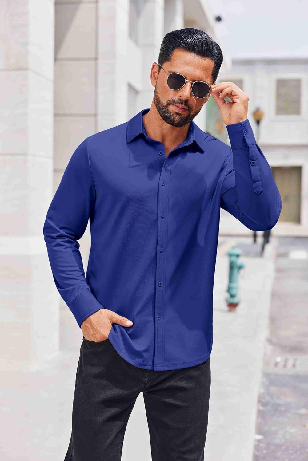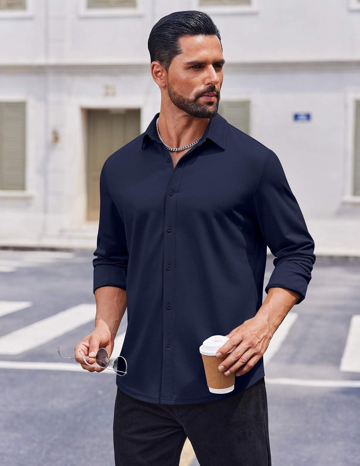 COOFANDY Men’s Casual Button Down Shirt Long Sleeve Untucked Shirt Stretch Denim Dress Shirt with Pockets(Deep Blue)