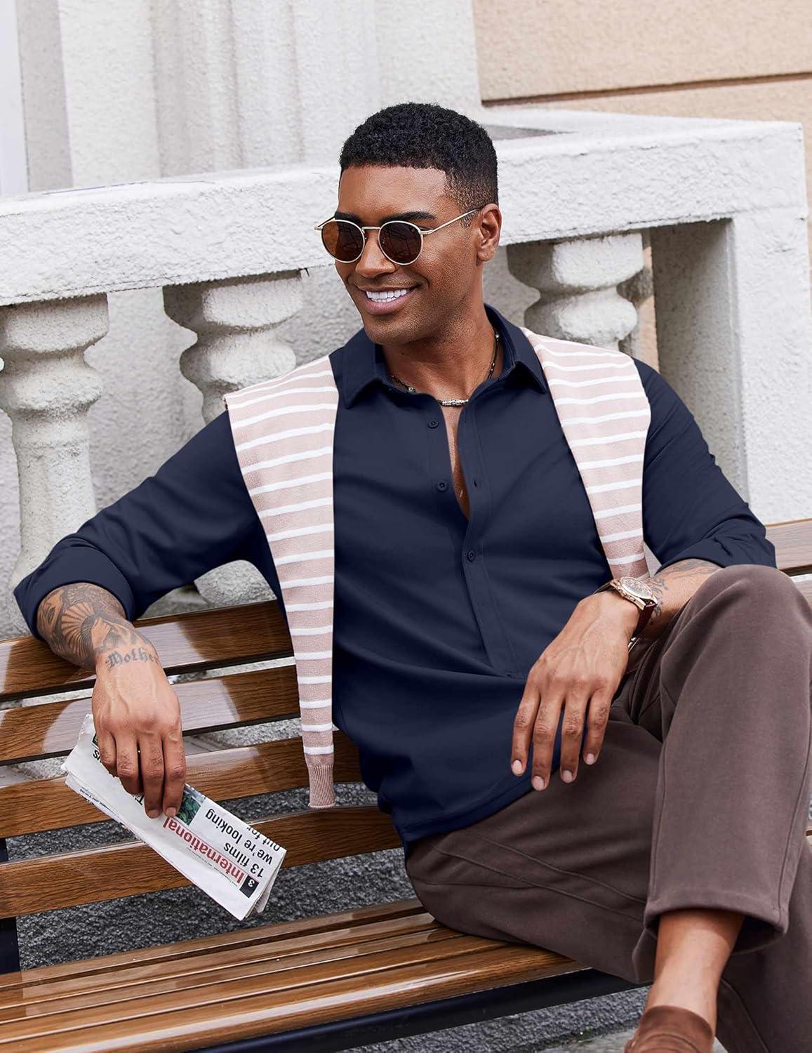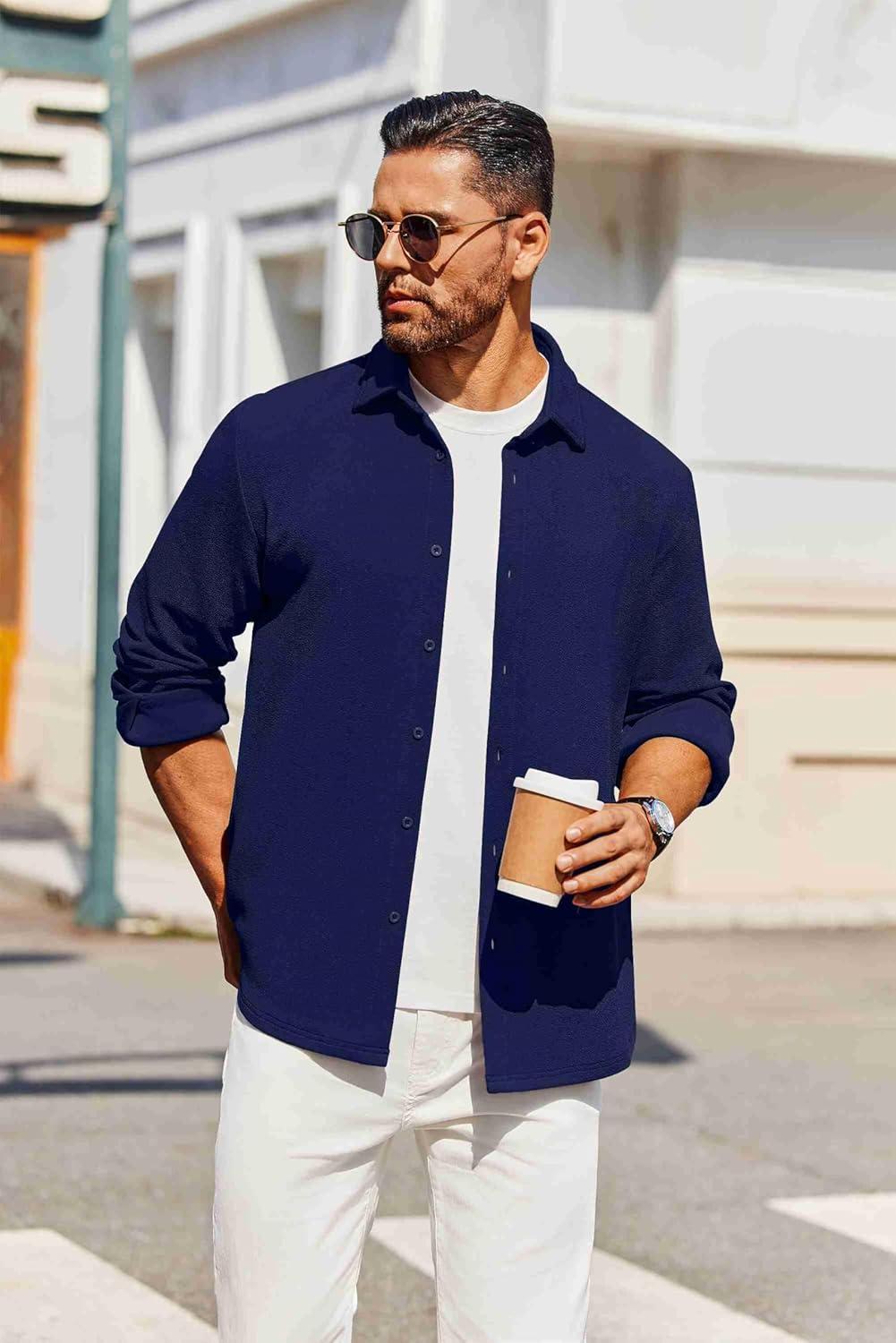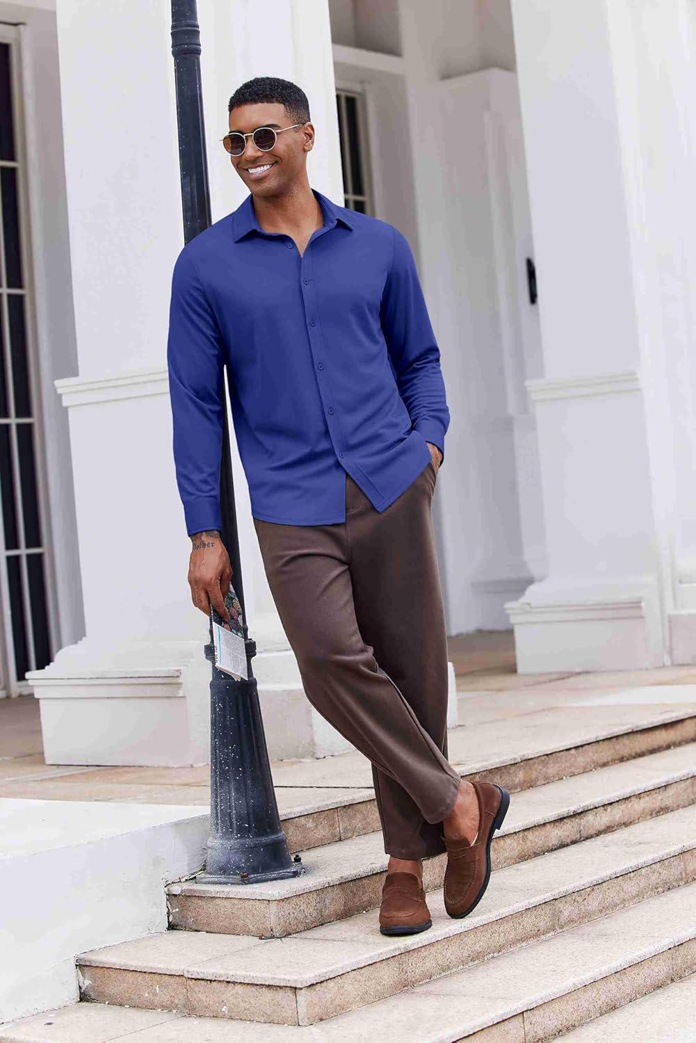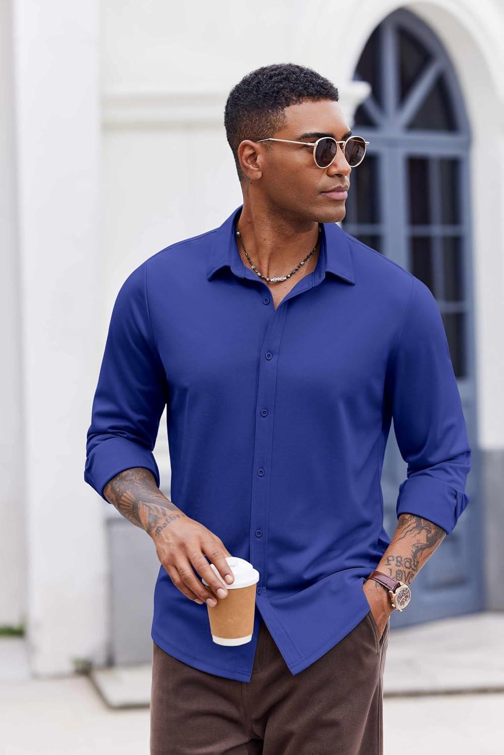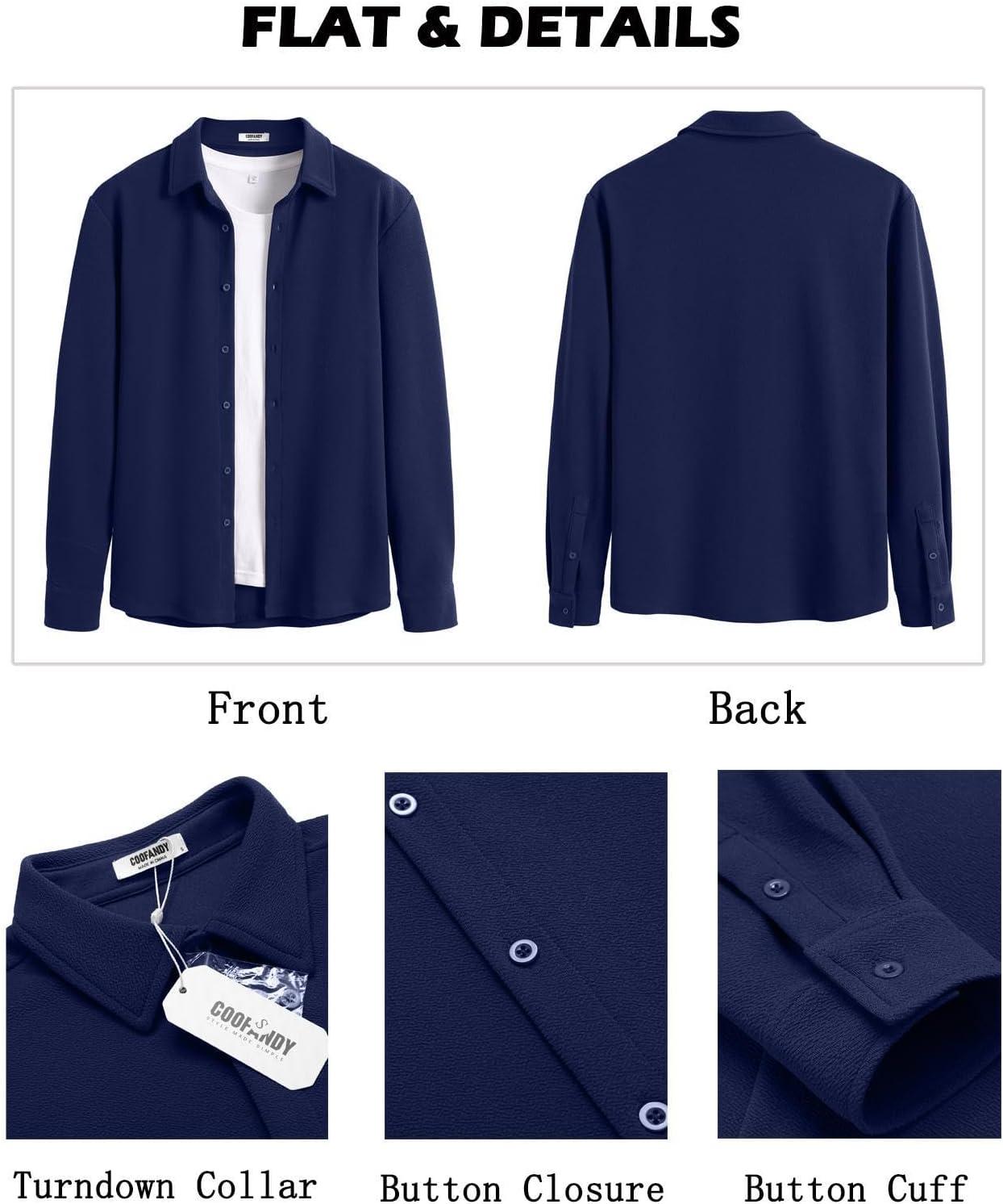 COOFANDY Men’s Casual Button Down Shirt Long Sleeve Untucked Shirt Stretch Denim Dress Shirt with Pockets(Deep Blue)