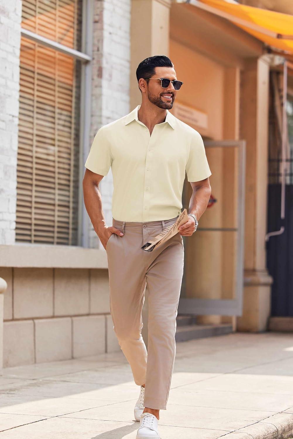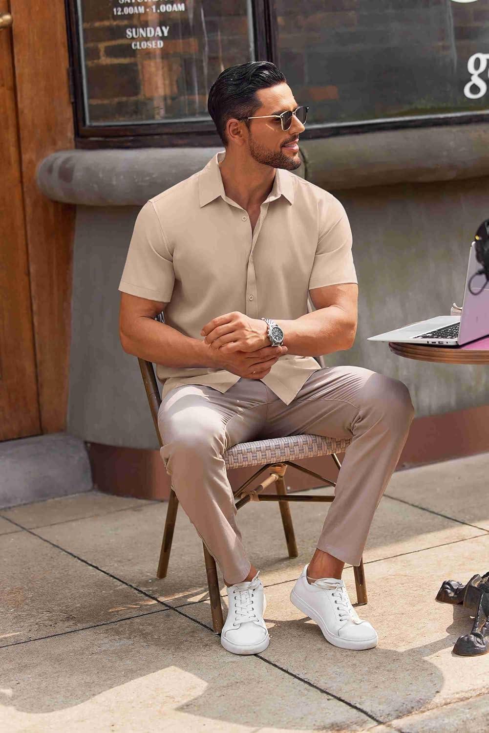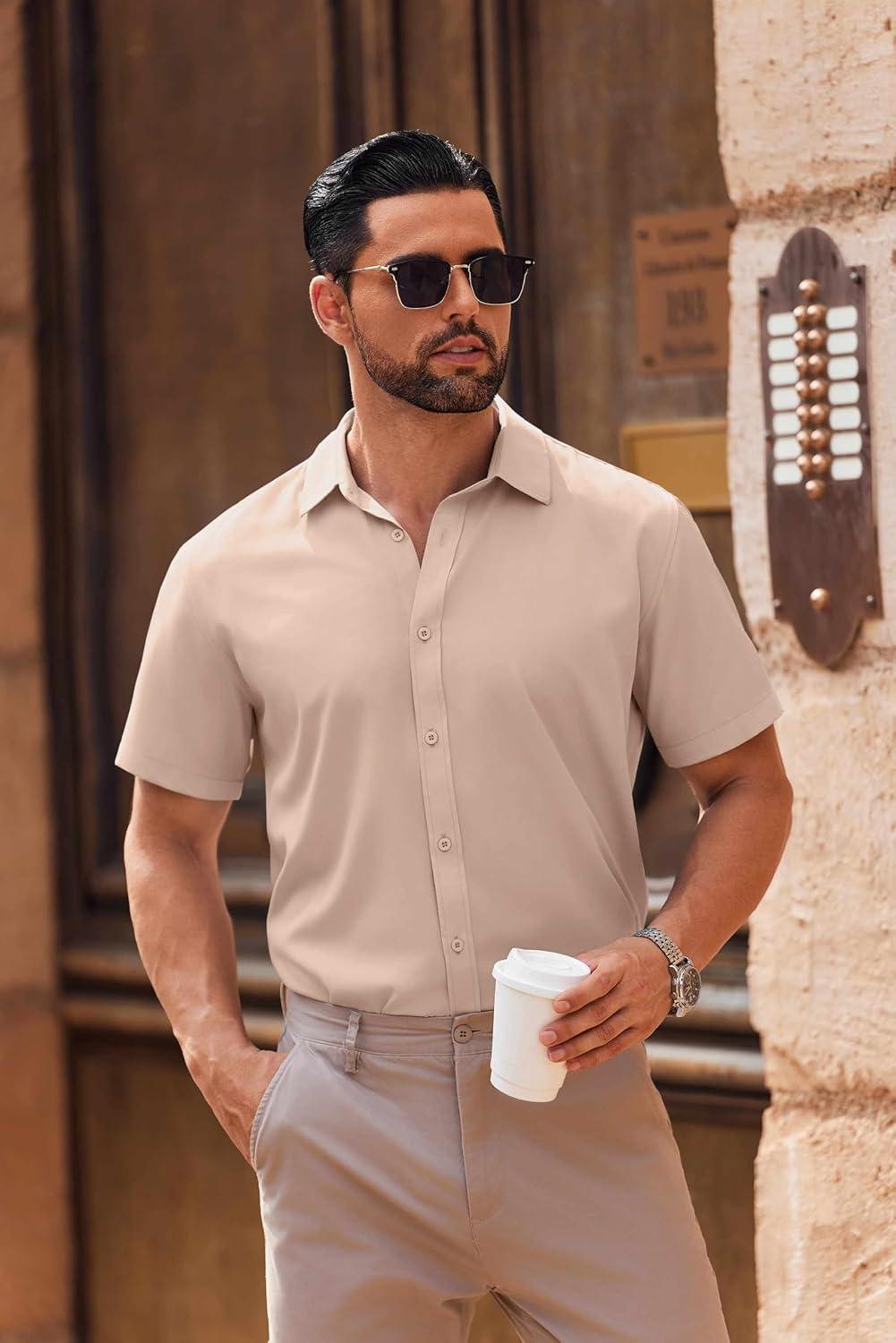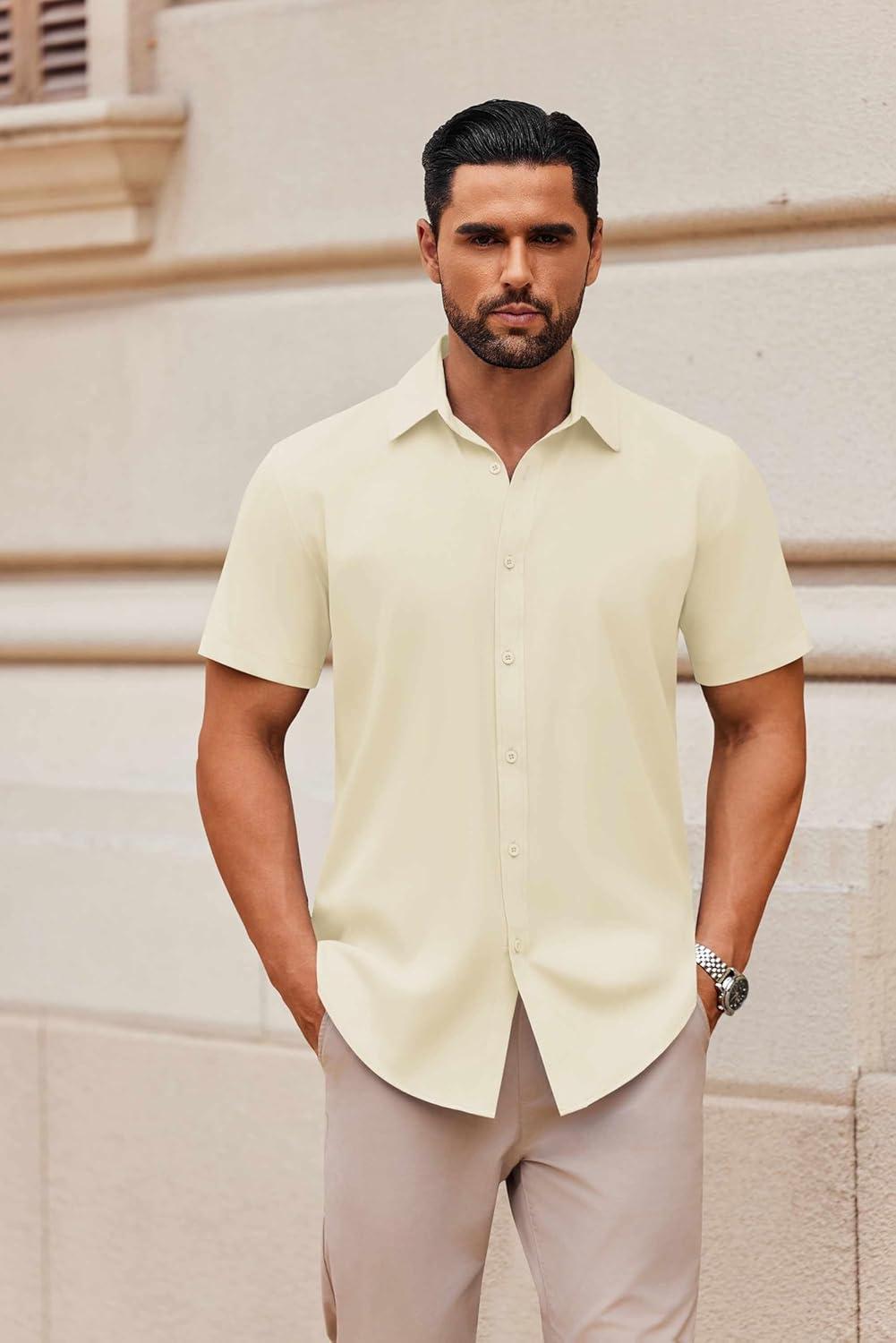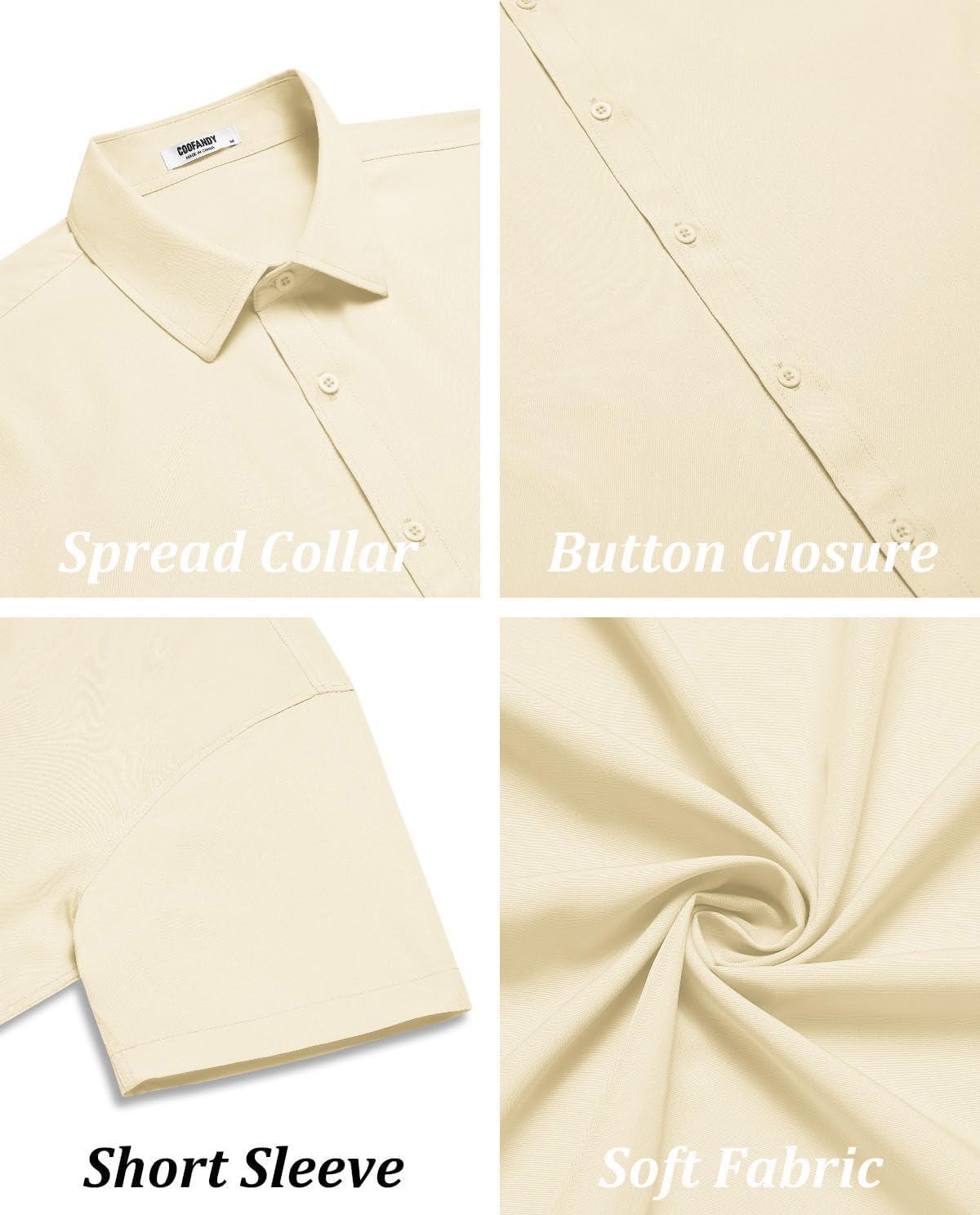 COOFANDY Mens Casual Short Sleeve Button Down Shirts Summer Untucked Wrinkle Free Shirts(Light Khaki)