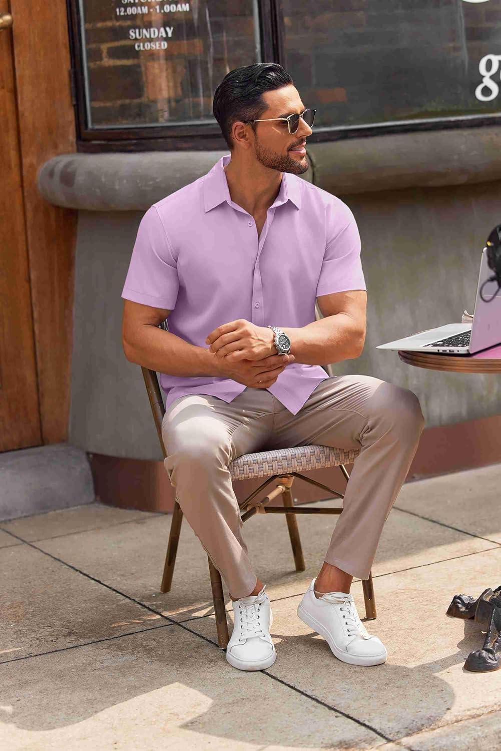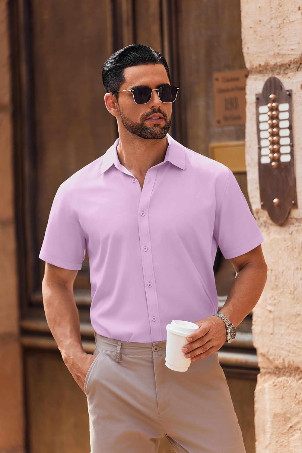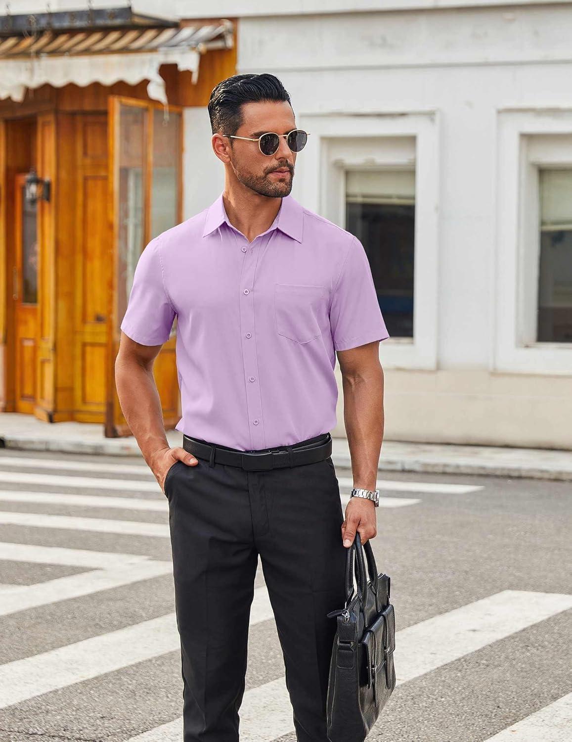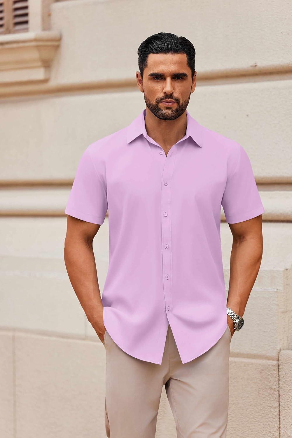 COOFANDY Mens Short Sleeve Button Down Shirt Lightweight Wrinkle Free Untucked Dress Shirts(Light Purple)