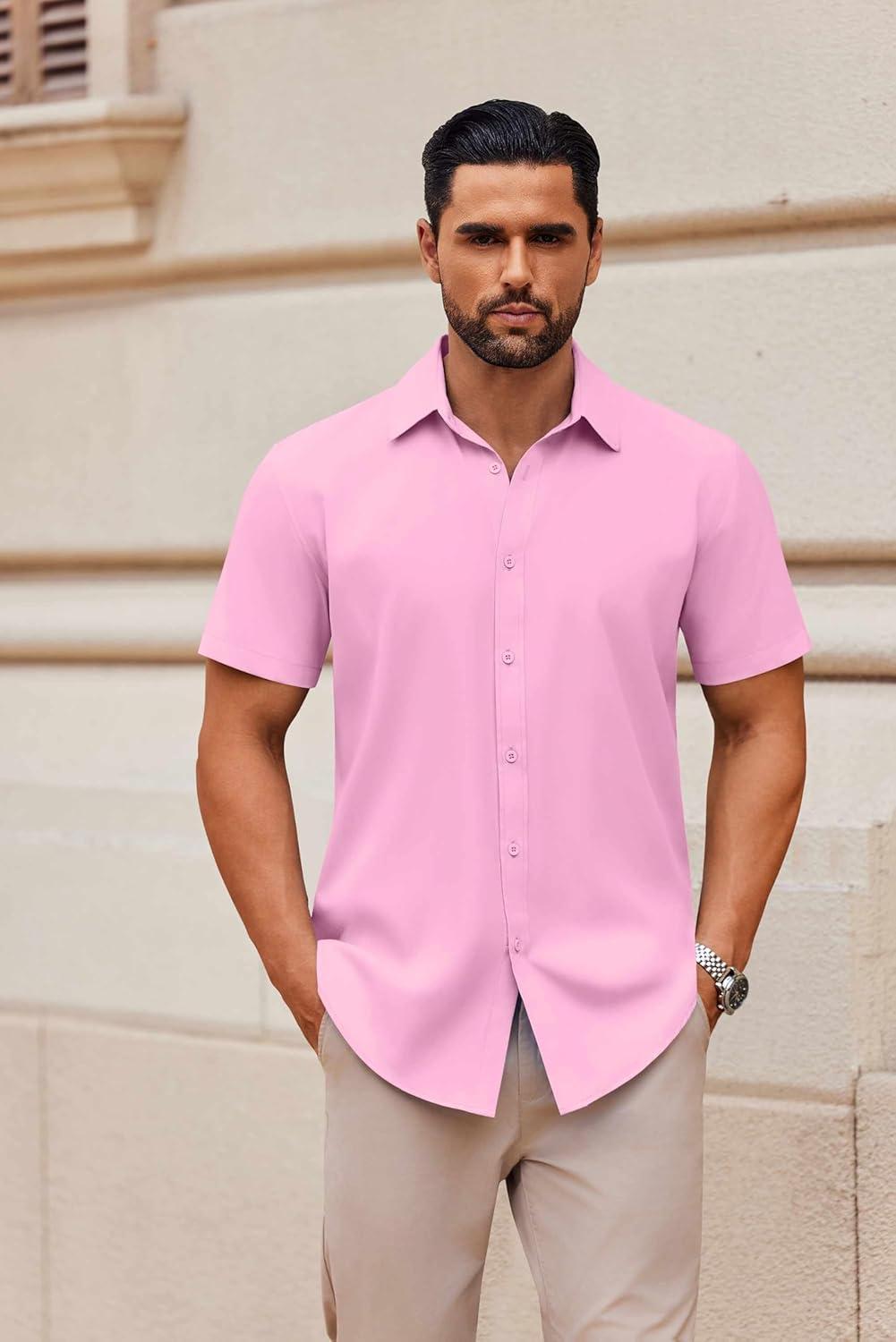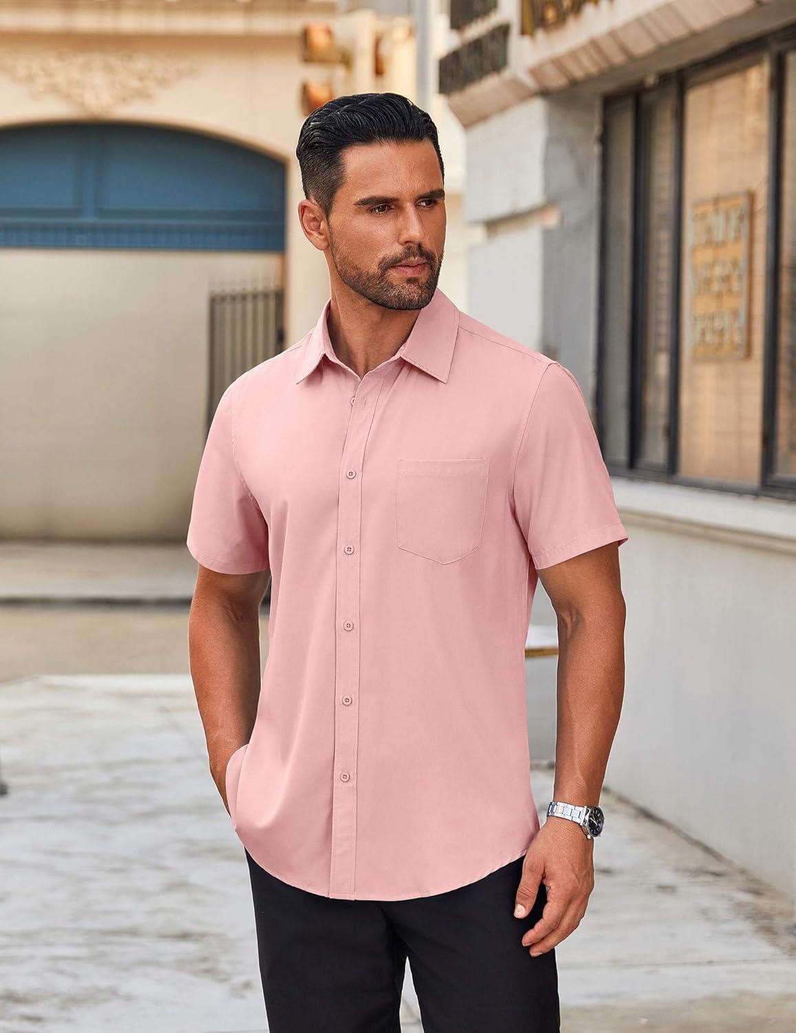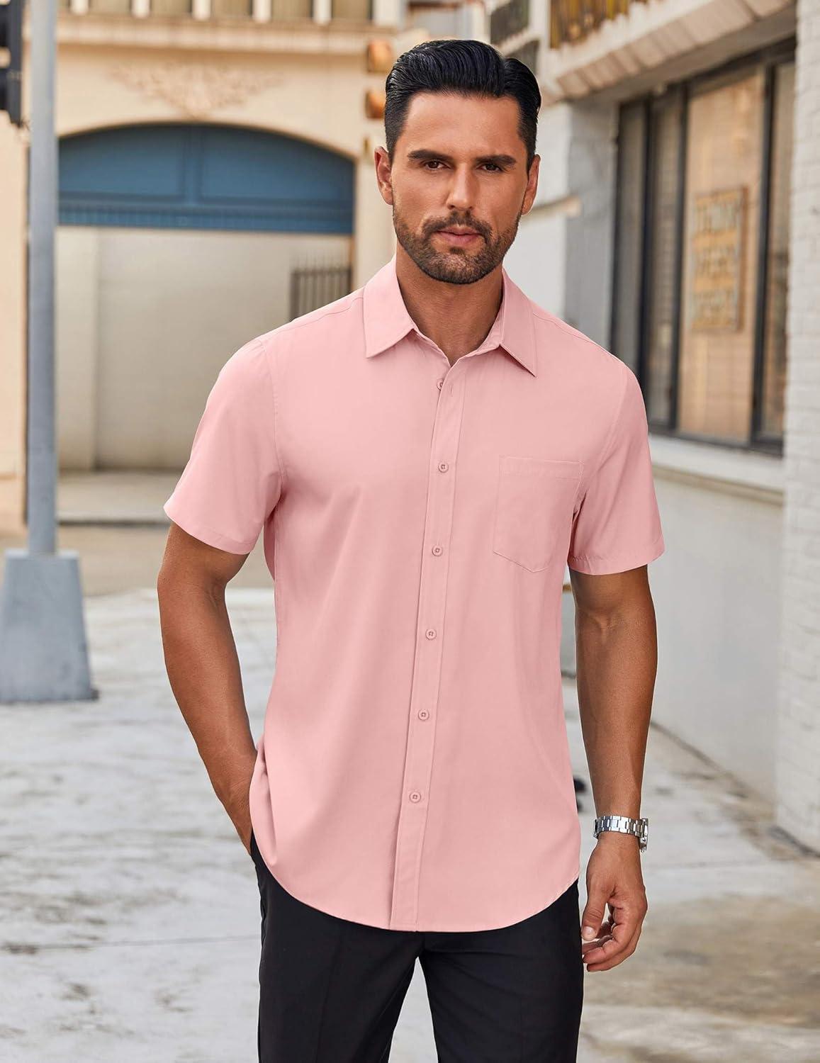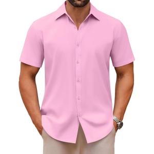 COOFANDY Mens Short Sleeve Button Down Shirt Lightweight Wrinkle Free Untucked Dress Shirts(Light Pink)