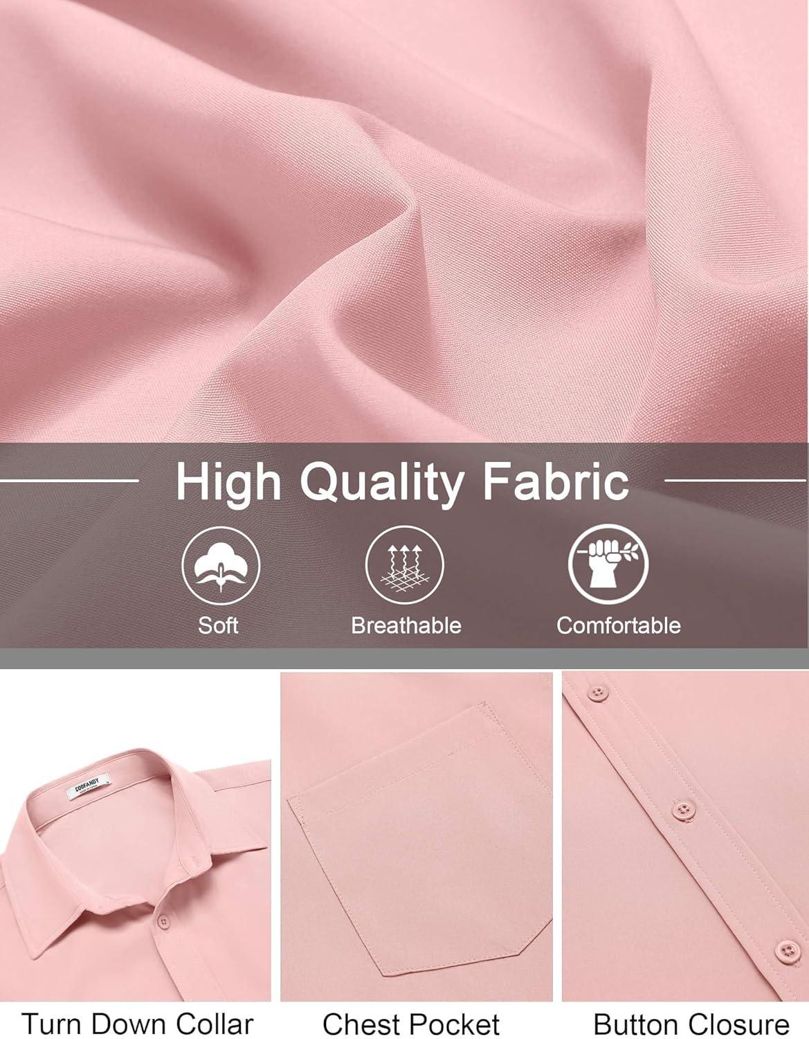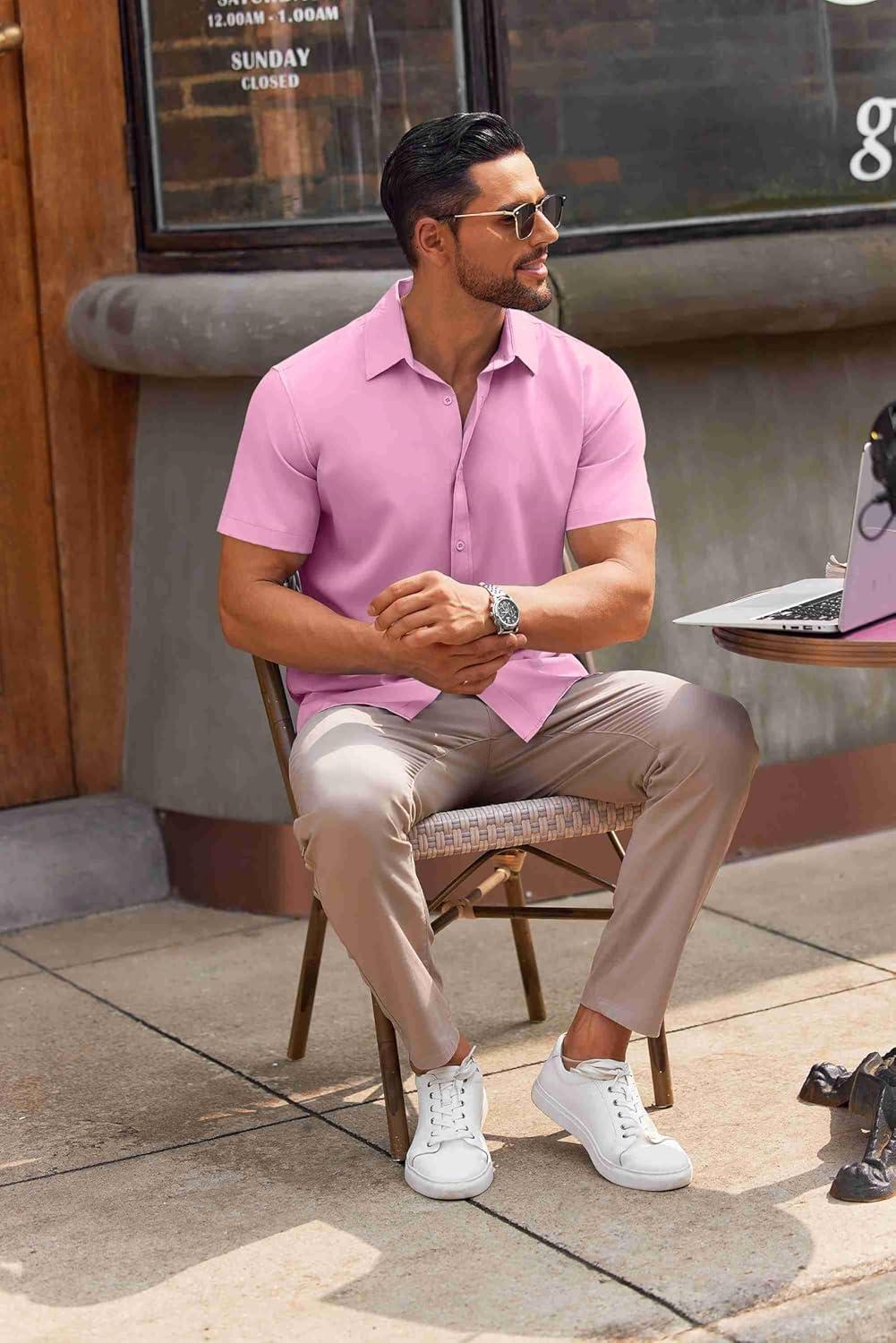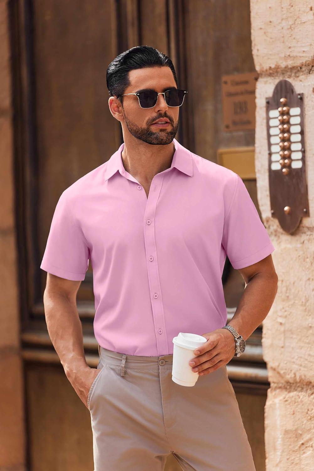 COOFANDY Mens Short Sleeve Button Down Shirt Lightweight Wrinkle Free Untucked Dress Shirts(Light Pink)