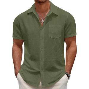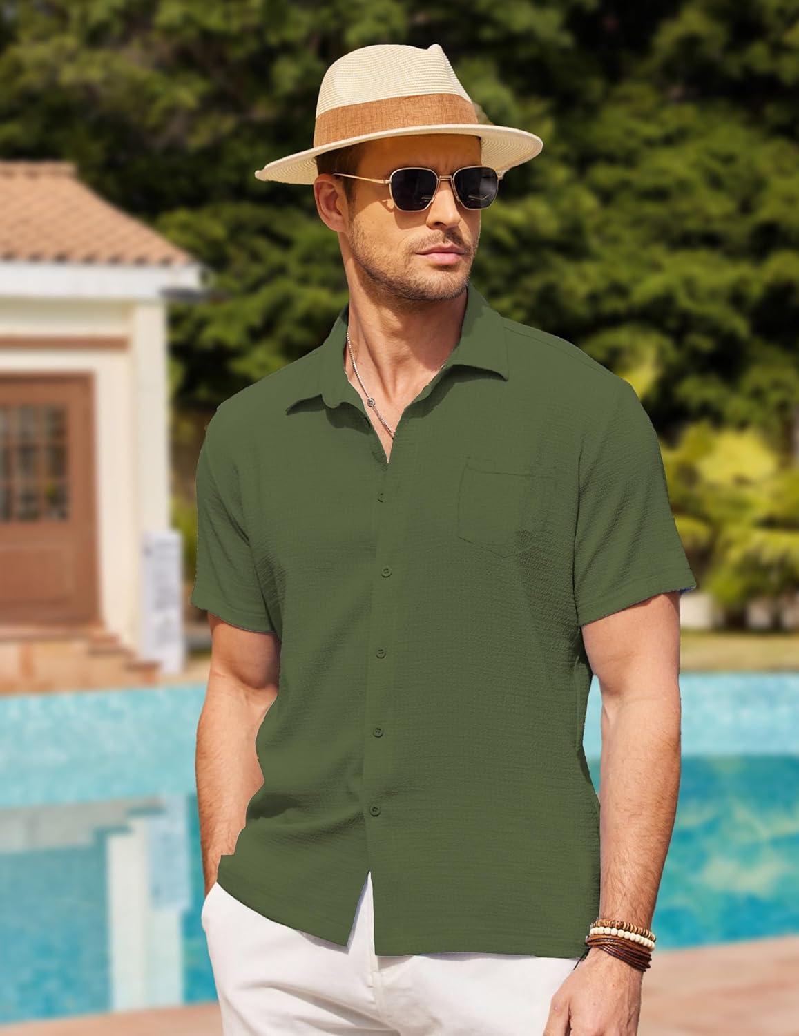 COOFANDY Men’s Casual Button Down Shirts Short Sleeve Textured Summer Beach Shirts(Army Green)