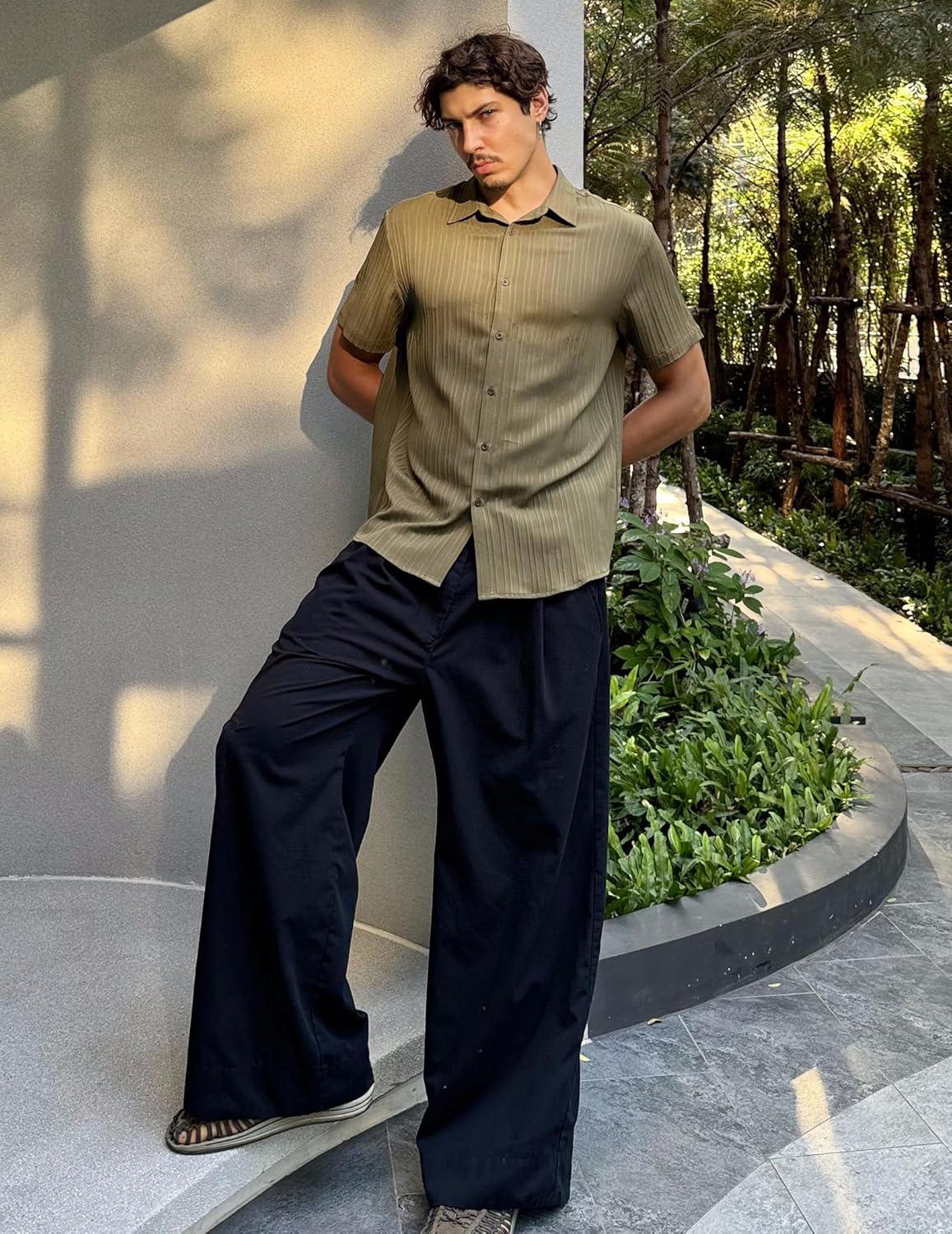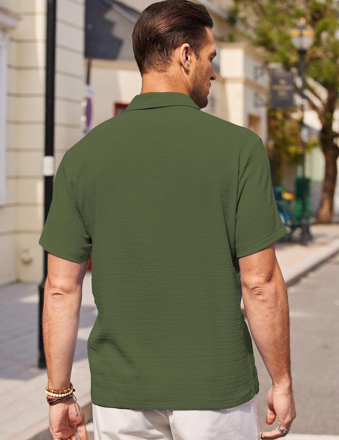 COOFANDY Men’s Casual Button Down Shirt Short Sleeve Textured Summer Cuban Beach Shirts(Army Green)
