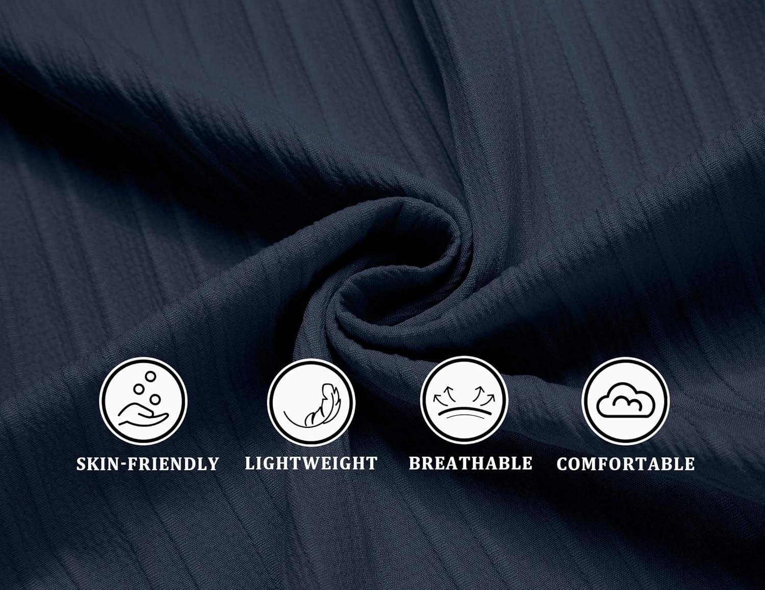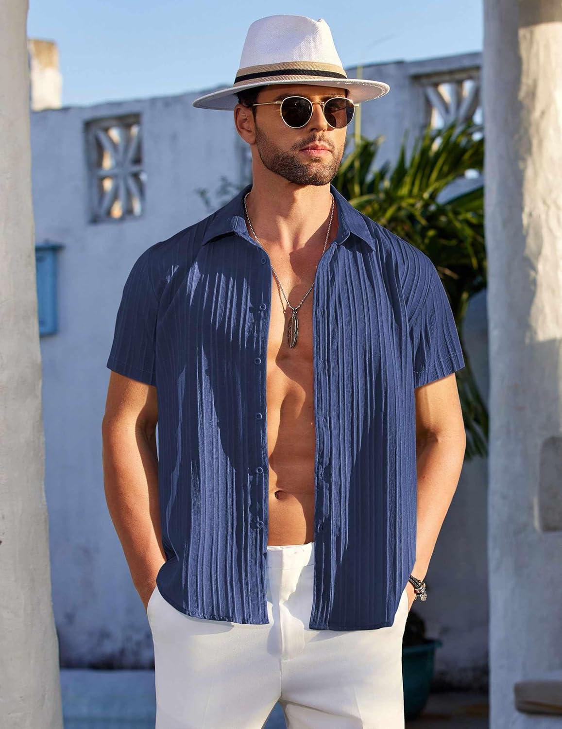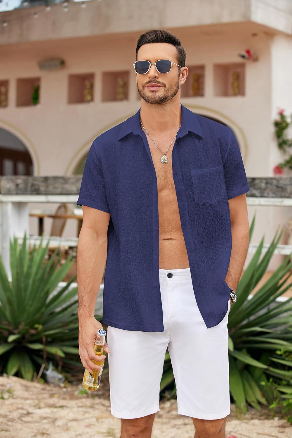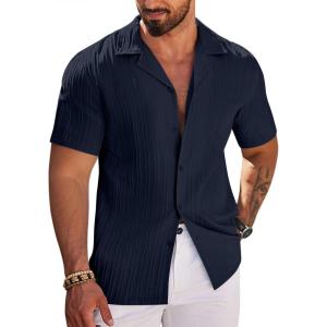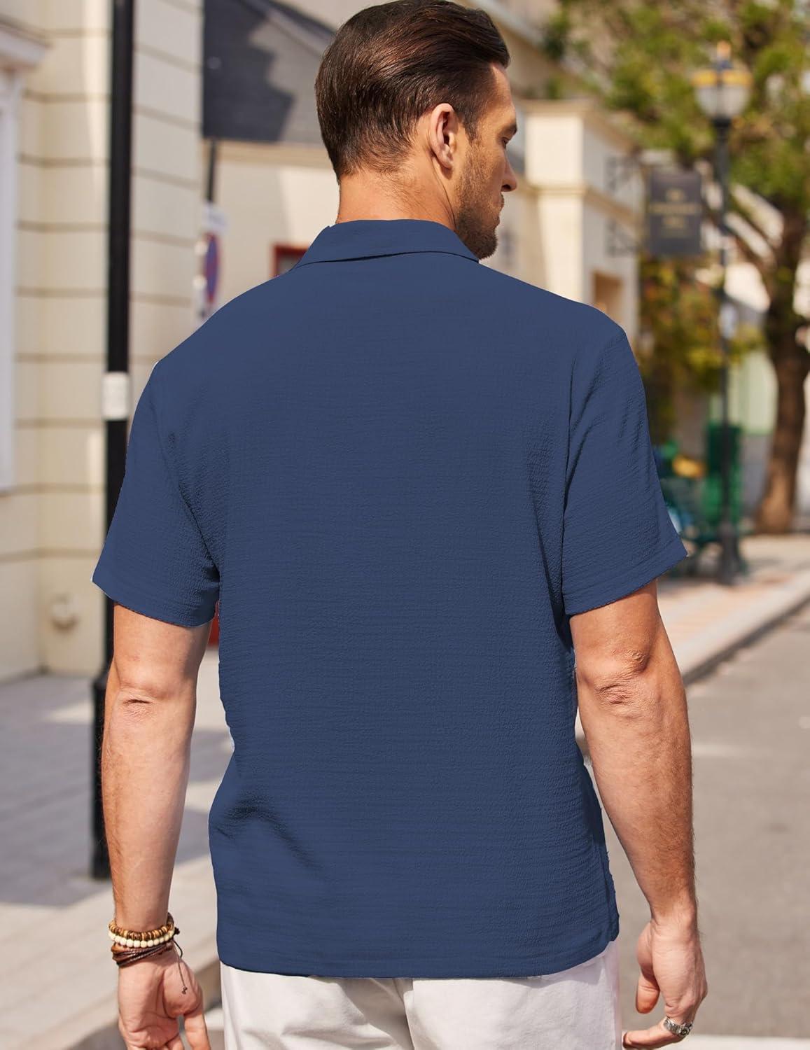 COOFANDY Men’s Casual Button Down Shirts Short Sleeve Textured Summer Beach Shirts(Dark Blue)
