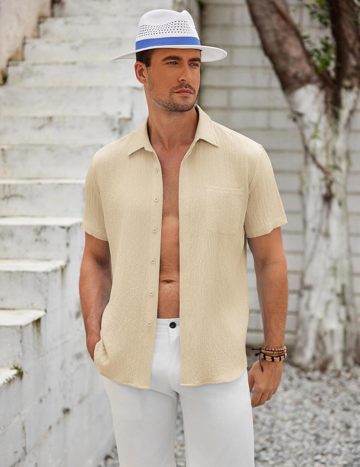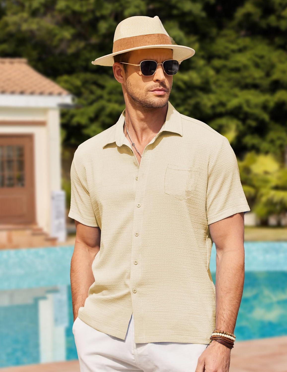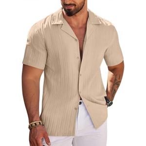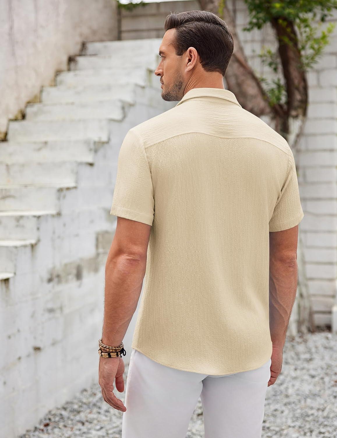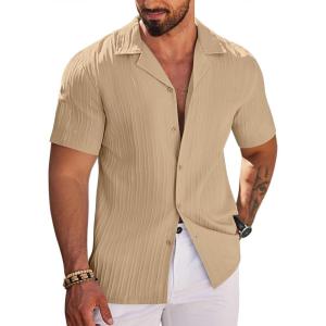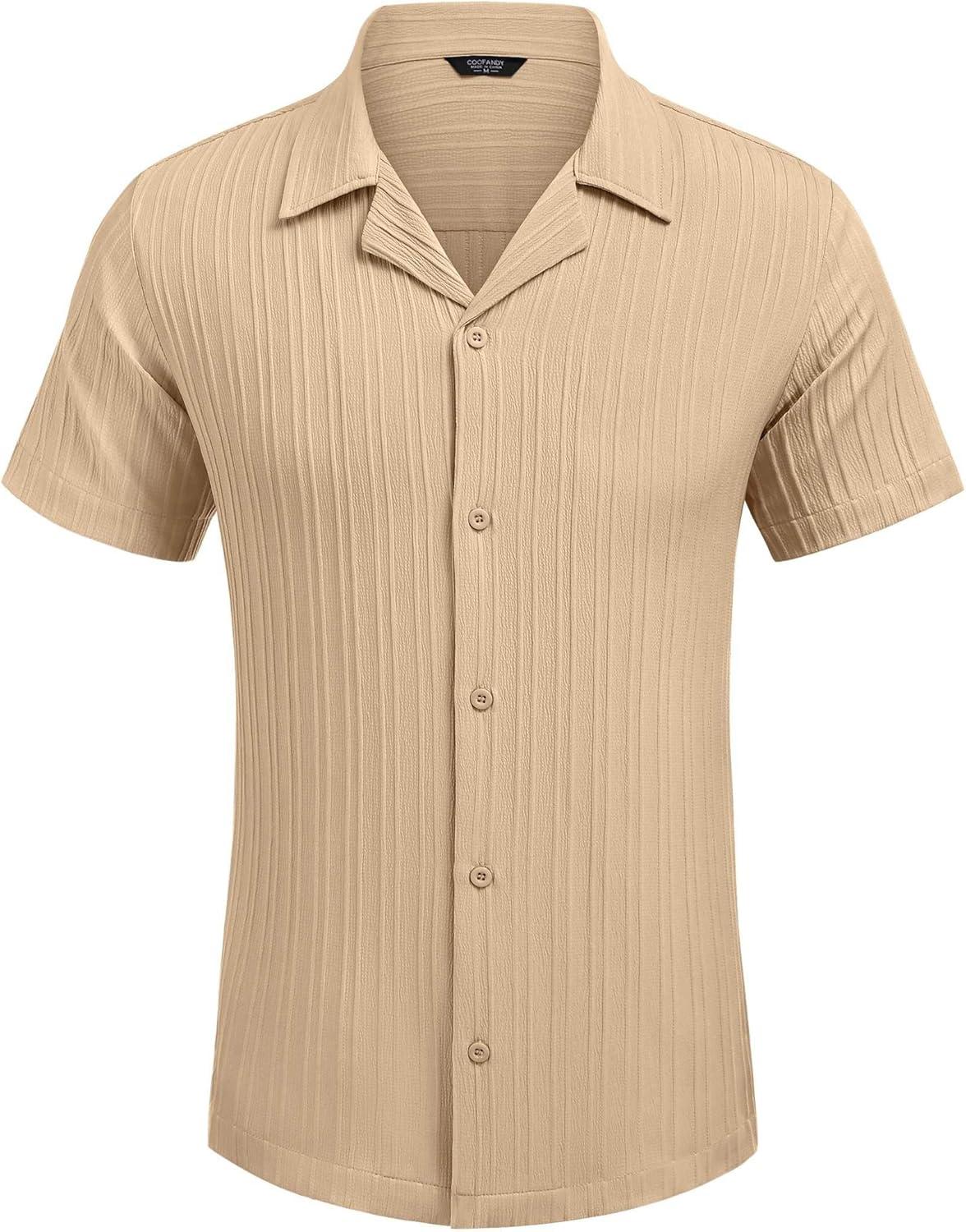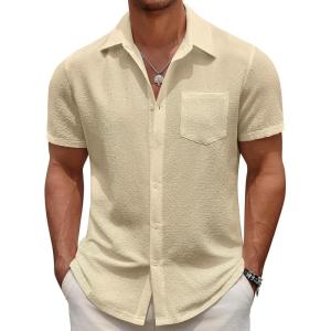 COOFANDY Men’s Casual Button Down Shirts Short Sleeve Textured Summer Beach Shirts(Beige)