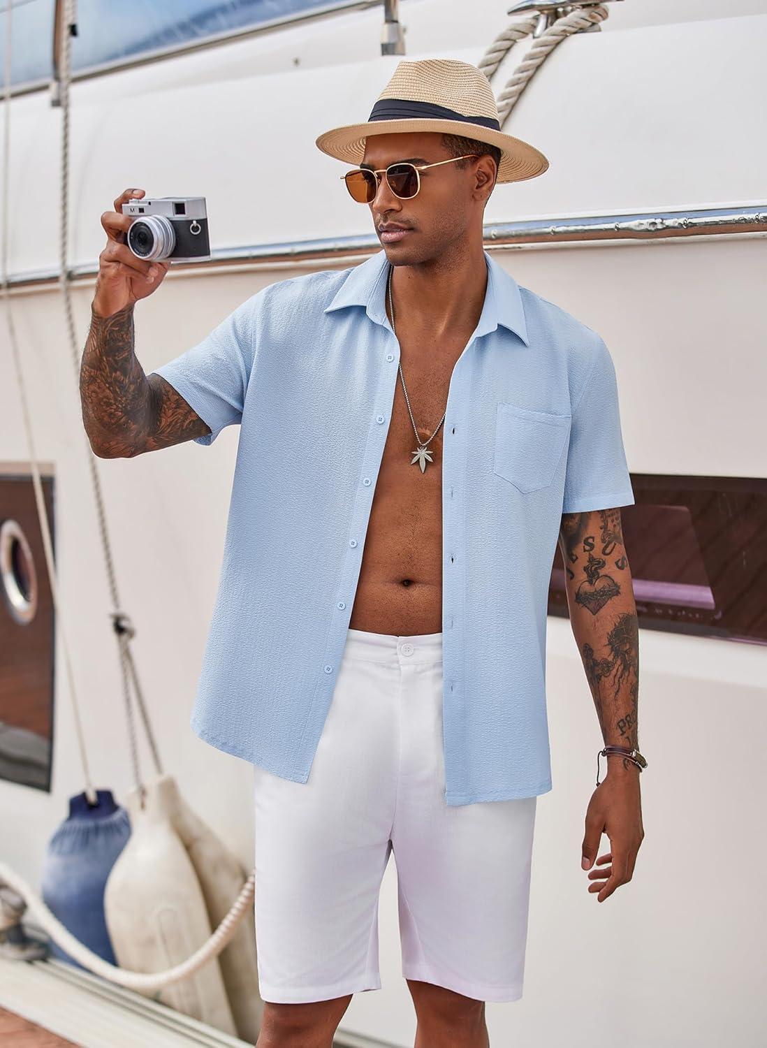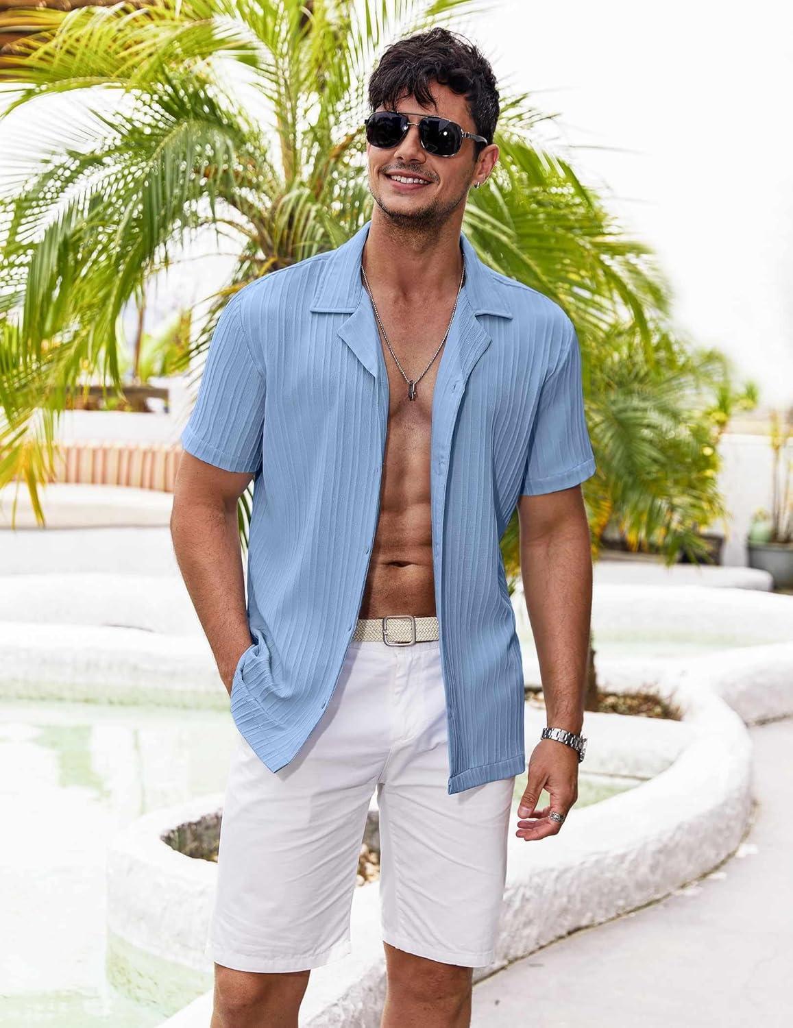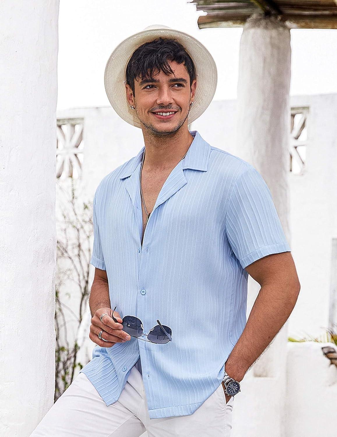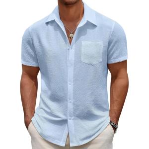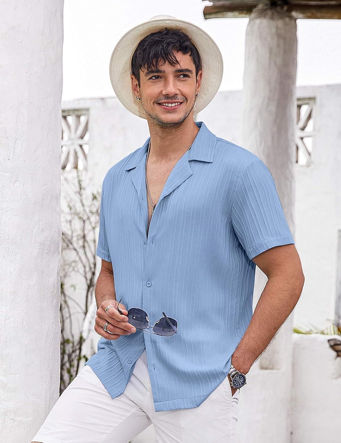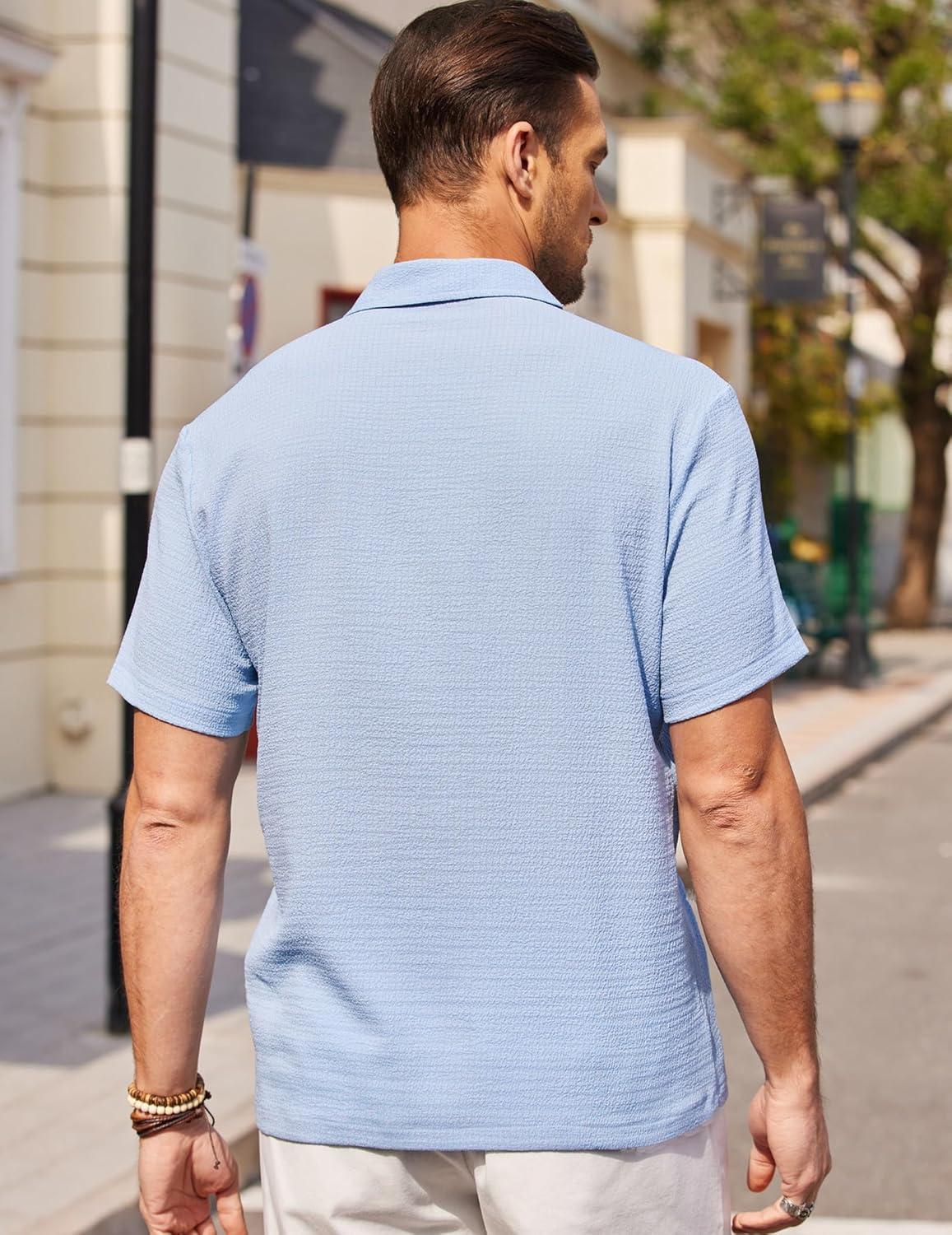 COOFANDY Men’s Casual Button Down Shirts Short Sleeve Textured Summer Beach Shirts(Light Blue)