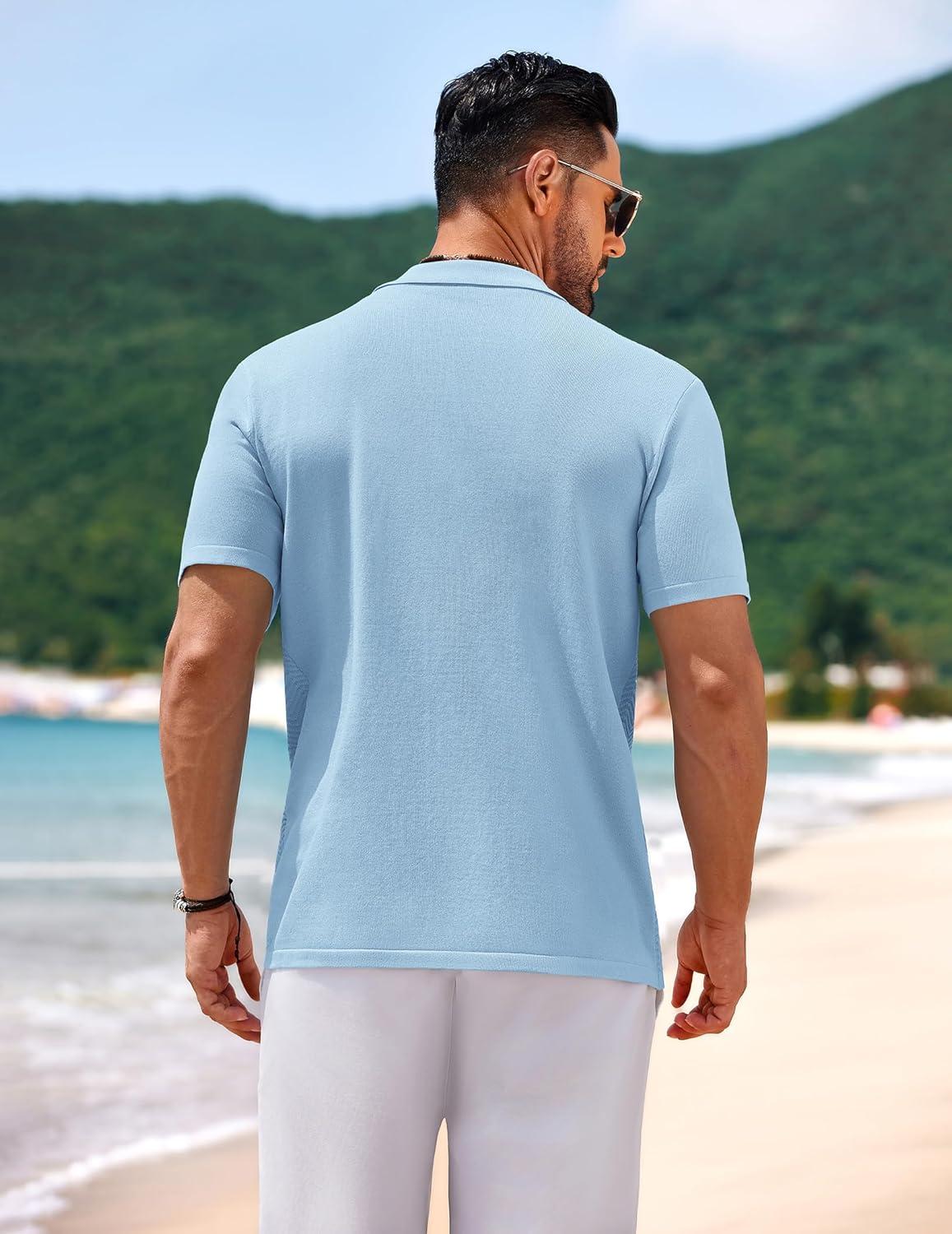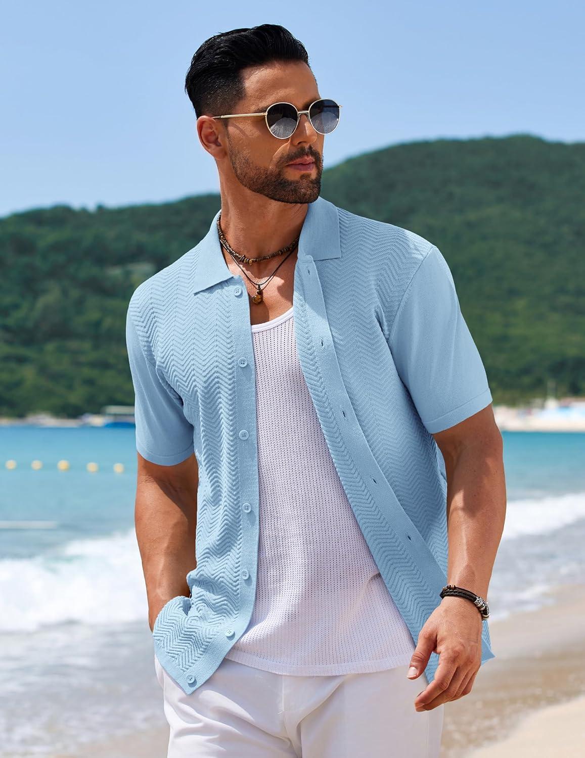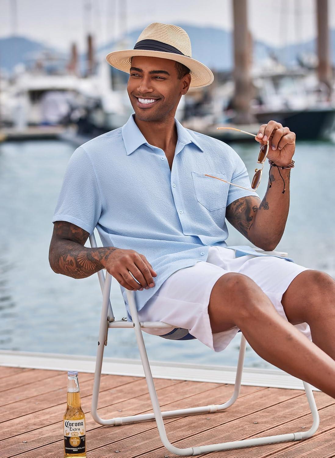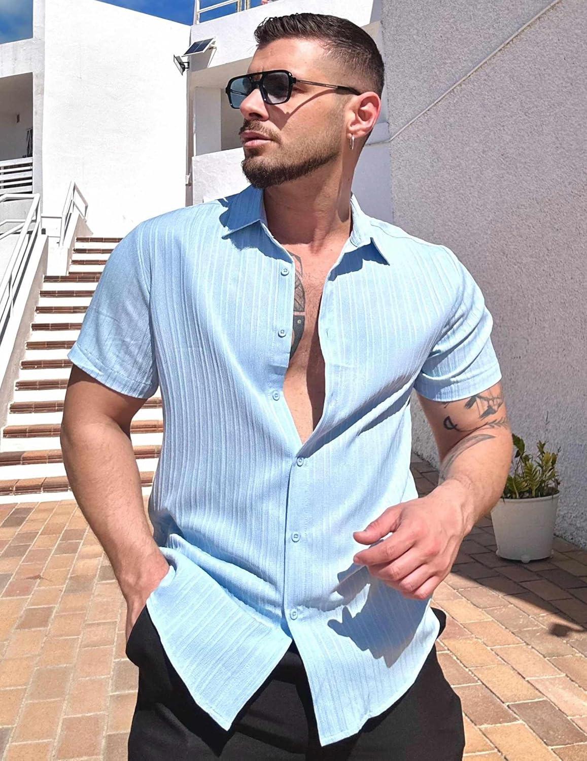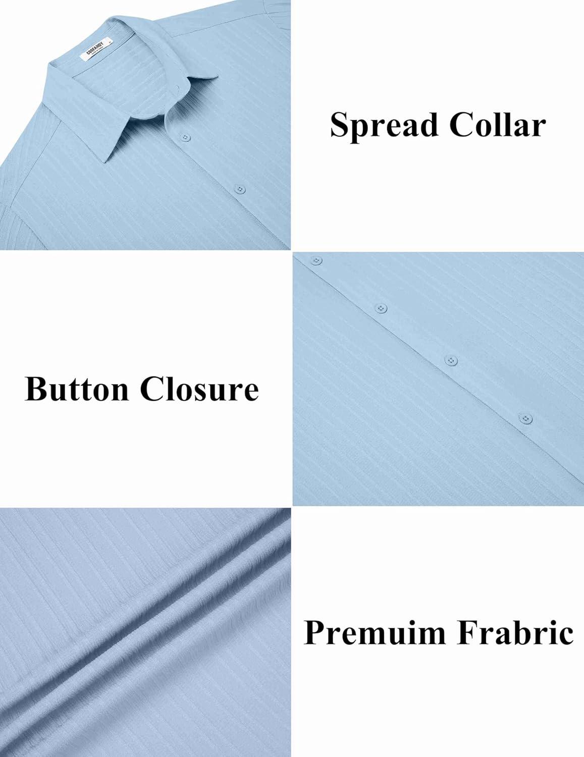 COOFANDY Men’s Casual Button Down Shirts Short Sleeve Textured Summer Beach Shirts(Light Blue)