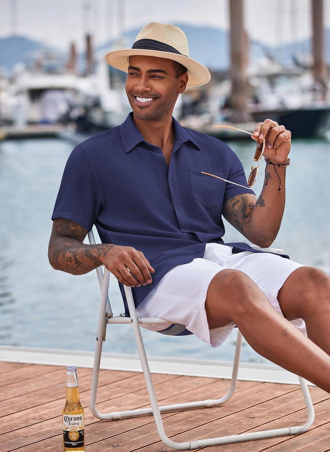 COOFANDY Men’s Button Down Shirts Short Sleeve Casual Summer Beach Shirts Vacation Wedding Shirts(Captain Blue)