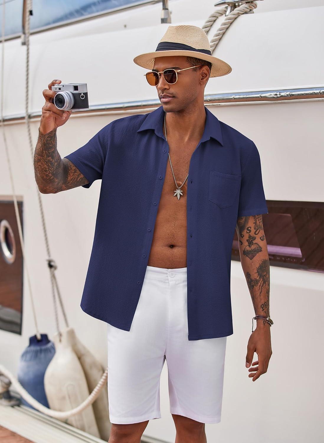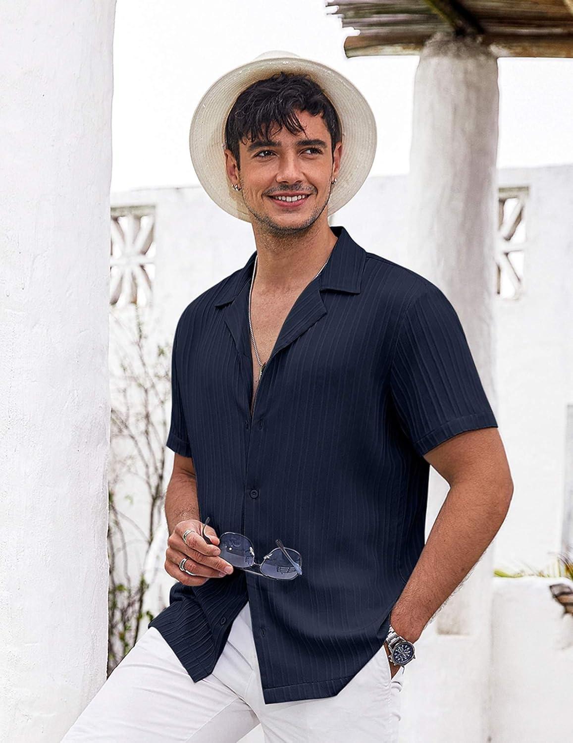 COOFANDY Men’s Casual Button Down Shirts Short Sleeve Regular Fit Fashion Camp Beach Shirts Tops(Navy Blue)