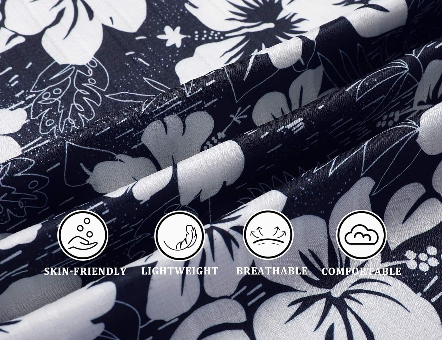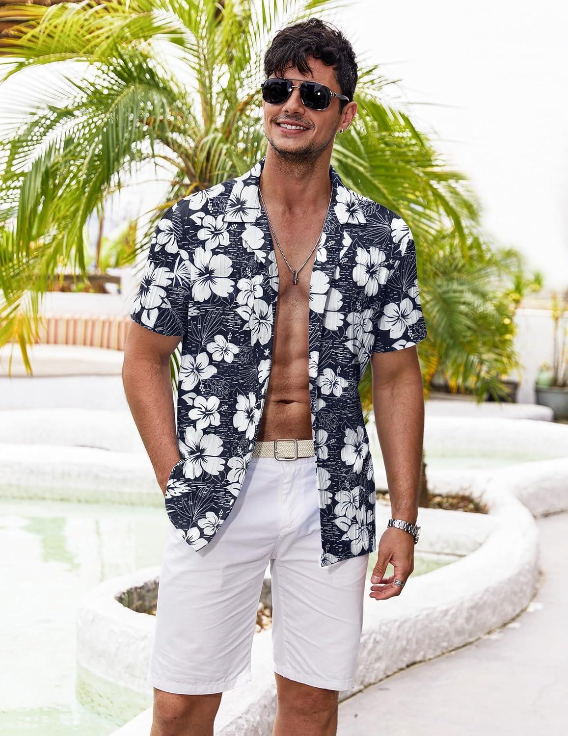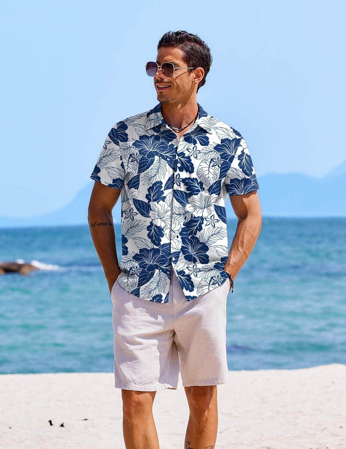 COOFANDY Mens Hawaiian Shirt Short Sleeve Buttoon Down Shirts Casual Tropical Floral Summer Linen Shirts(A- Navy Shark)