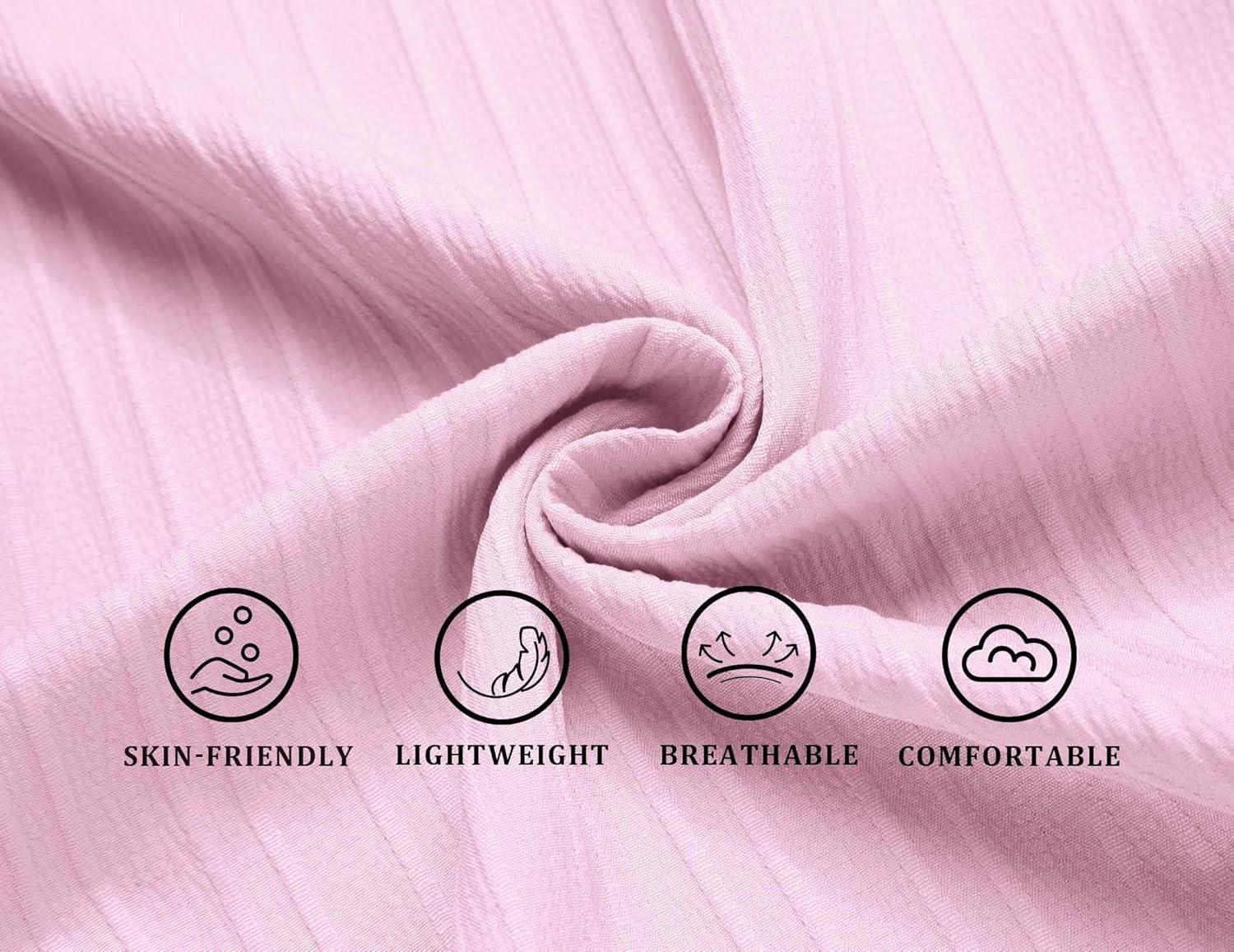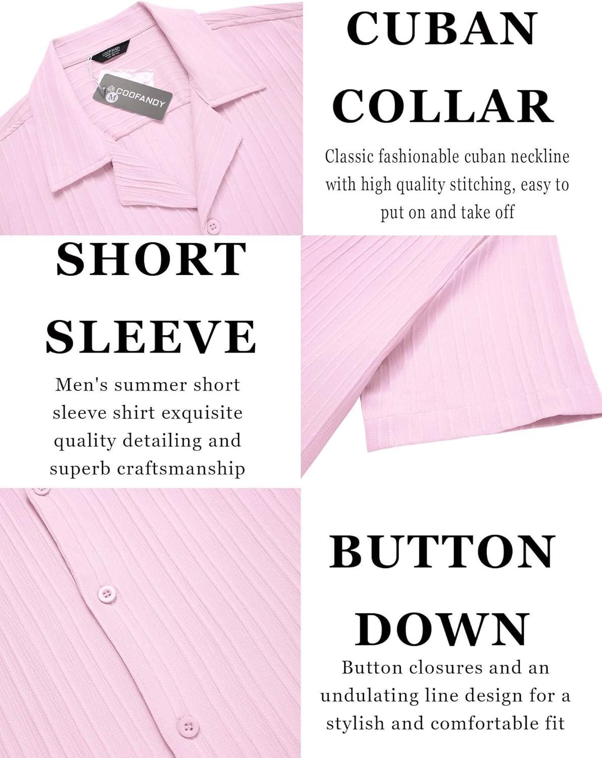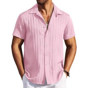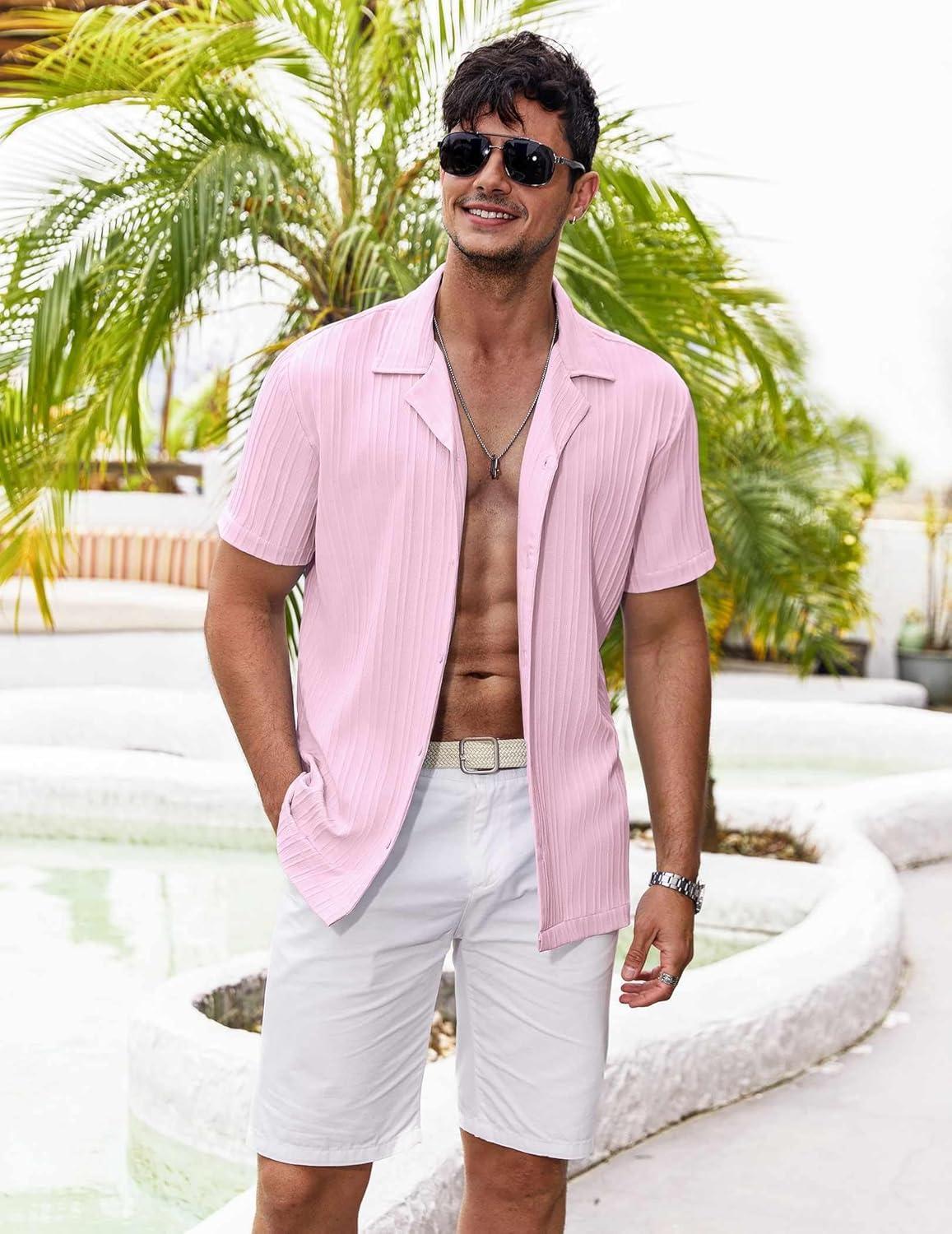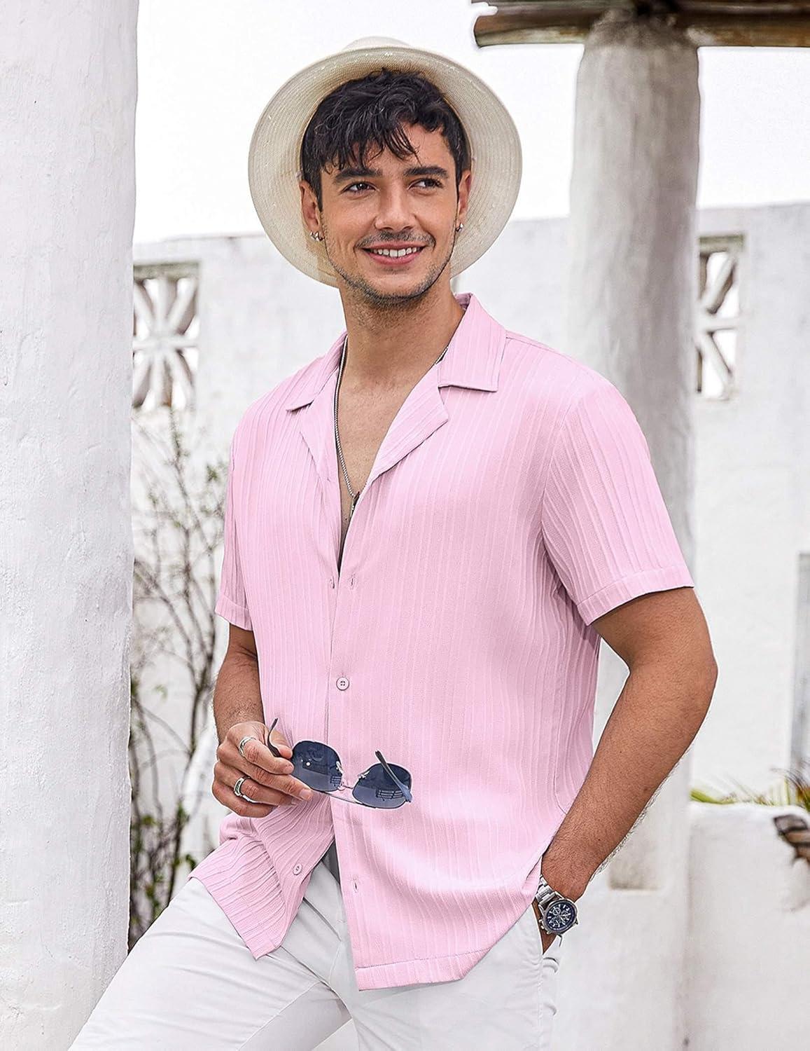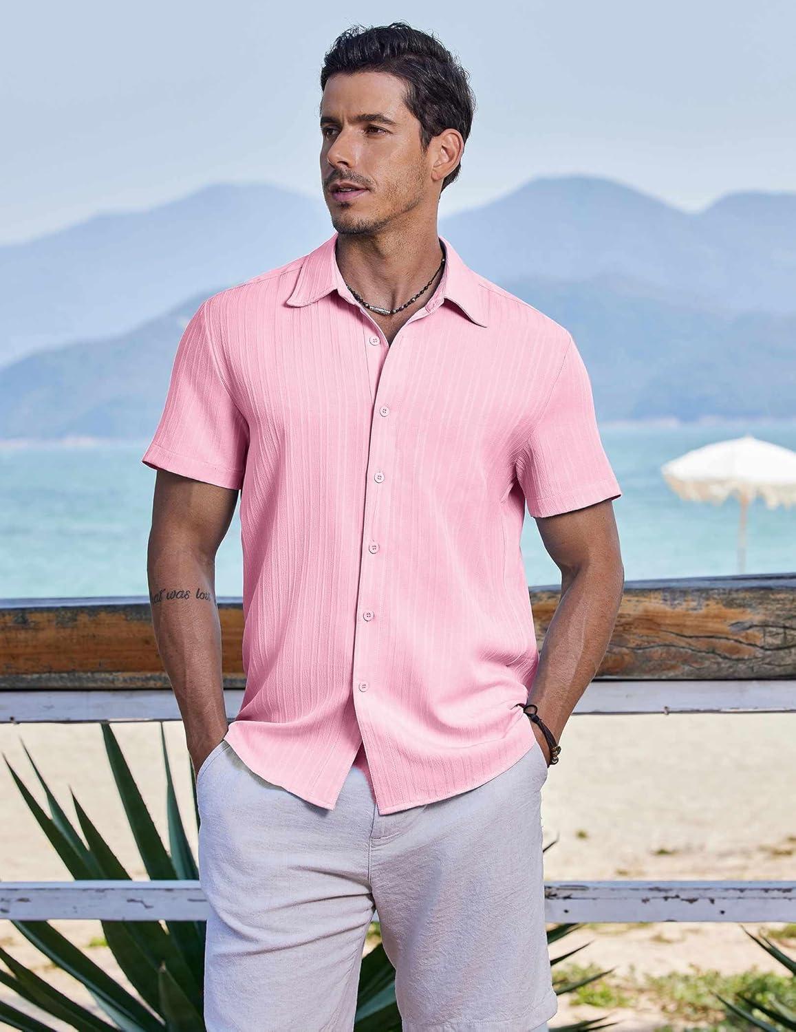 COOFANDY Men’s Casual Button Down Shirt Short Sleeve Textured Summer Cuban Beach Shirts(Pink)