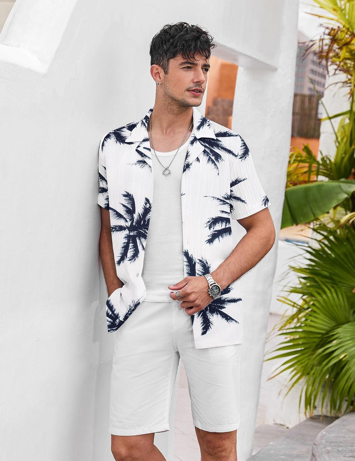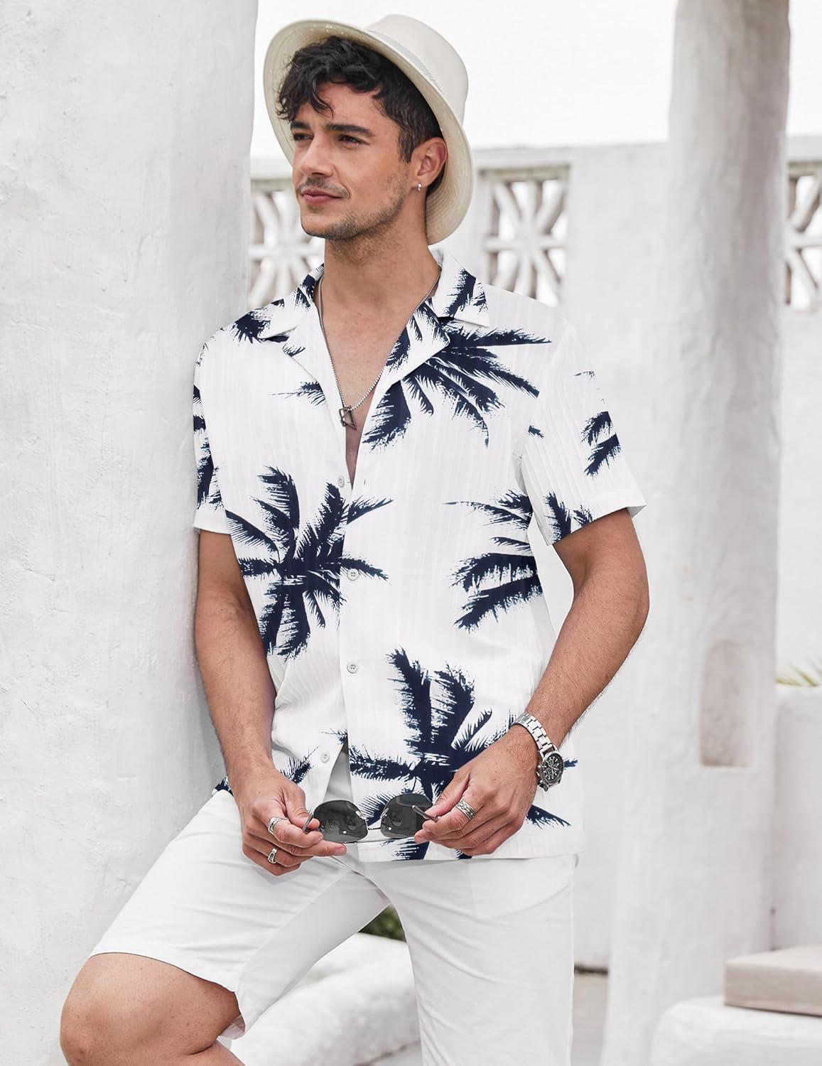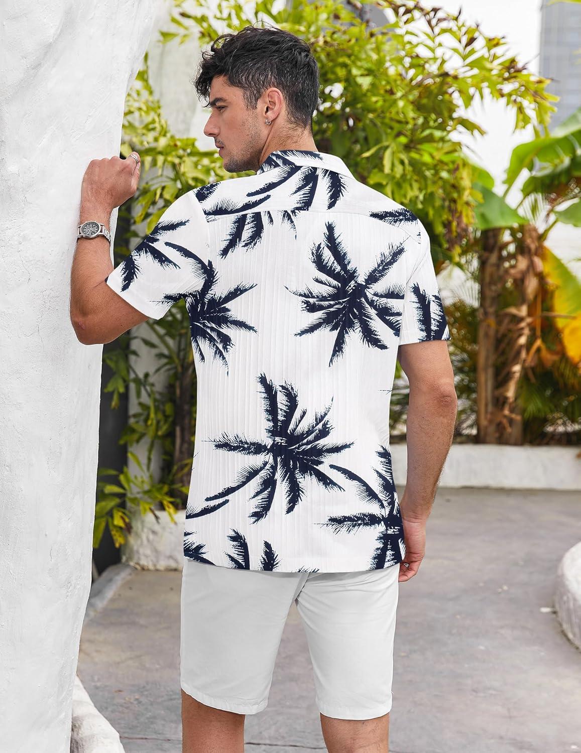 COOFANDY Men’s Casual Button Down Shirts Short Sleeve Textured Summer Beach Shirts(Blue-coconut Tree)