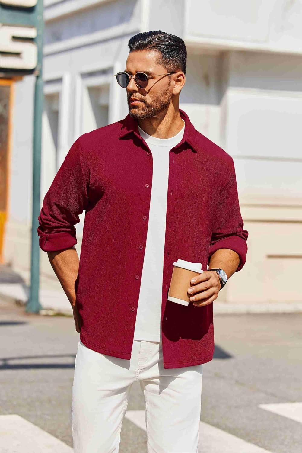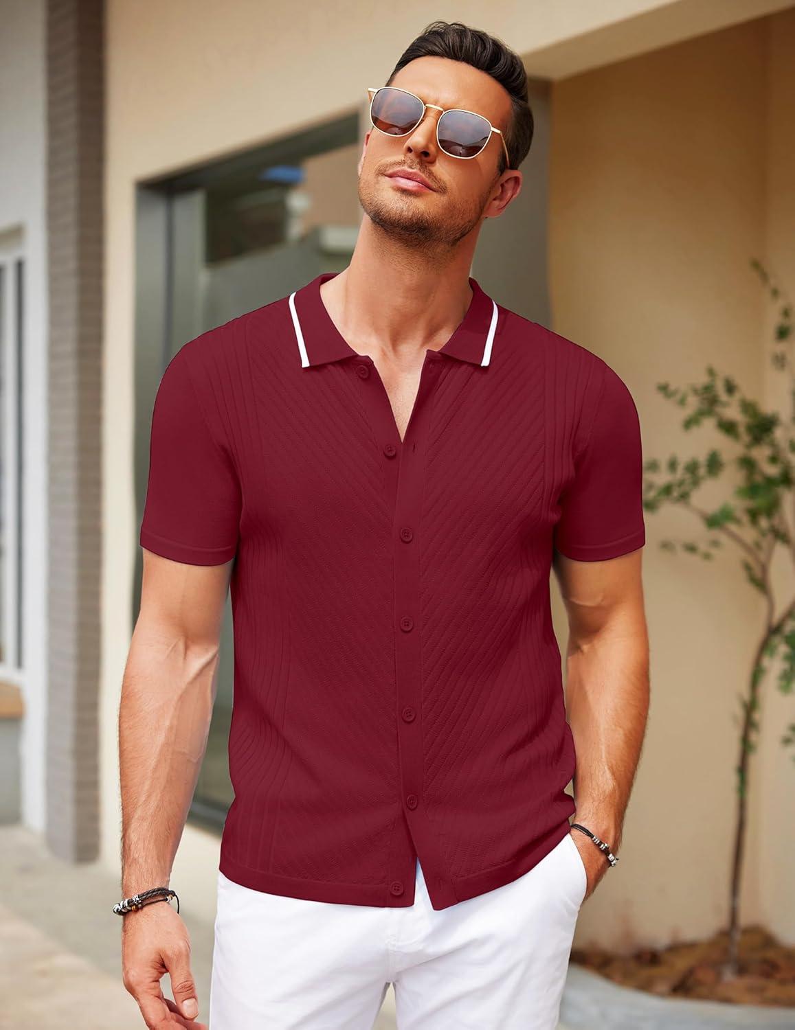COOFANDY Men’s Button Down Shirts Short Sleeve Casual Summer Beach Shirts Vacation Wedding Shirts(Wine Red)