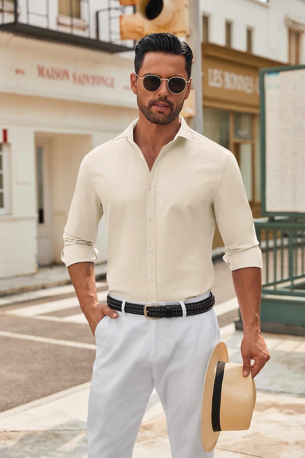 COOFANDY Men’s Casual Button Down Shirt Long Sleeve Wrinkle Free Shirts Loose fit Shirt Textured Stretch Shirts with Pocket(White)