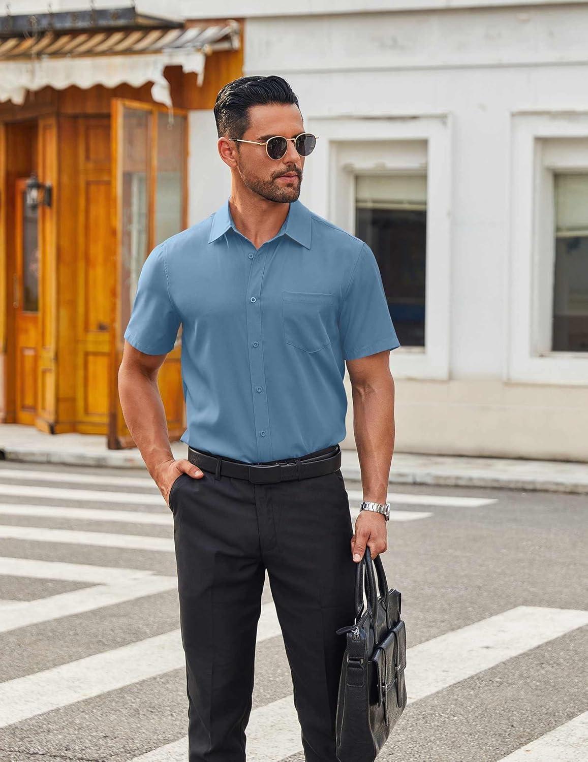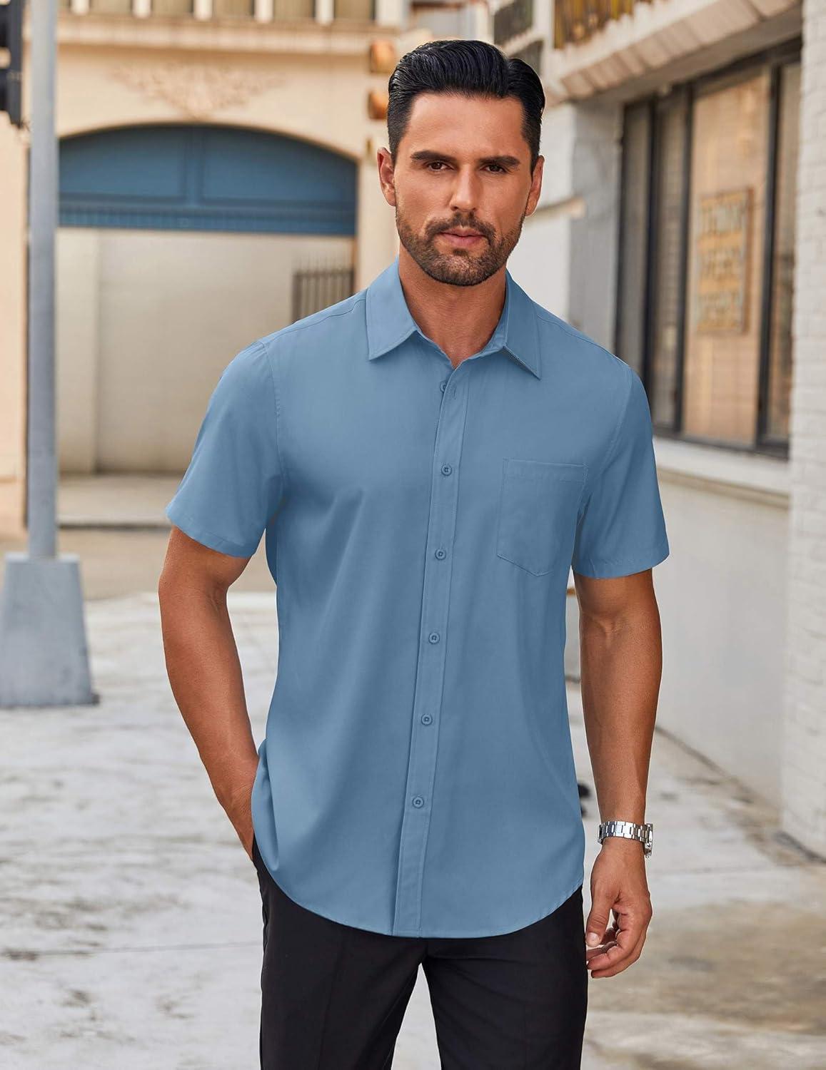 COOFANDY Mens Short Sleeve Button Down Shirts Casual Dress Shirts for Men Summer Untucked Shirts with Pocket(Lake Blue)