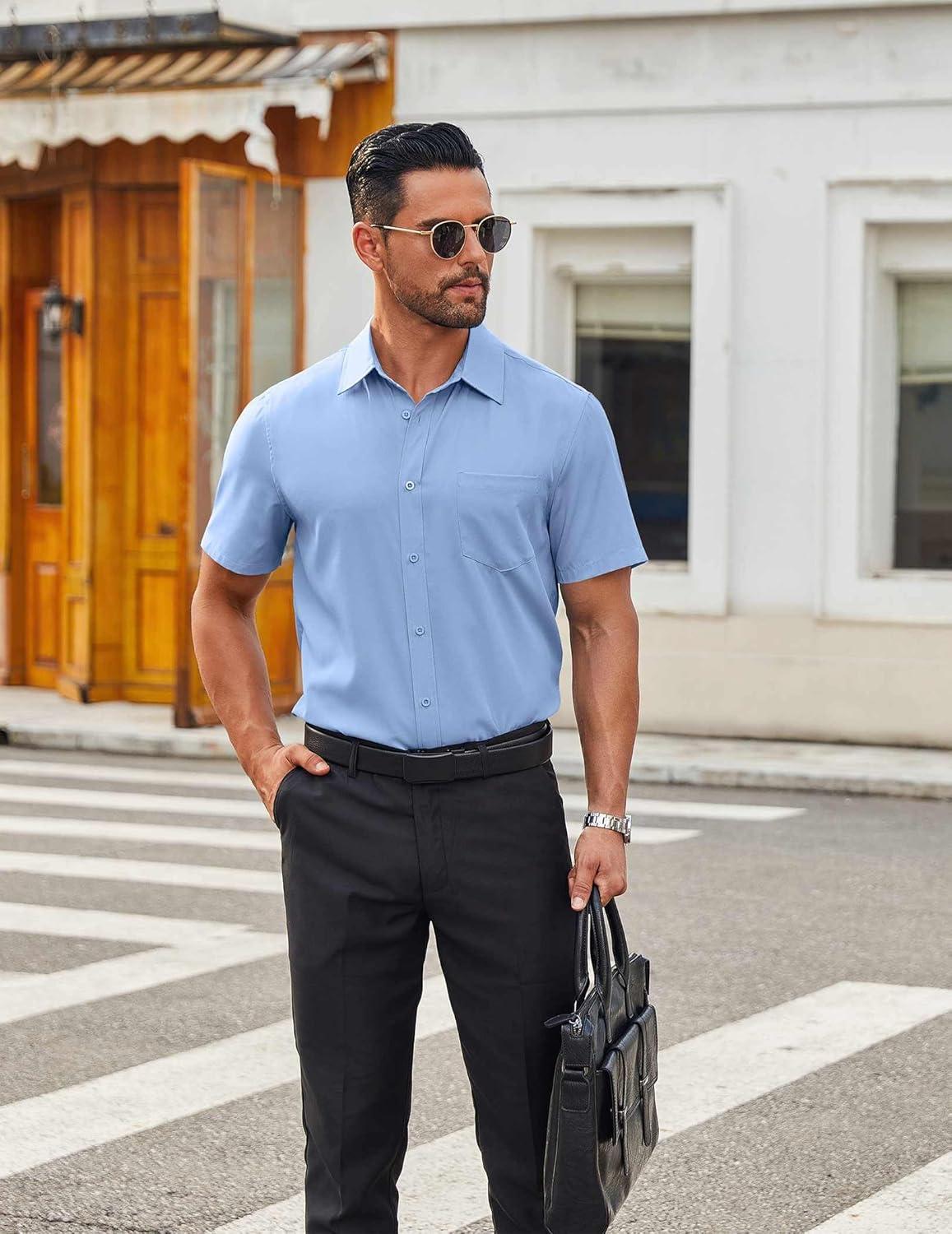 COOFANDY Mens Short Sleeve Button Down Shirts Casual Dress Shirts for Men Summer Untucked Shirts with Pocket(Light Blue)
