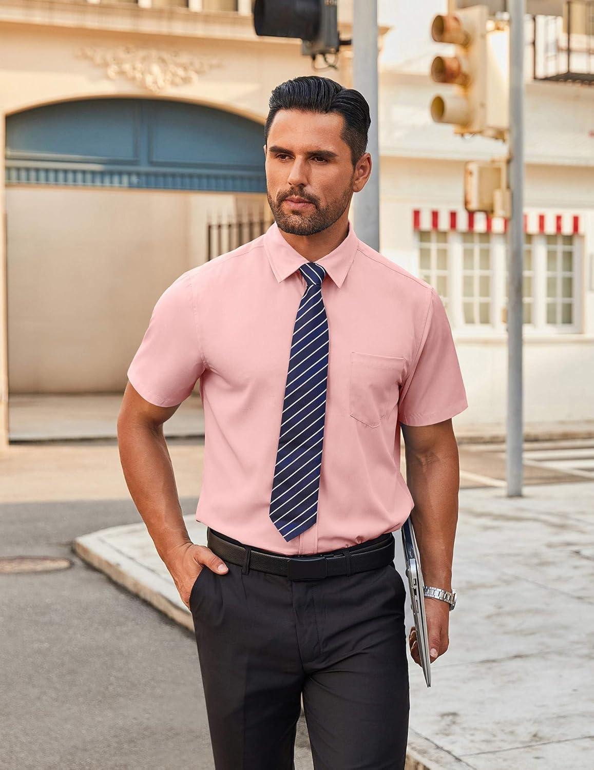 COOFANDY Mens Short Sleeve Button Down Shirts Casual Wrinkle Free Dress Shirt Plaid Collar Summer Shirts(Pink(stripe))