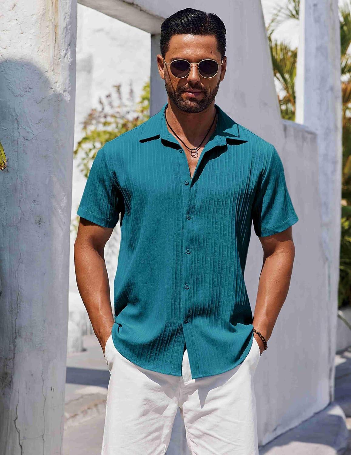 COOFANDY Mens Short Sleeve Button Down Shirts Casual Dress Shirts for Men Summer Untucked Shirts with Pocket(Teal)