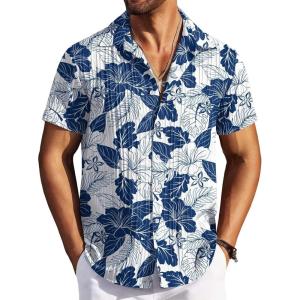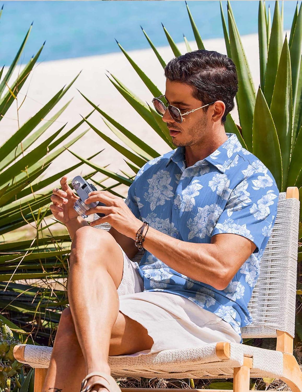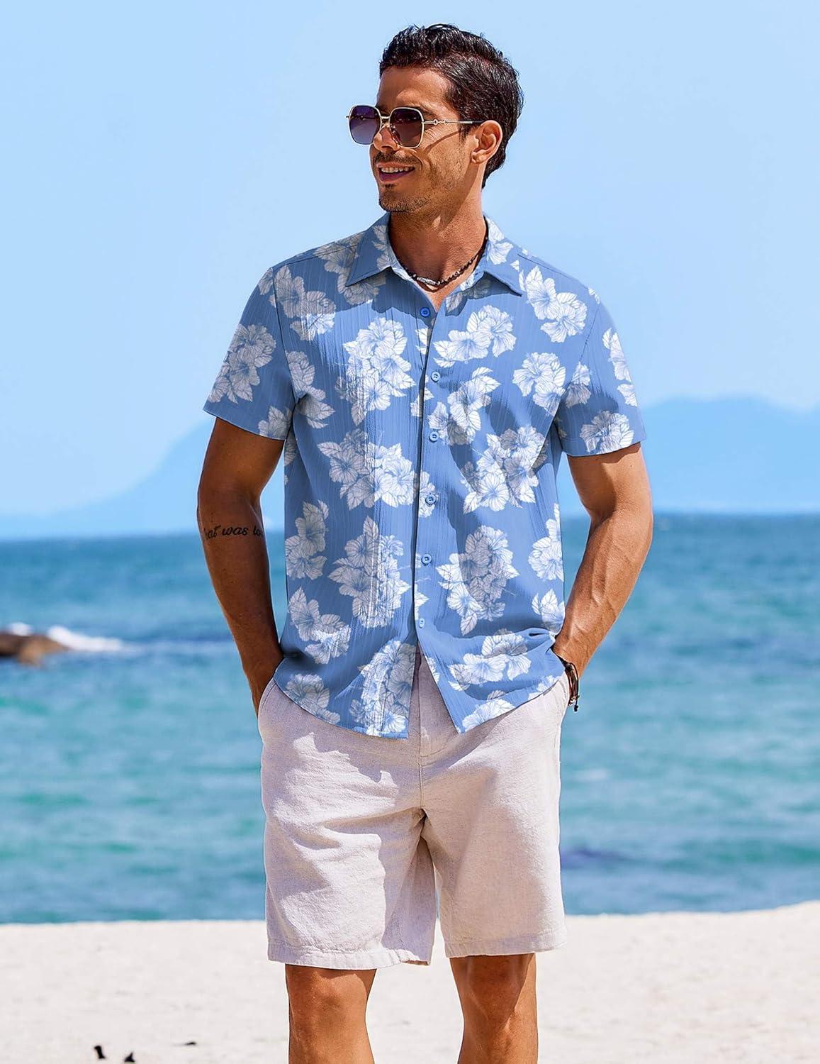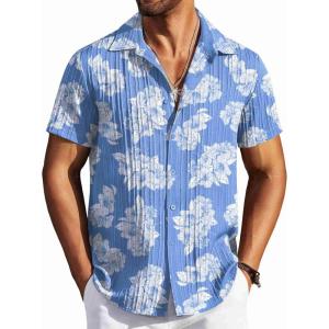 COOFANDY Men’s Casual Button Down Shirts Short Sleeve Textured Summer Beach Shirts(Light Blue – White Floral)