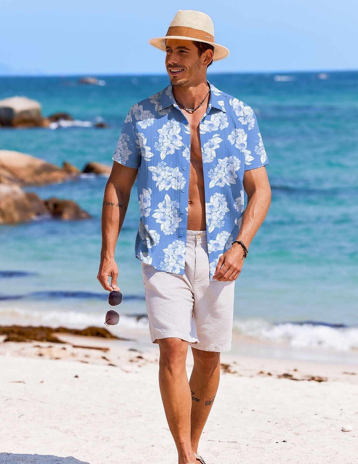 COOFANDY Mens Hawaiian Shirt Short Sleeve Buttoon Down Shirts Casual Tropical Floral Summer Linen Shirts(A- Sky Blue)