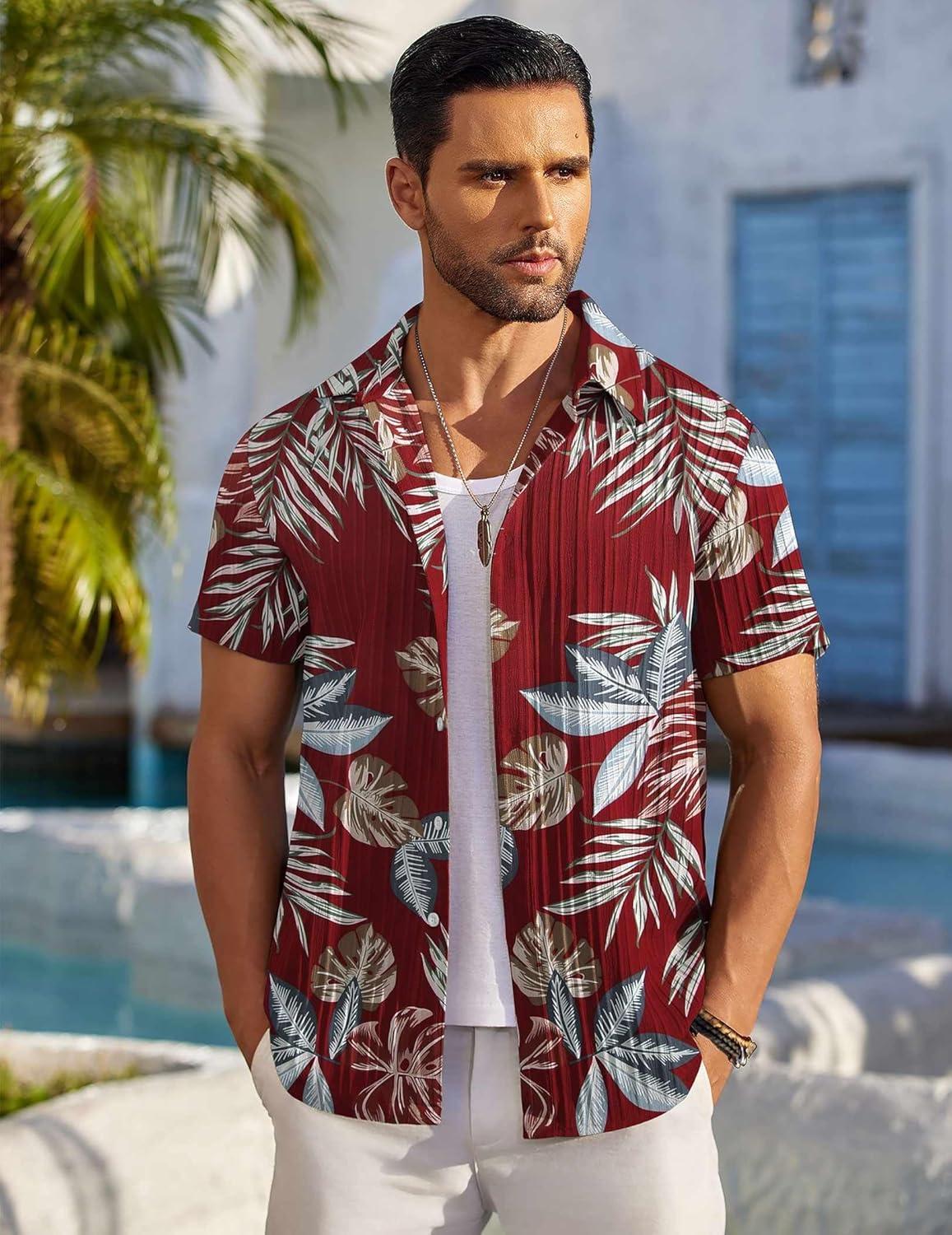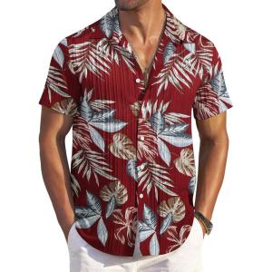 COOFANDY Men’s Casual Button Down Shirt Short Sleeve Textured Summer Cuban Beach Shirts(Island Sunset-red)