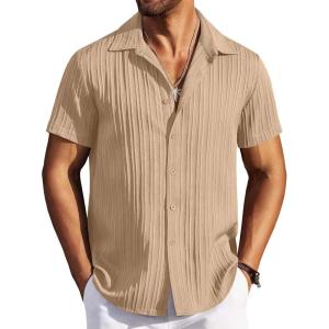 COOFANDY Men’s Casual Button Down Shirts Short Sleeve Textured Summer Beach Shirts(Khaki)