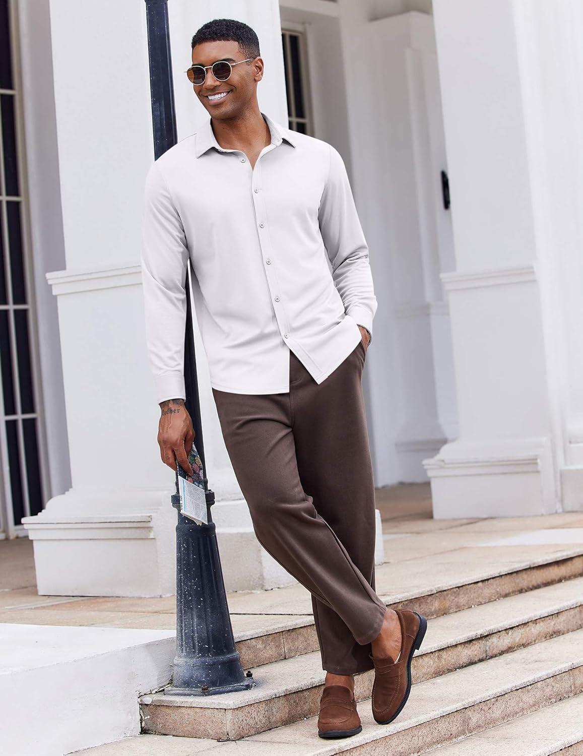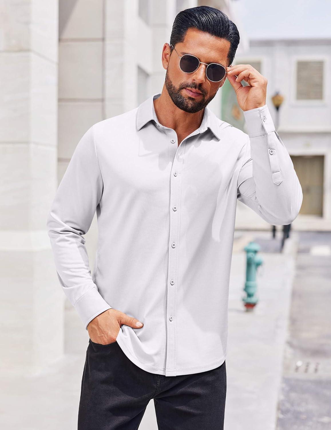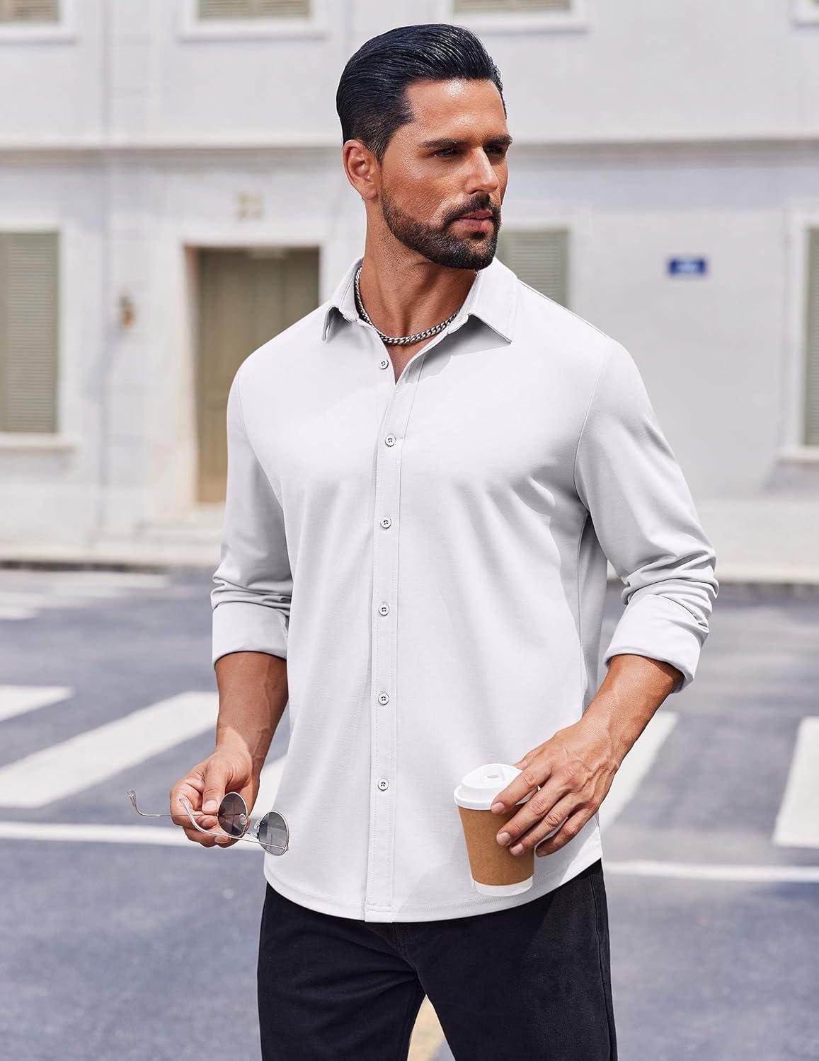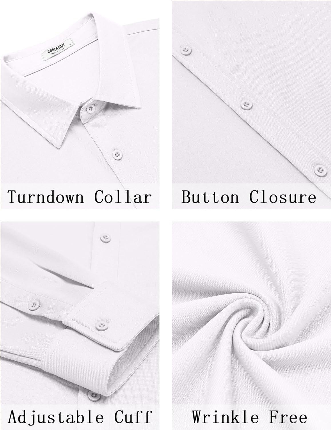 COOFANDY Mens Casual Button Down Shirt Long Sleeve Wrinkle Free Shirts Stretch Dress Shirt(White)