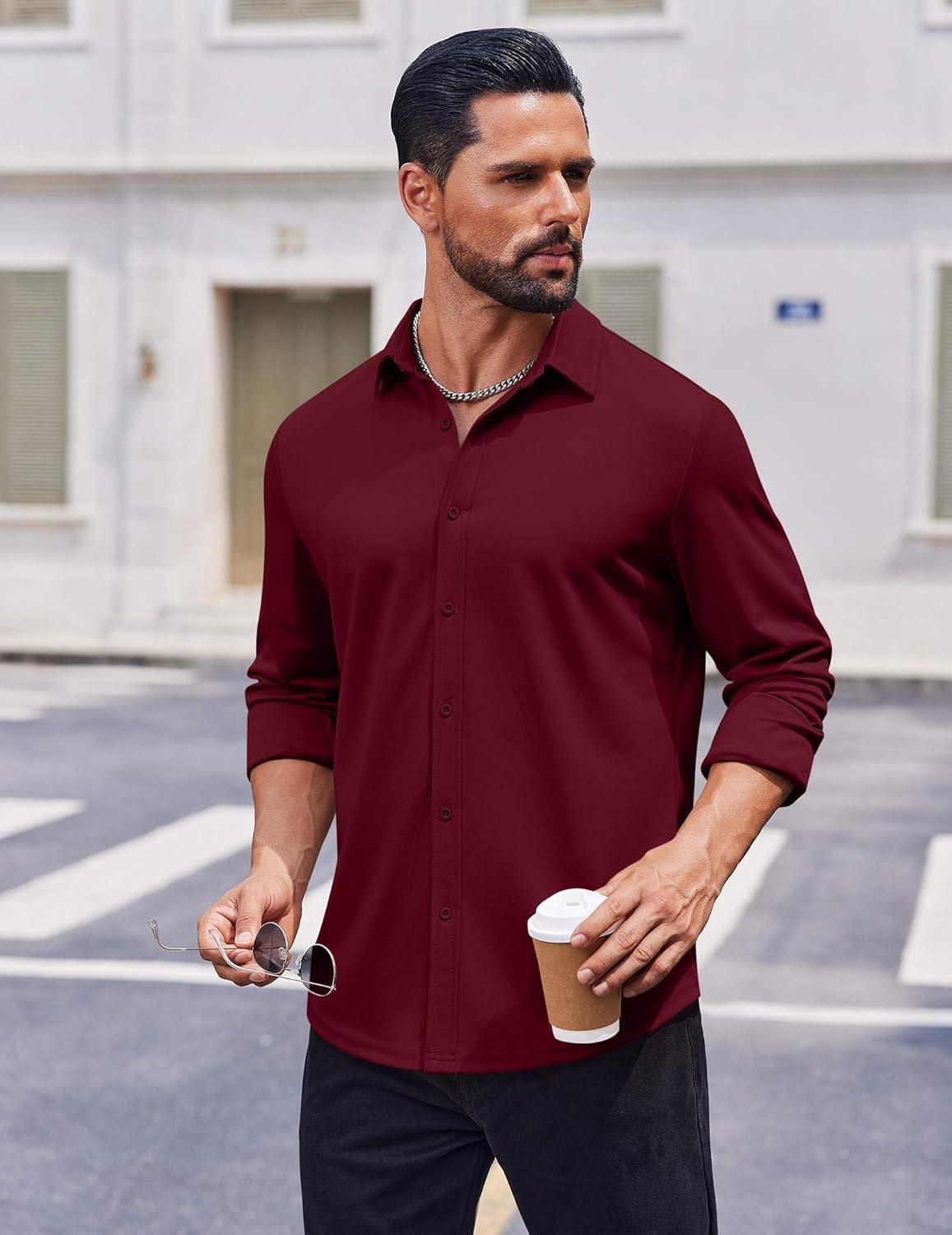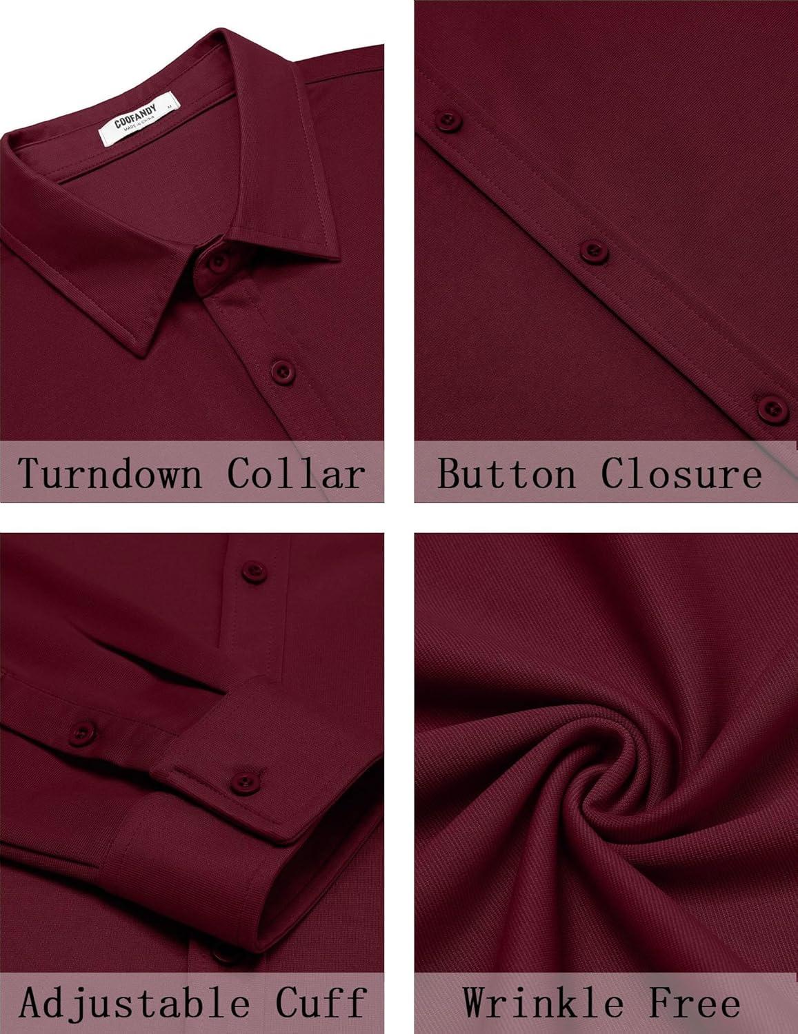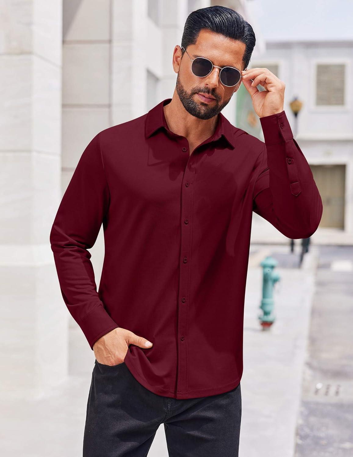 COOFANDY Mens Casual Button Down Shirt Long Sleeve Wrinkle Free Shirts Stretch Dress Shirt(Wine Red)