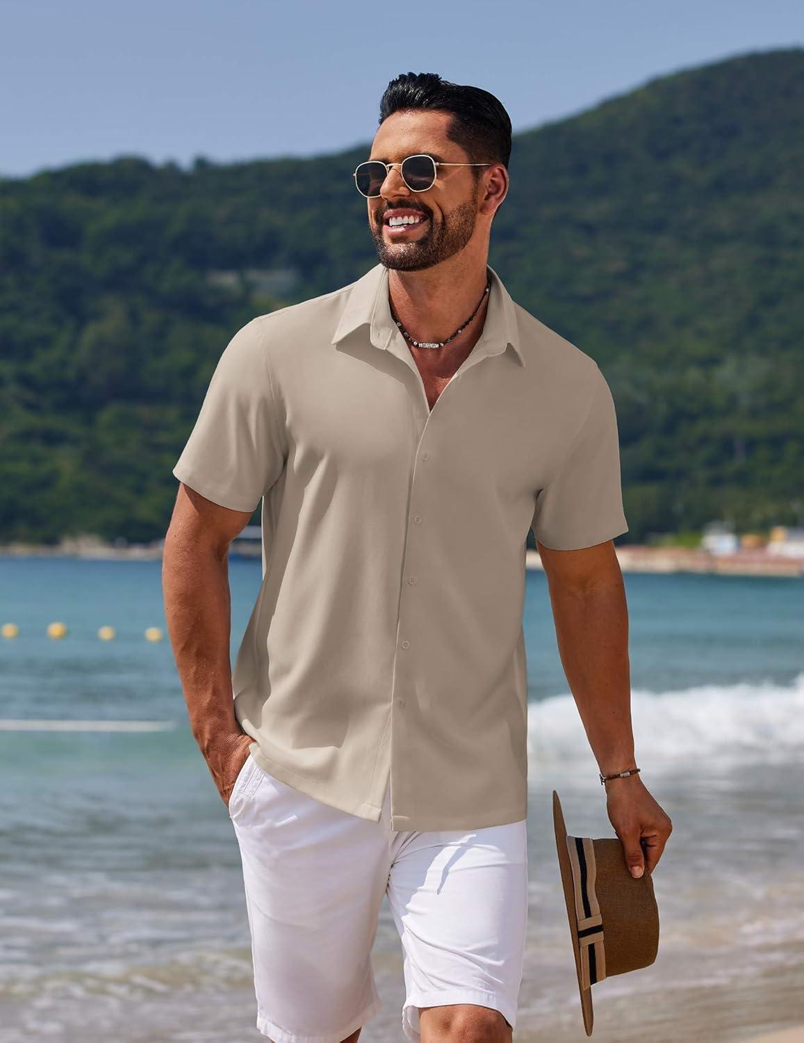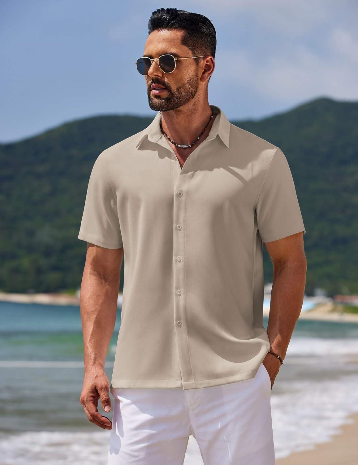 COOFANDY Mens Casual Short Sleeve Button Down Shirts Summer Untucked Wrinkle Free Shirts(Light Khaki)
