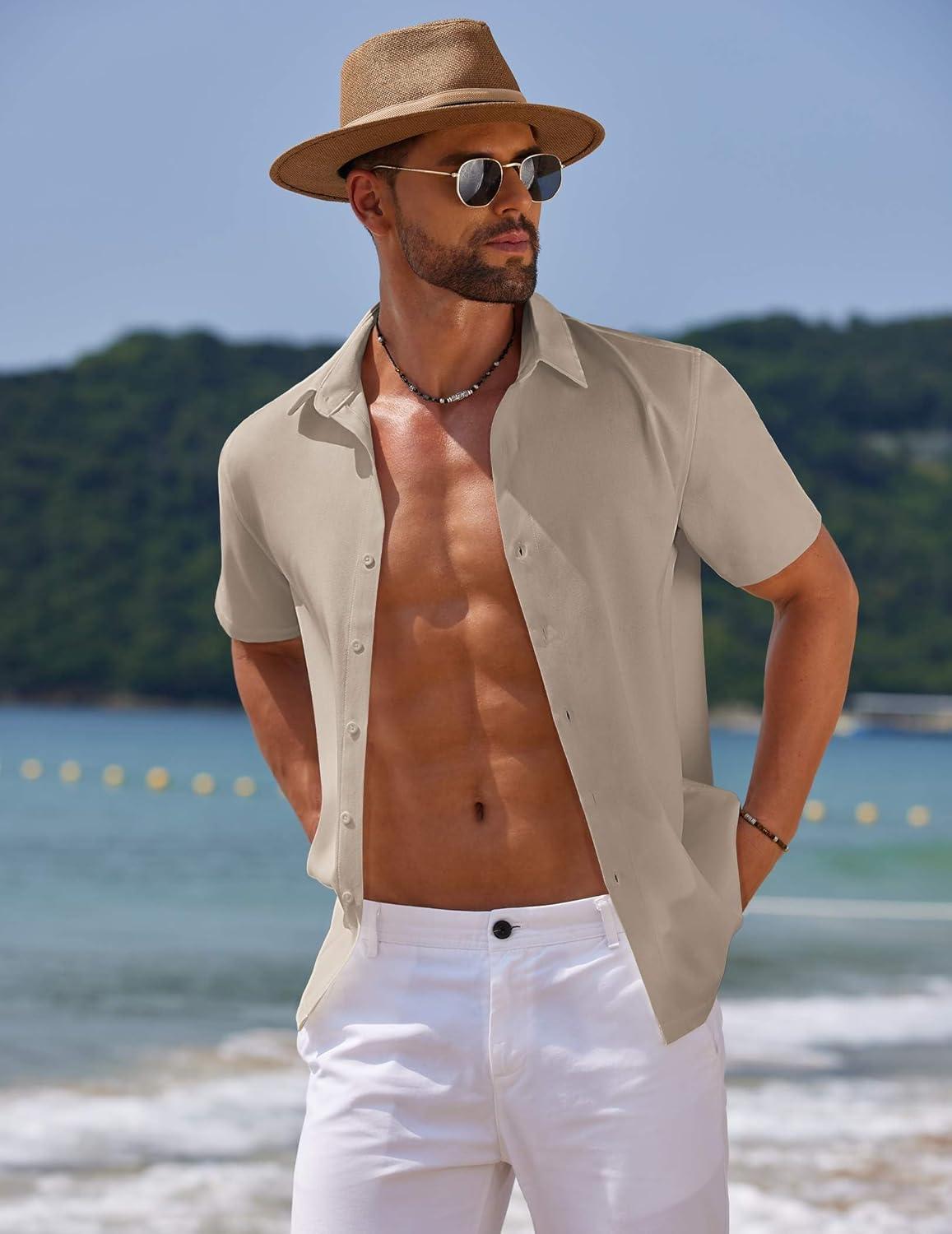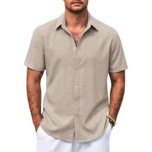 COOFANDY Mens Casual Summer Beach Shirt Button Down Short Sleeve Shirts Vacation Shirt Cotton Linen Shirts(Khaki)