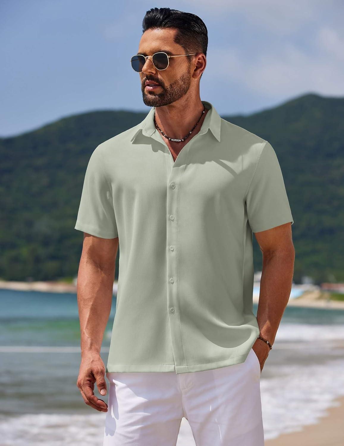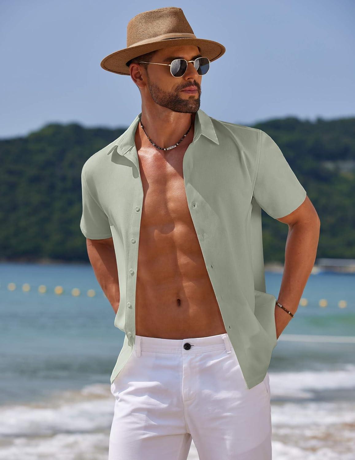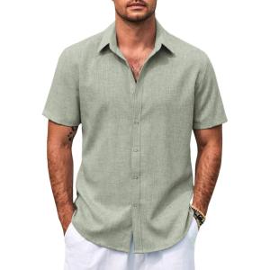 COOFANDY Mens Casual Summer Beach Shirt Button Down Short Sleeve Shirts Vacation Shirt Cotton Linen Shirts(Light Green)