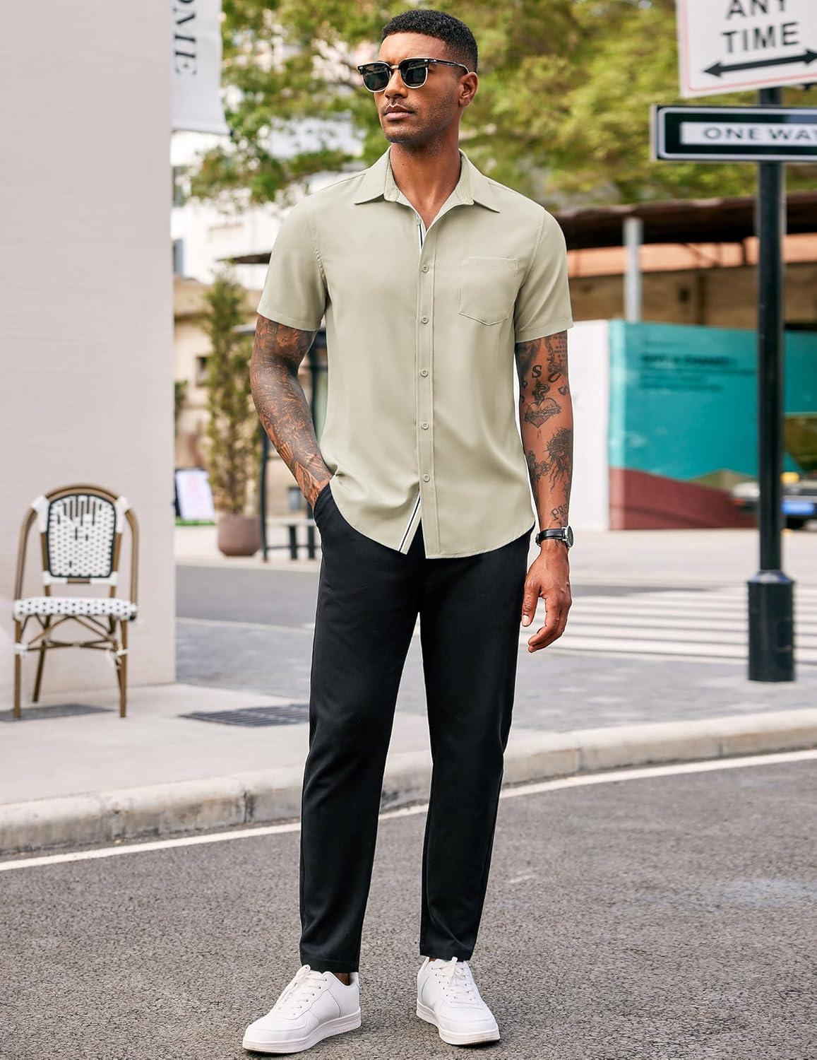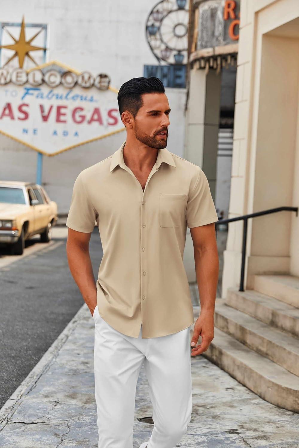 COOFANDY Mens Short Sleeve Button Down Shirts Casual Dress Shirts for Men Summer Untucked Shirts with Pocket(Light Khaki)