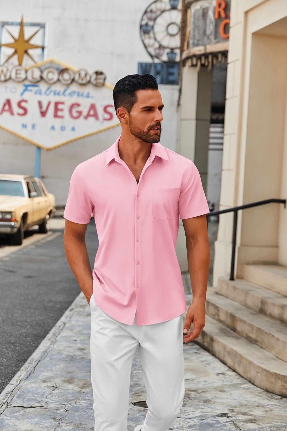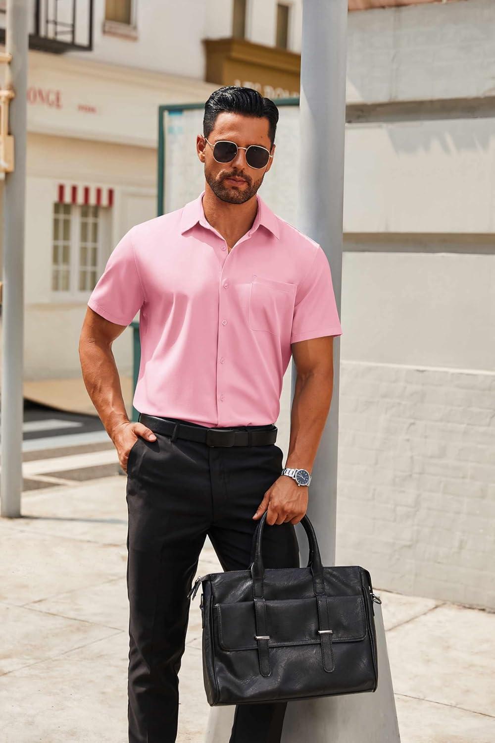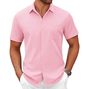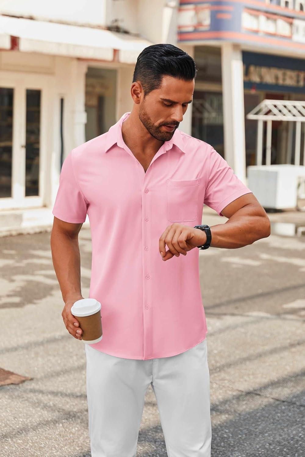 COOFANDY Mens Short Sleeve Button Down Shirts Casual Dress Shirts for Men Summer Untucked Shirts with Pocket(Pink)