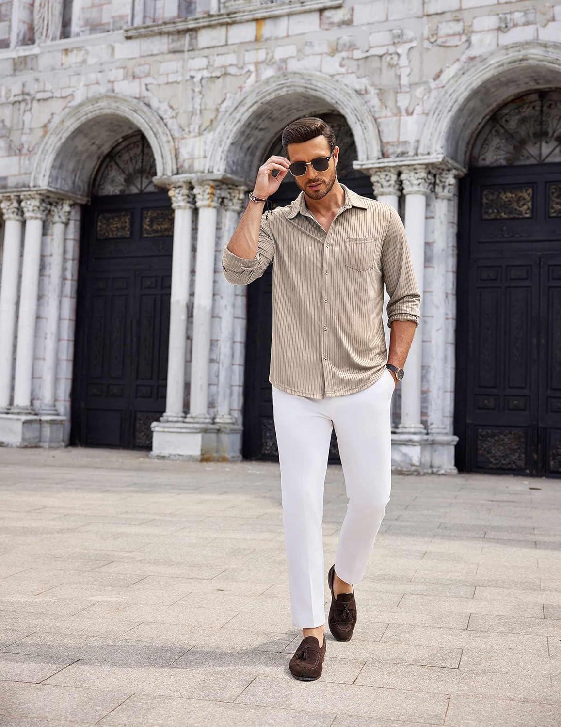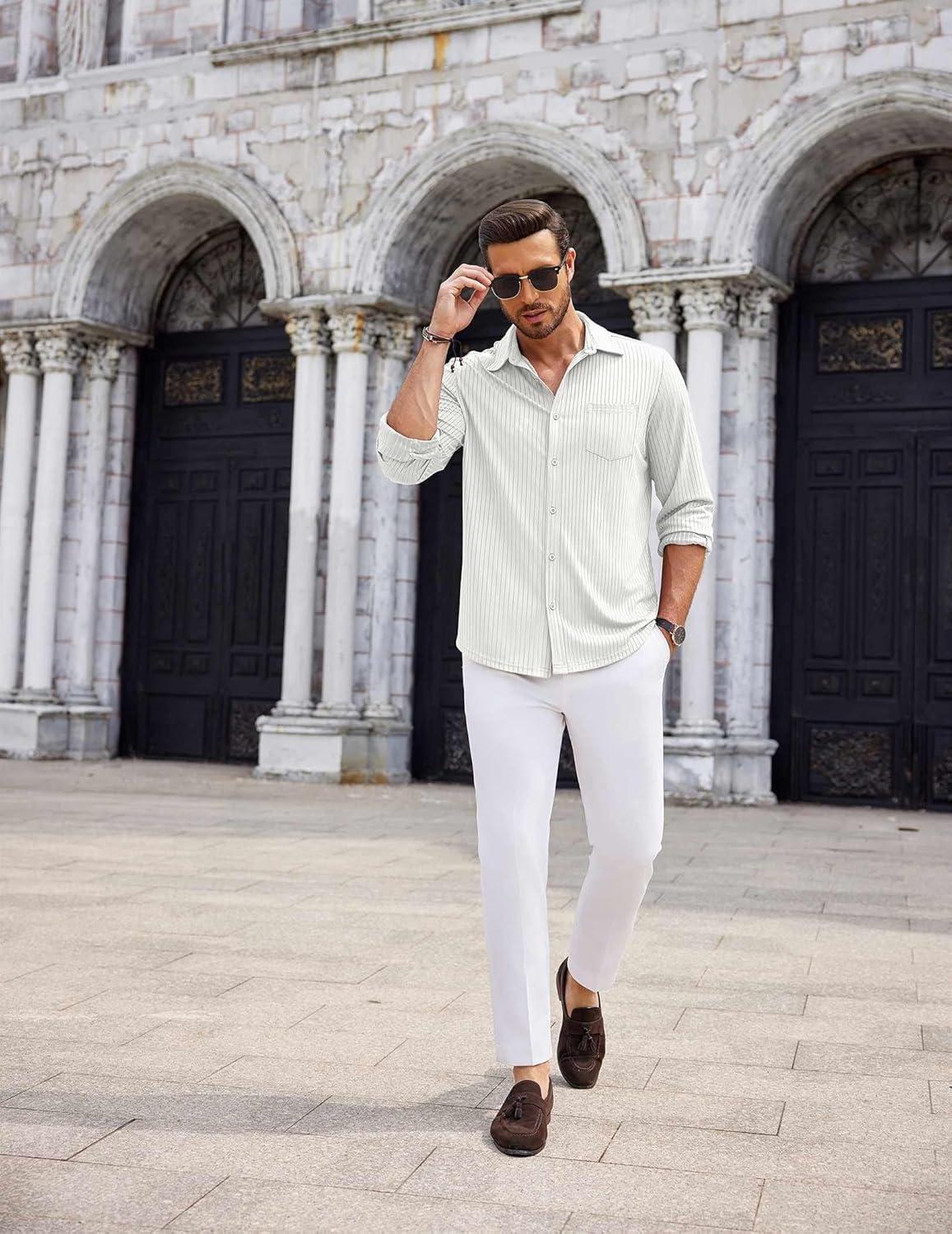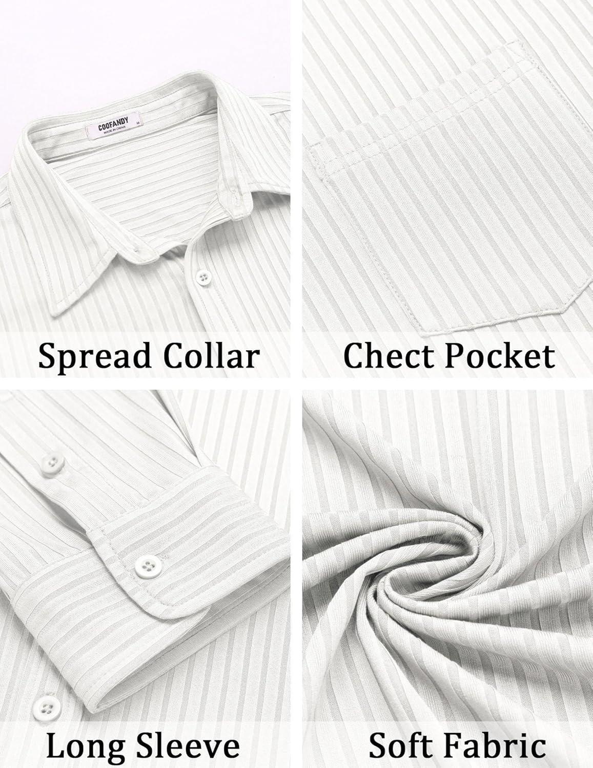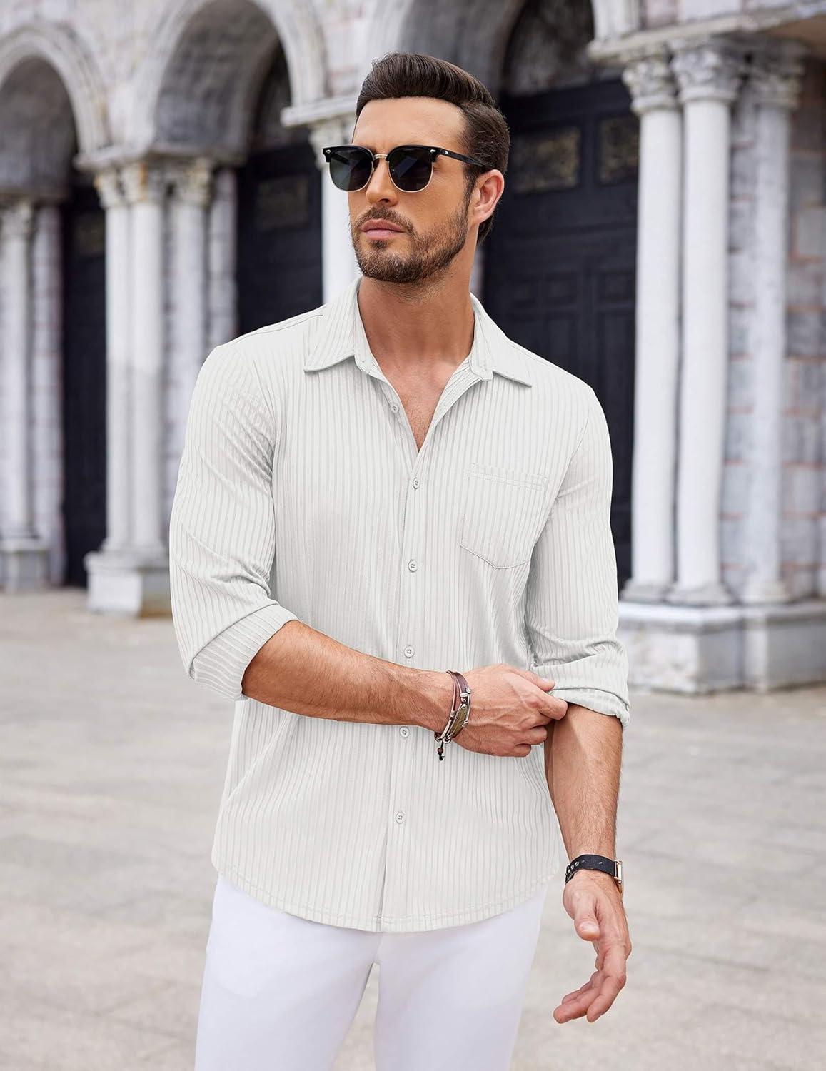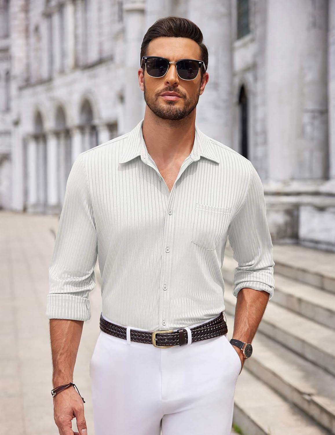COOFANDY Men’s Casual Button Down Shirt Long Sleeve Wrinkle Free Shirts Loose fit Shirt Textured Stretch Shirts with Pocket(White)