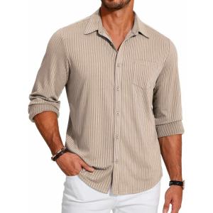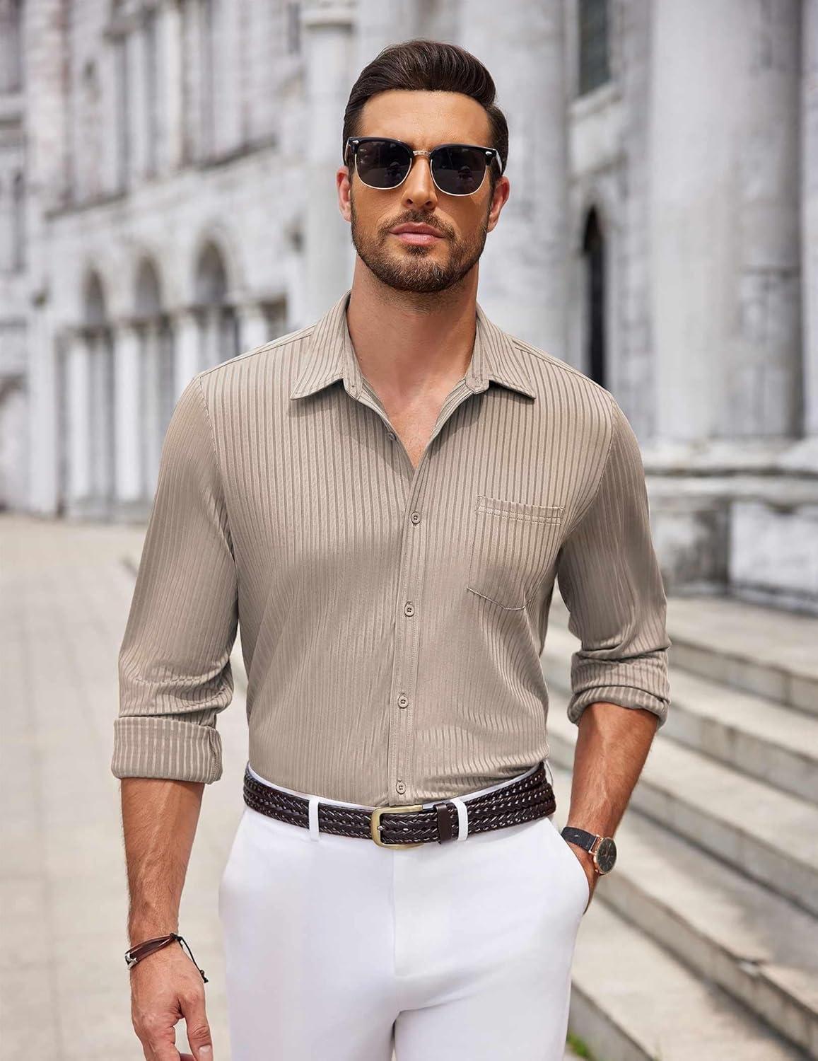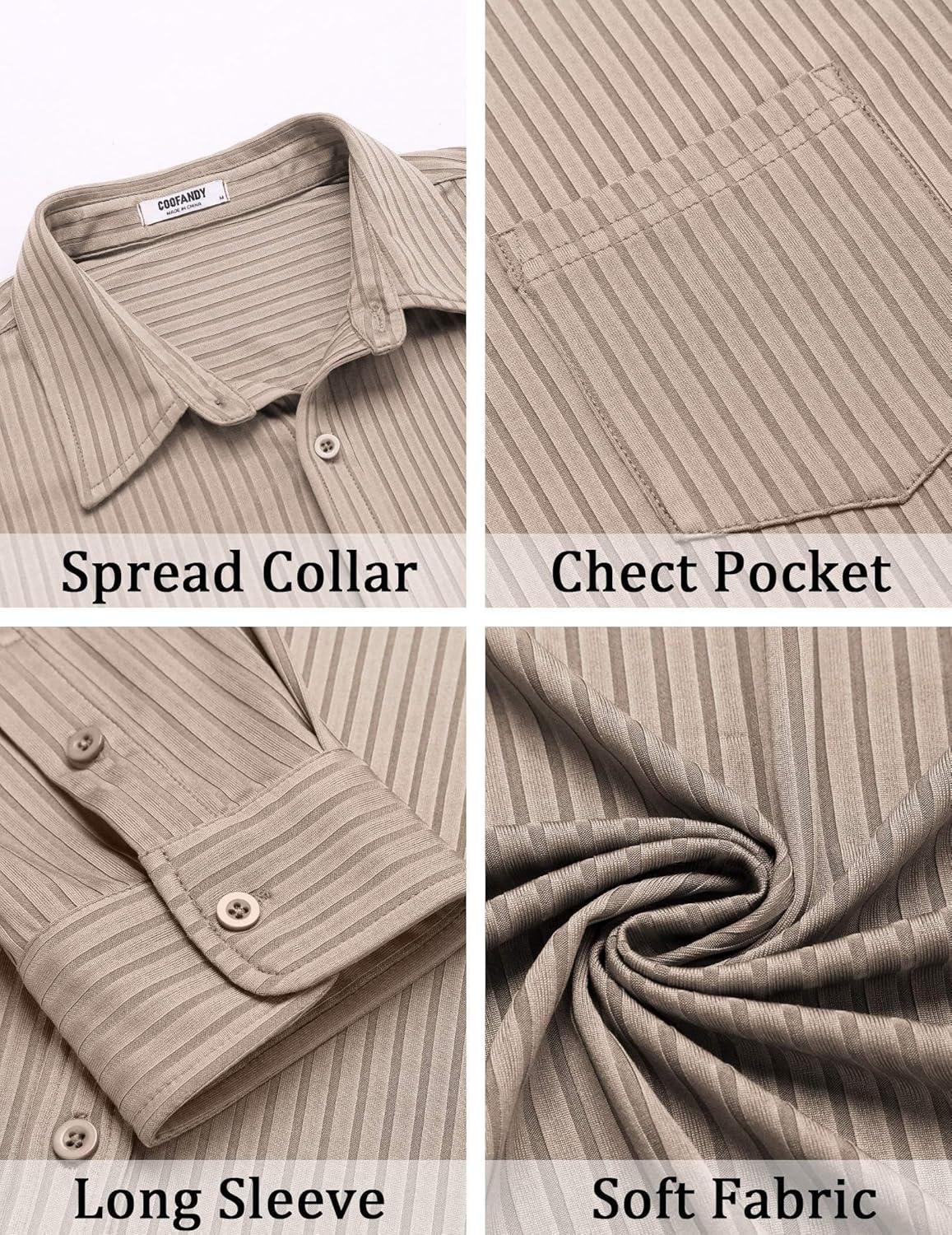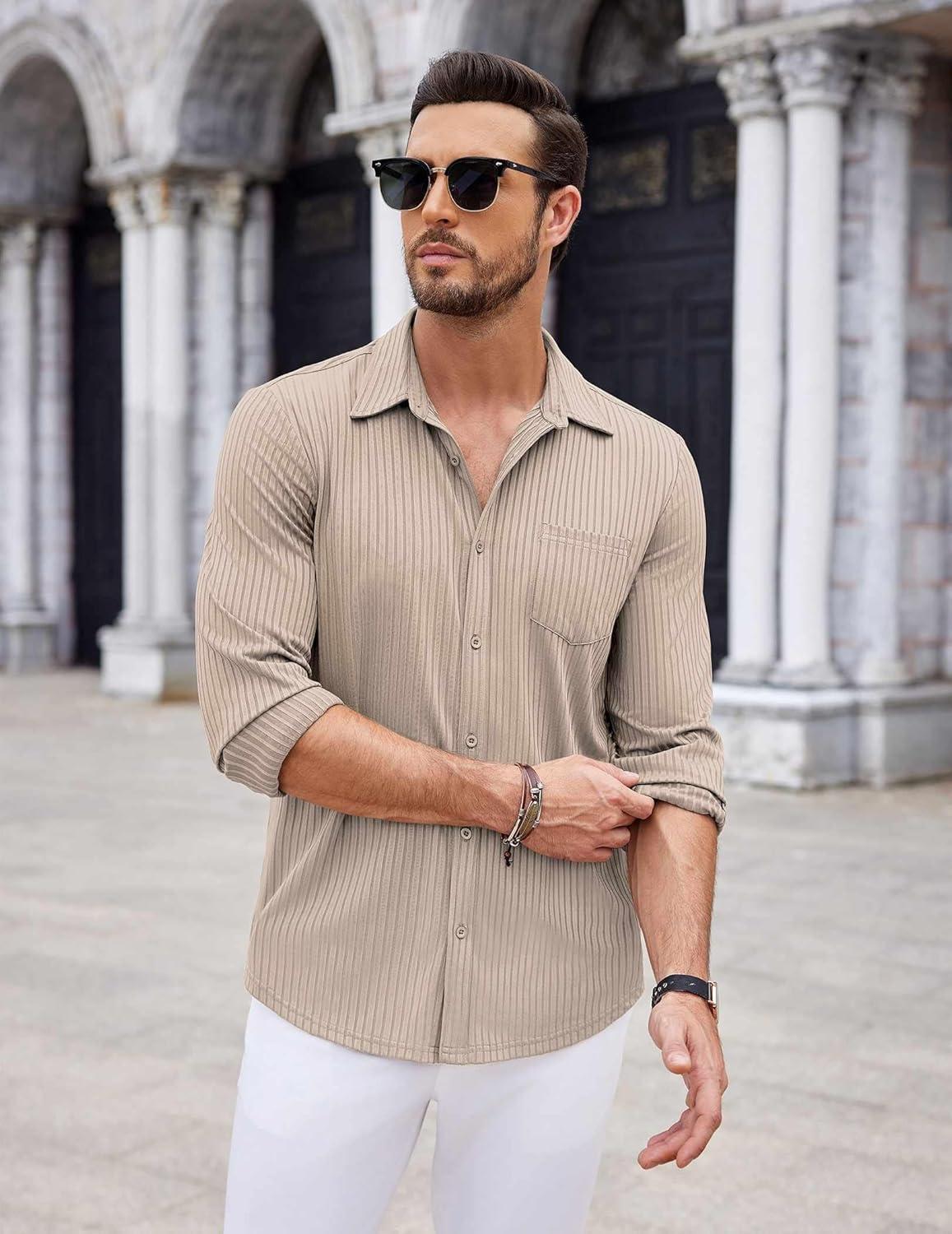 COOFANDY Men’s Casual Button Down Shirt Long Sleeve Wrinkle Free Shirts Loose fit Shirt Textured Stretch Shirts with Pocket(Light Brown)