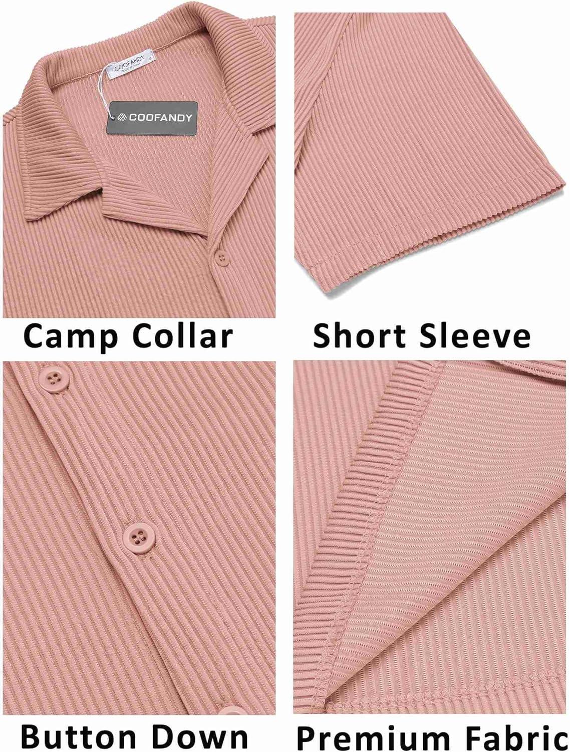 COOFANDY Men’s Casual Button Down Shirt Short Sleeve Textured Summer Cuban Beach Shirts(Pink)