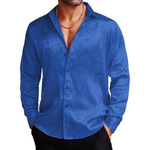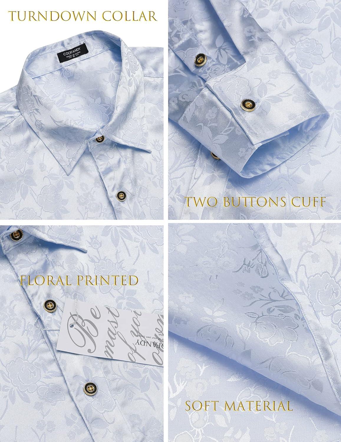 COOFANDY Men’s Silk Satin Dress Shirts Jacquard Long Sleeve Floral Button Up Shirts Party Prom Wedding Shirt(Clear Blue)