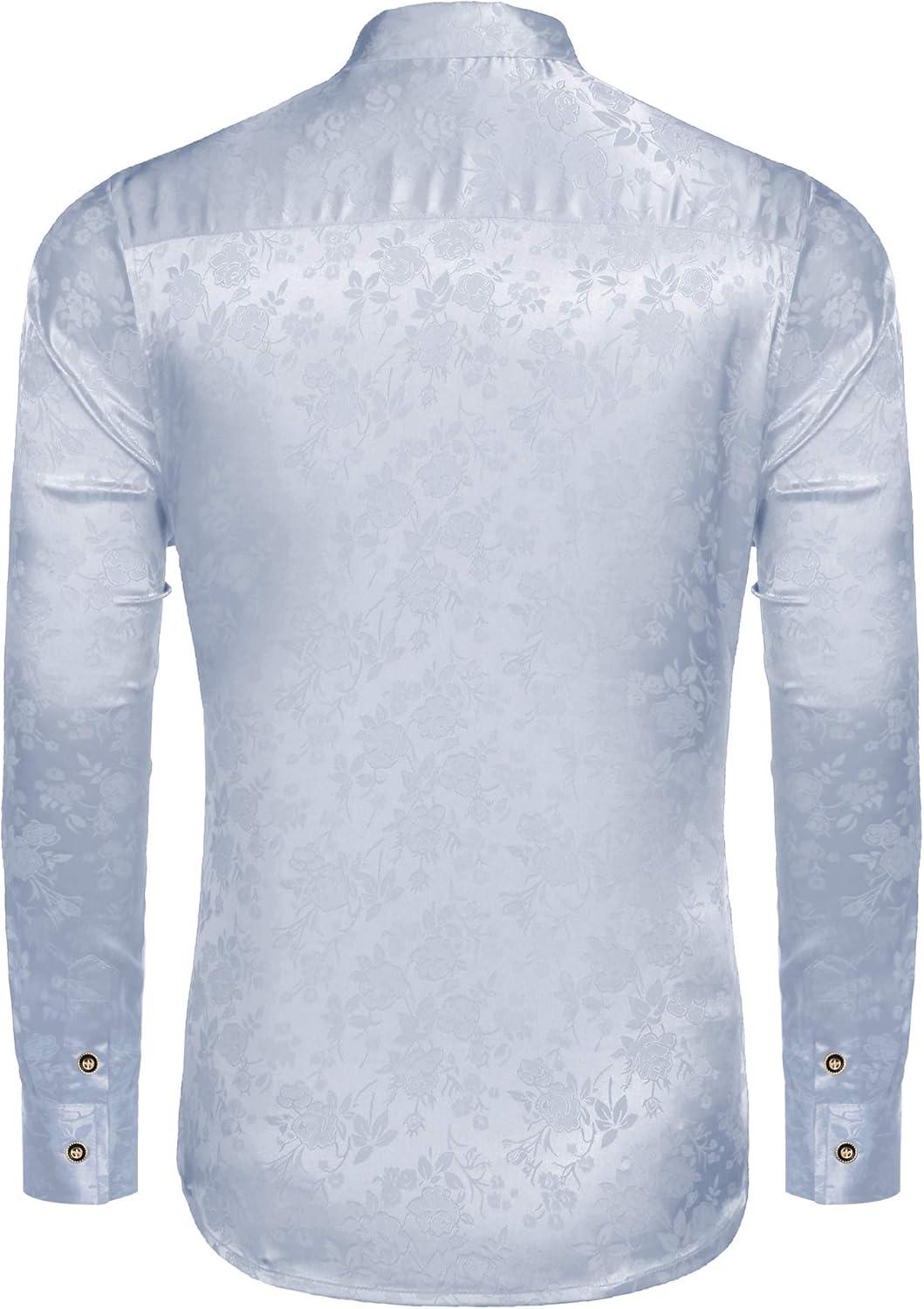 COOFANDY Men’s Silk Satin Dress Shirts Jacquard Long Sleeve Floral Button Up Shirts Party Prom Wedding Shirt(Blue Rose Jacquard)