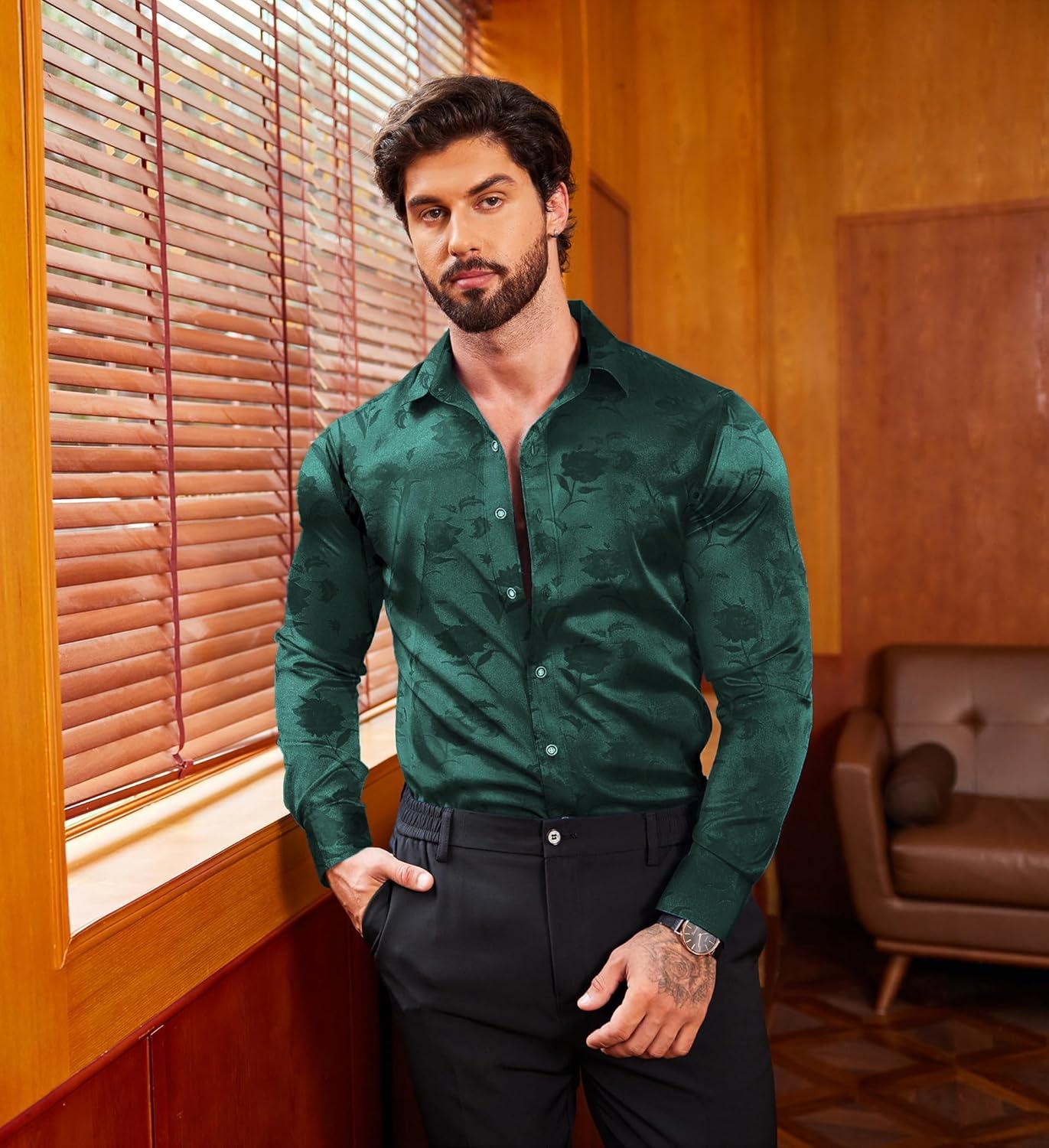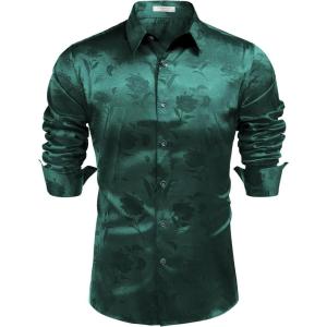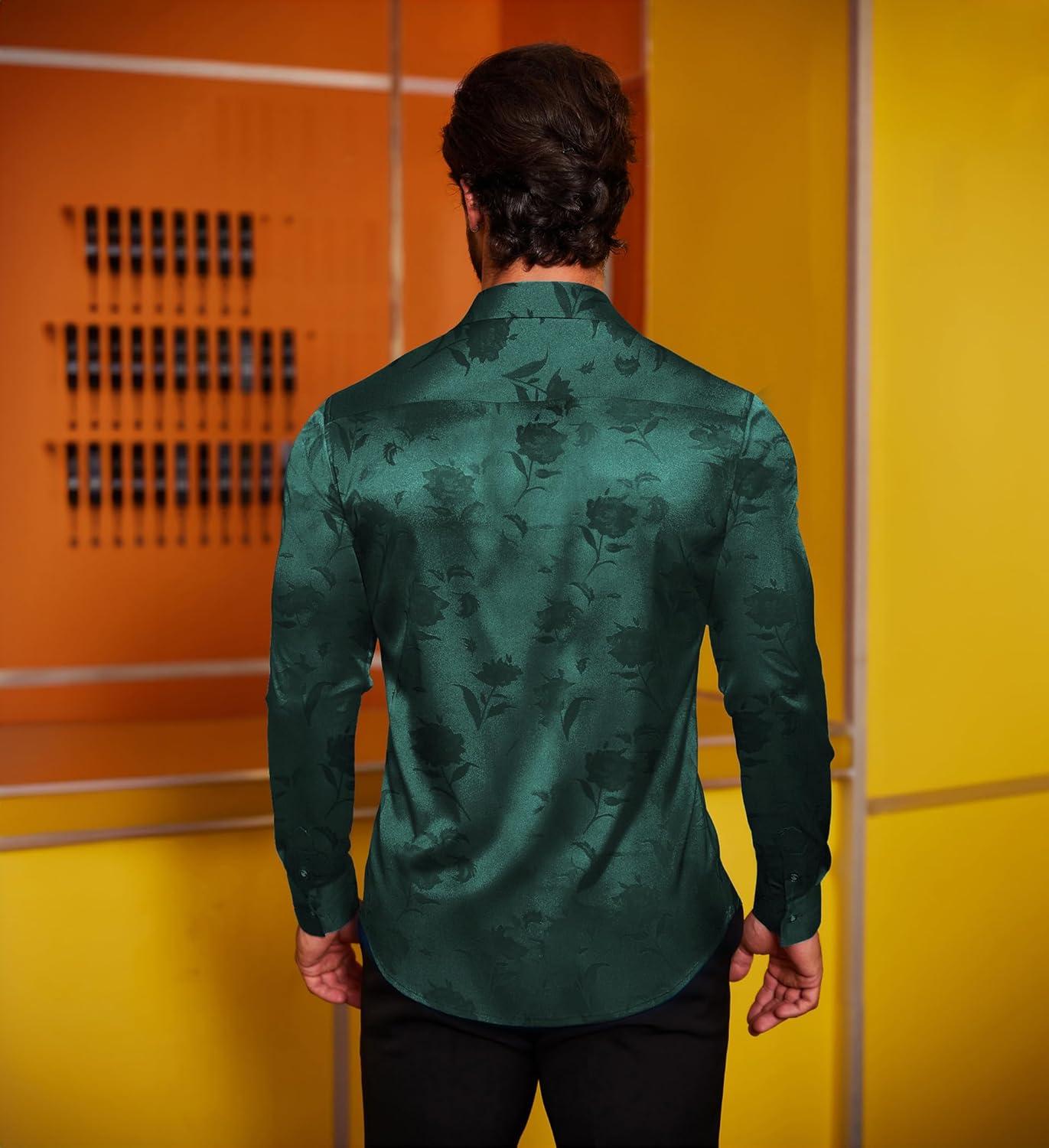 COOFANDY Men’s Silk Satin Dress Shirts Jacquard Long Sleeve Floral Button Up Shirts Party Prom Wedding Shirt(Green Rose Jacquard)