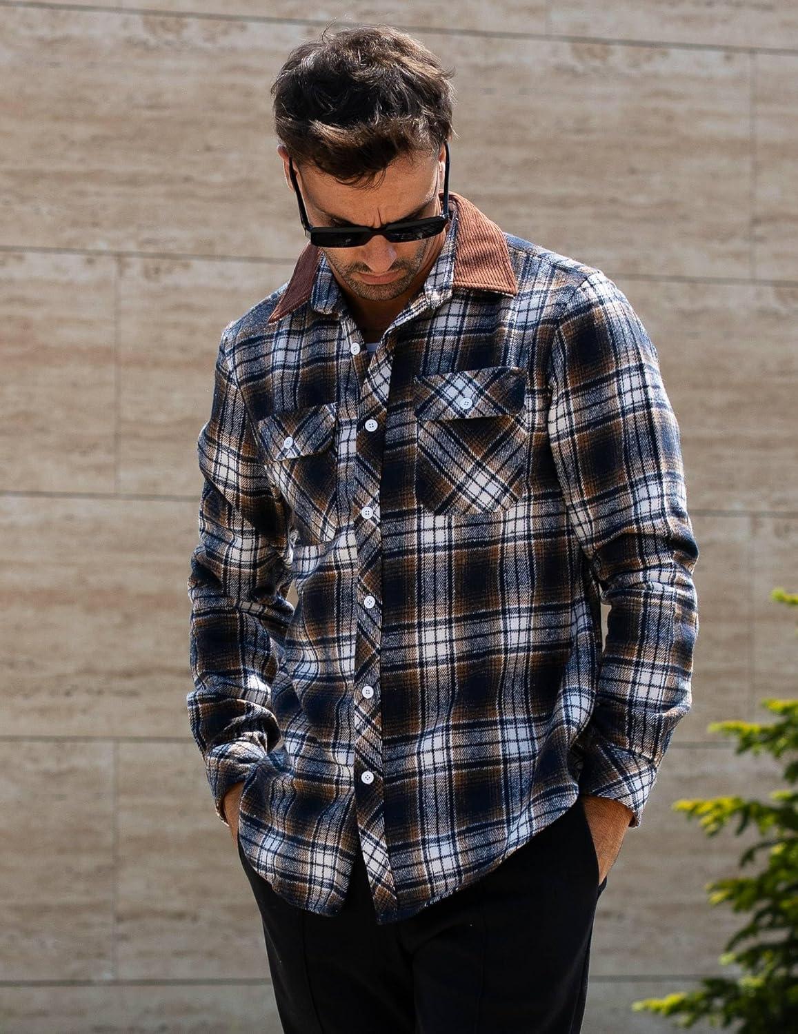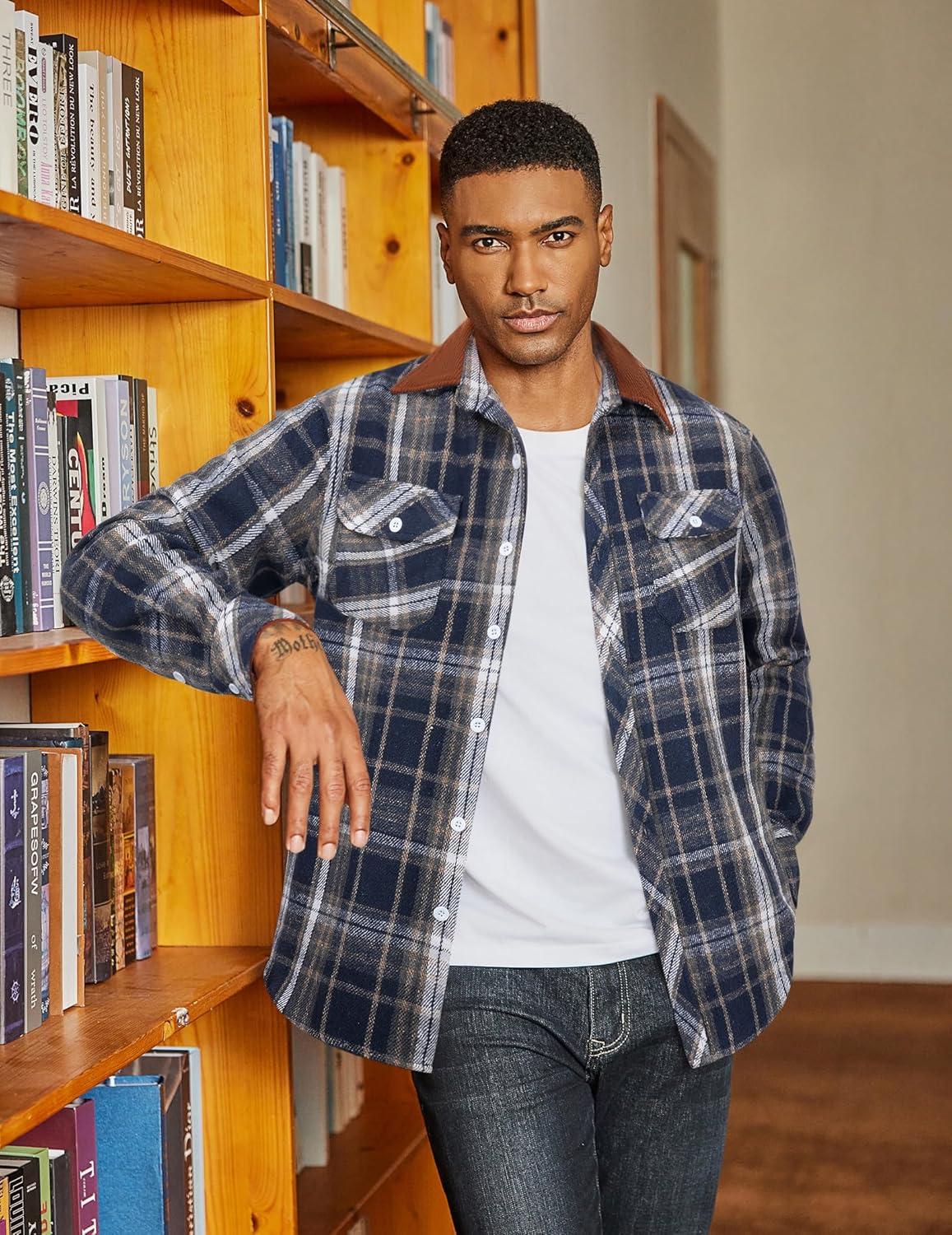 COOFANDY Mens Flannel Shirts Long Sleeve Fleece Plaid Jacket Casual Stylish Button Down Shirts with Pockets(Navy)