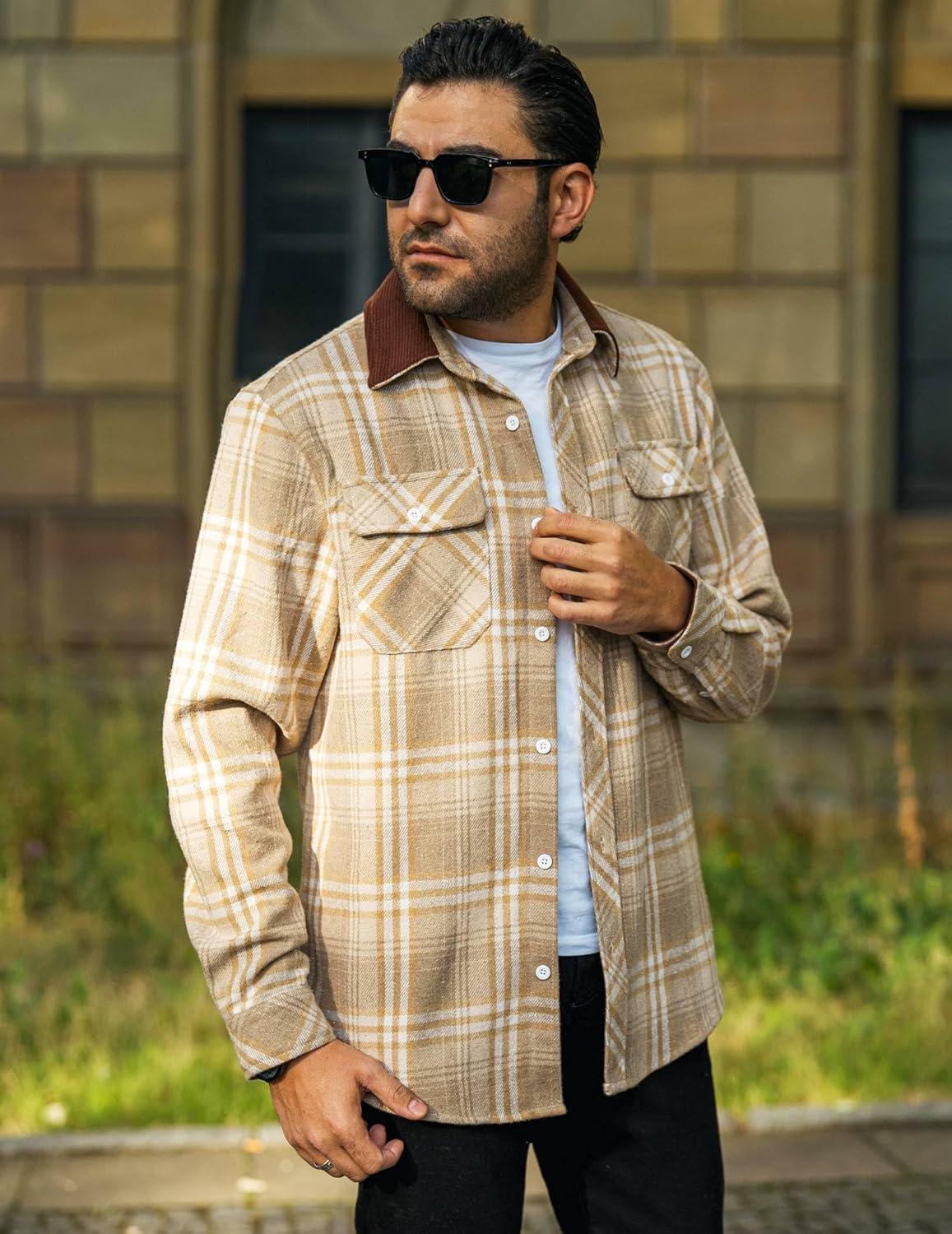 COOFANDY Mens Flannel Shirts Long Sleeve Fleece Plaid Jacket Casual Stylish Button Down Shirts with Pockets(Khaki)