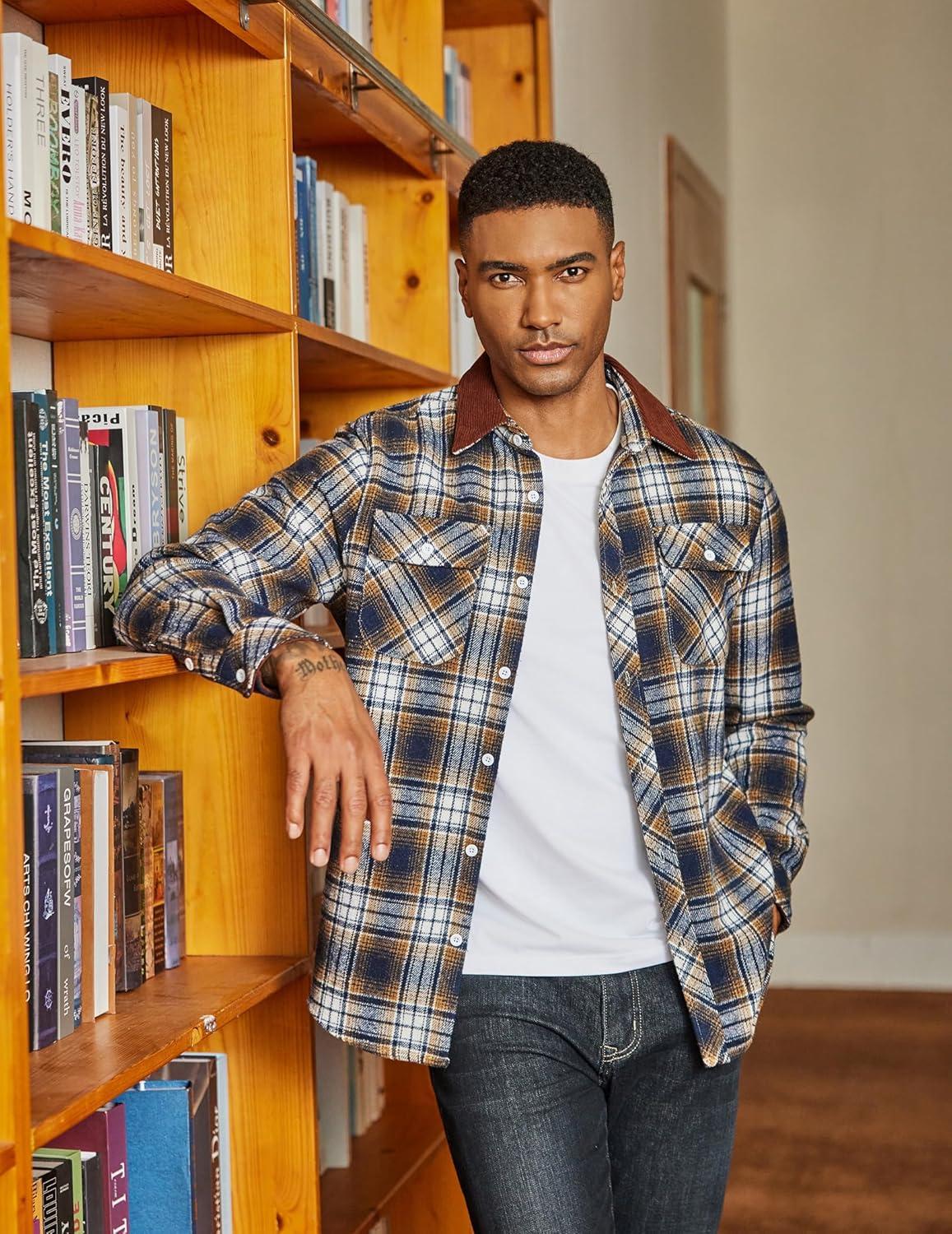 COOFANDY Mens Flannel Shirts Long Sleeve Thermal Button Down Shirt Shacket Lightweight Jacket(Brown)