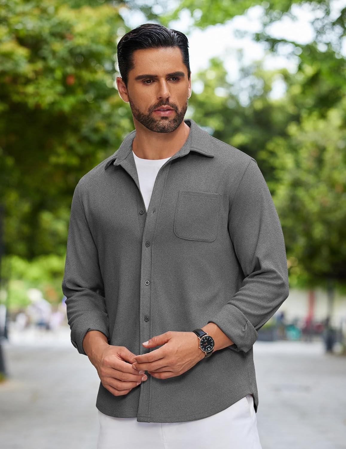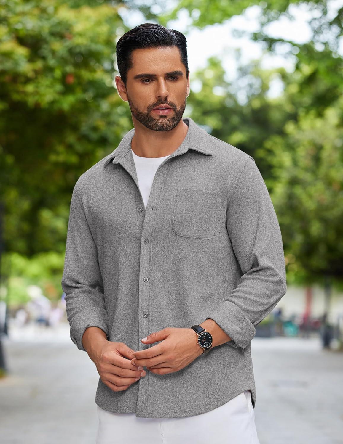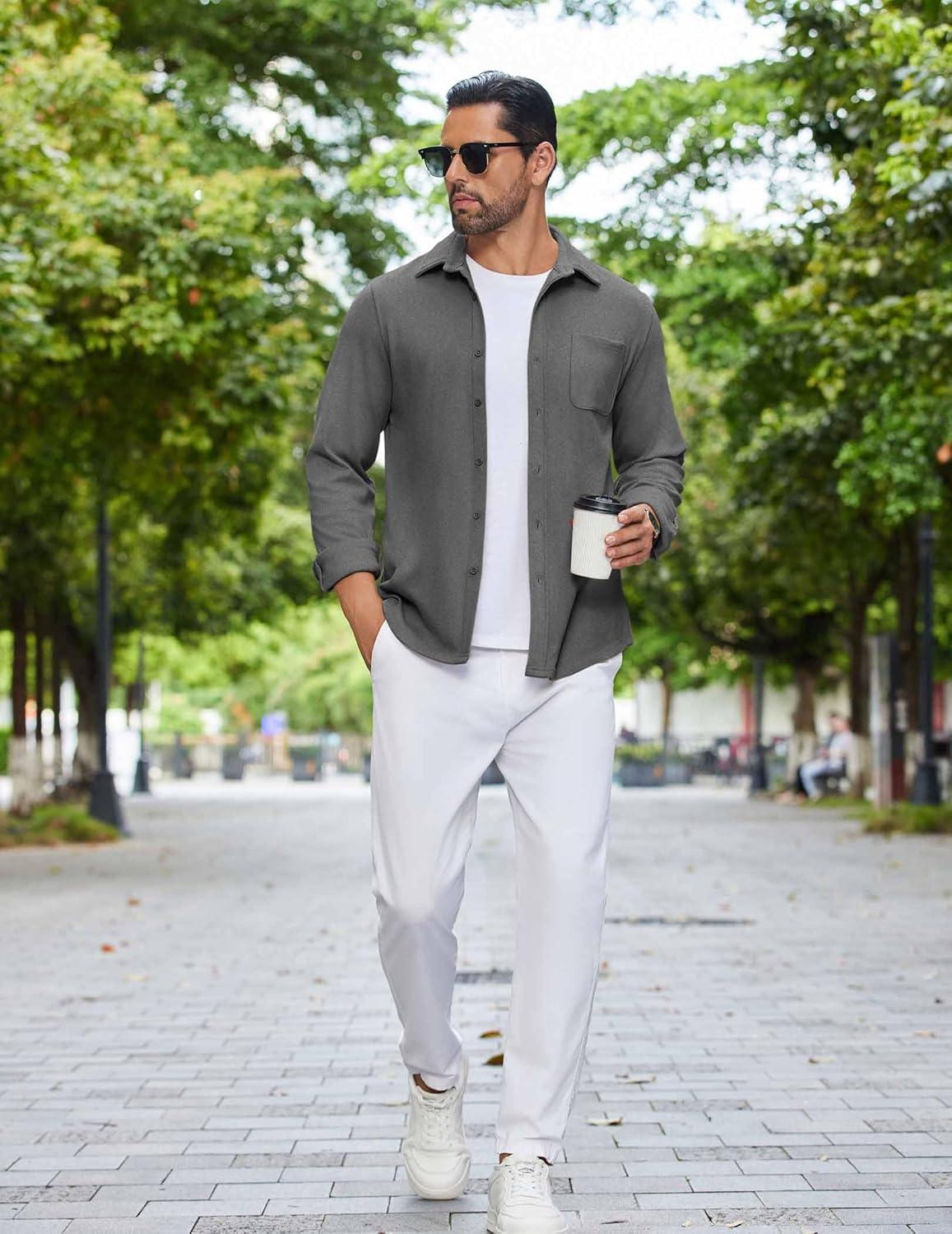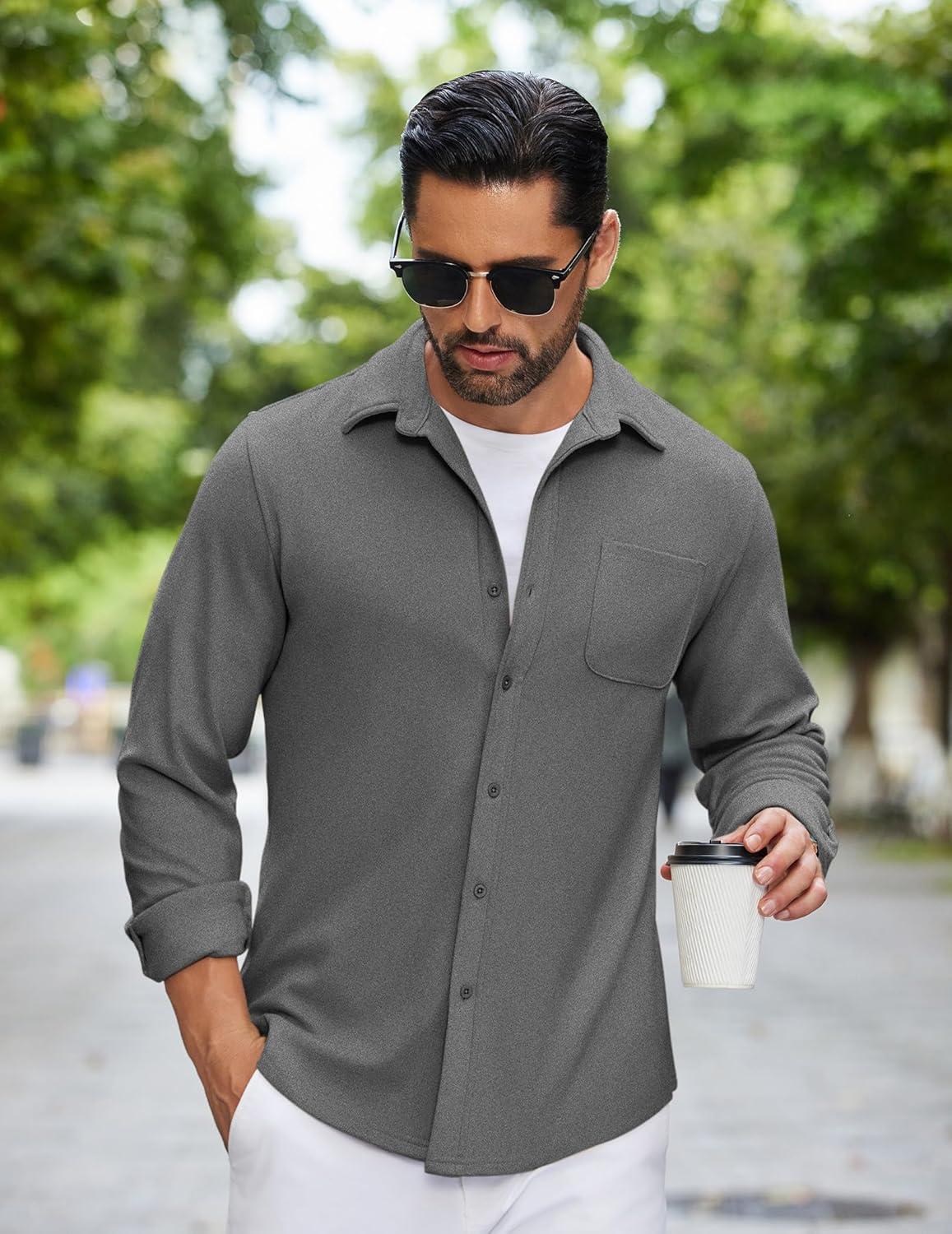 COOFANDY Mens Flannel Shirts Long Sleeve Thermal Button Down Shirt Shacket Lightweight Jacket(Light Grey)