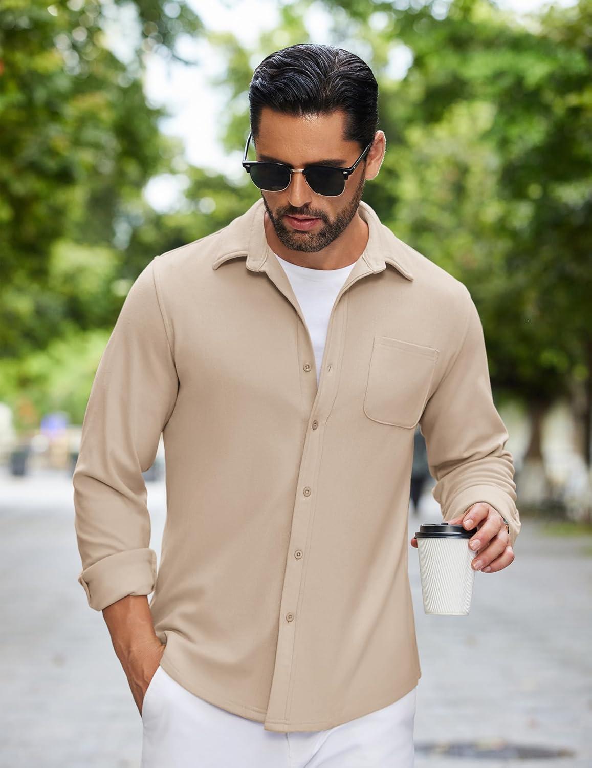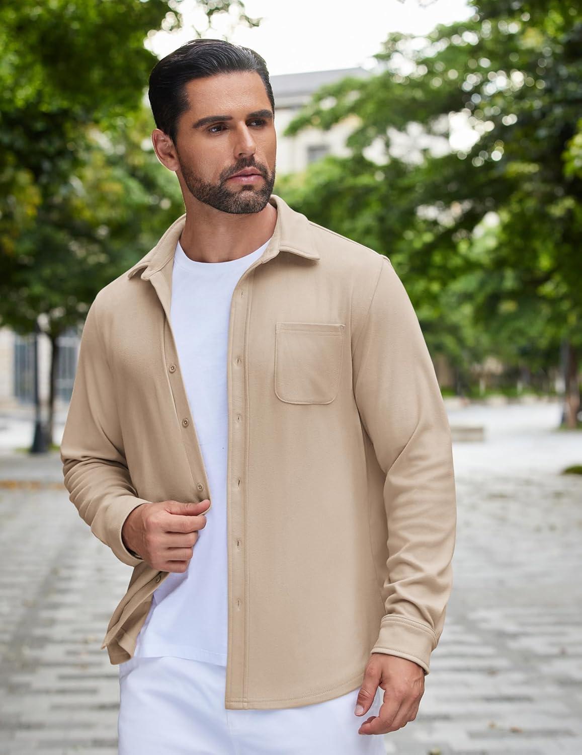 COOFANDY Mens Flannel Shirts Long Sleeve Thermal Button Down Shirt Shacket Lightweight Jacket(Beige)