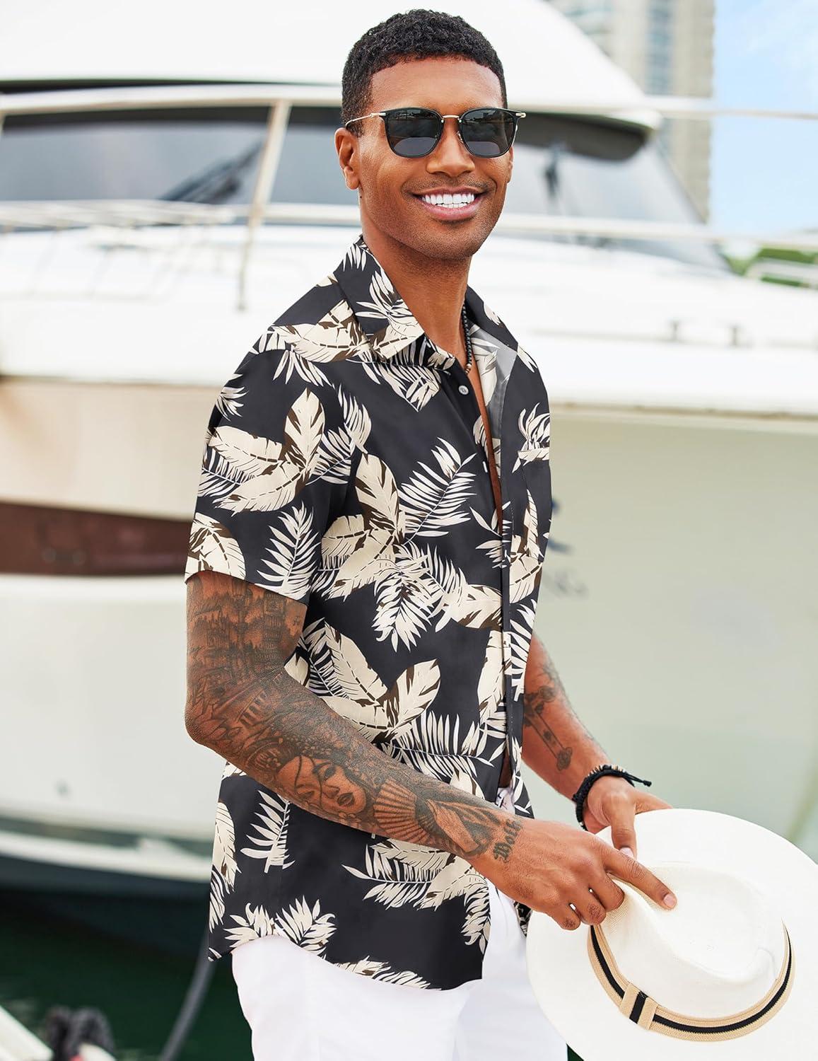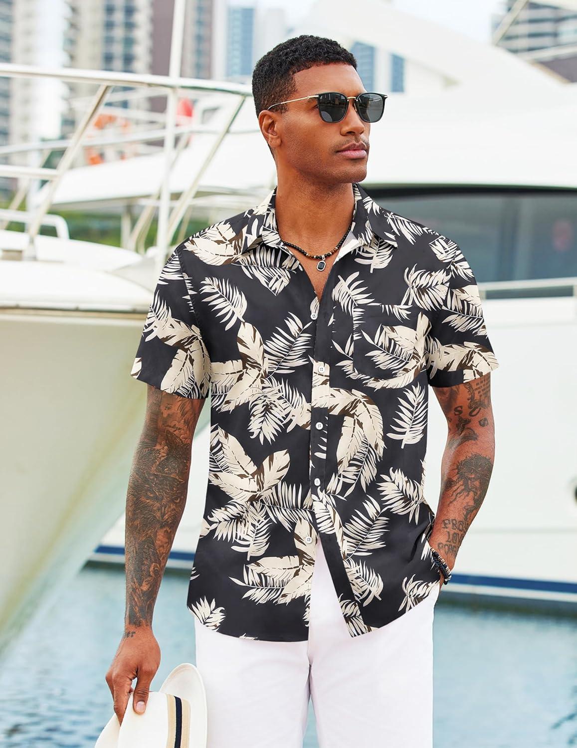 COOFANDY Mens Hawaiian Shirts Short Sleeve Tropical Button Down Shirts Floral Summer Beach Shirt(Black – White Leaf)