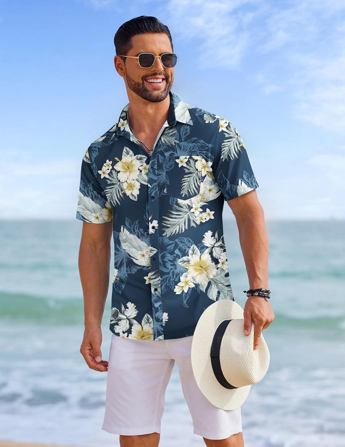 COOFANDY Mens Hawaiian Shirt Short Sleeve Buttoon Down Shirts Casual Tropical Floral Summer Linen Shirts(Navy Blue)