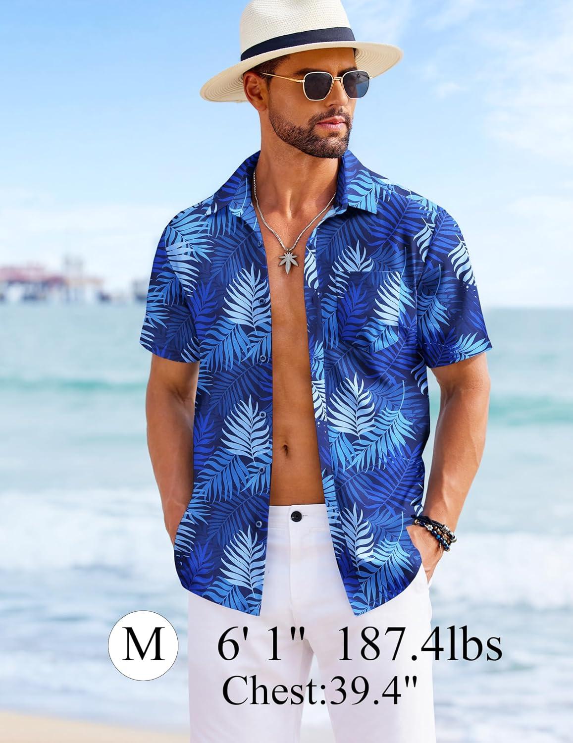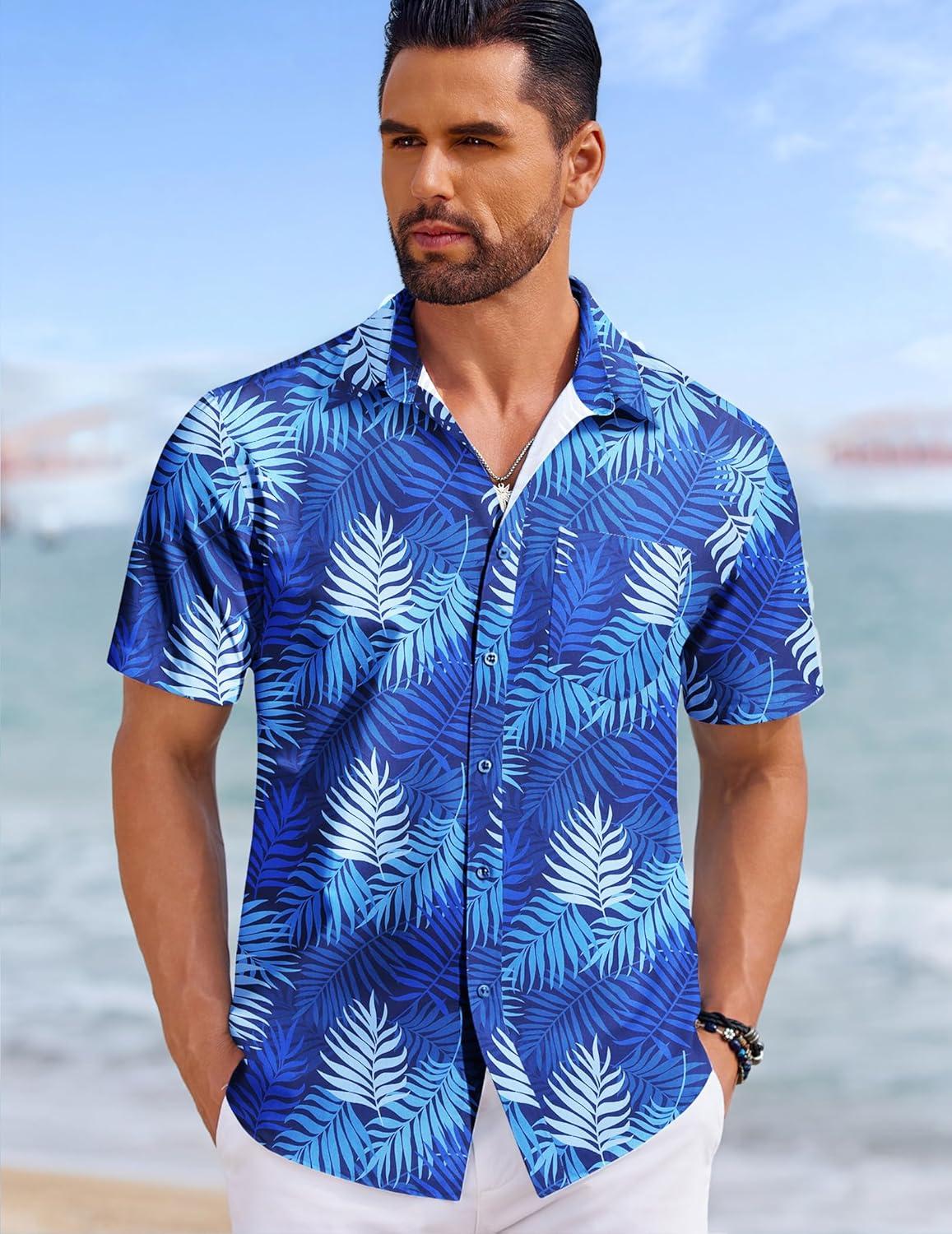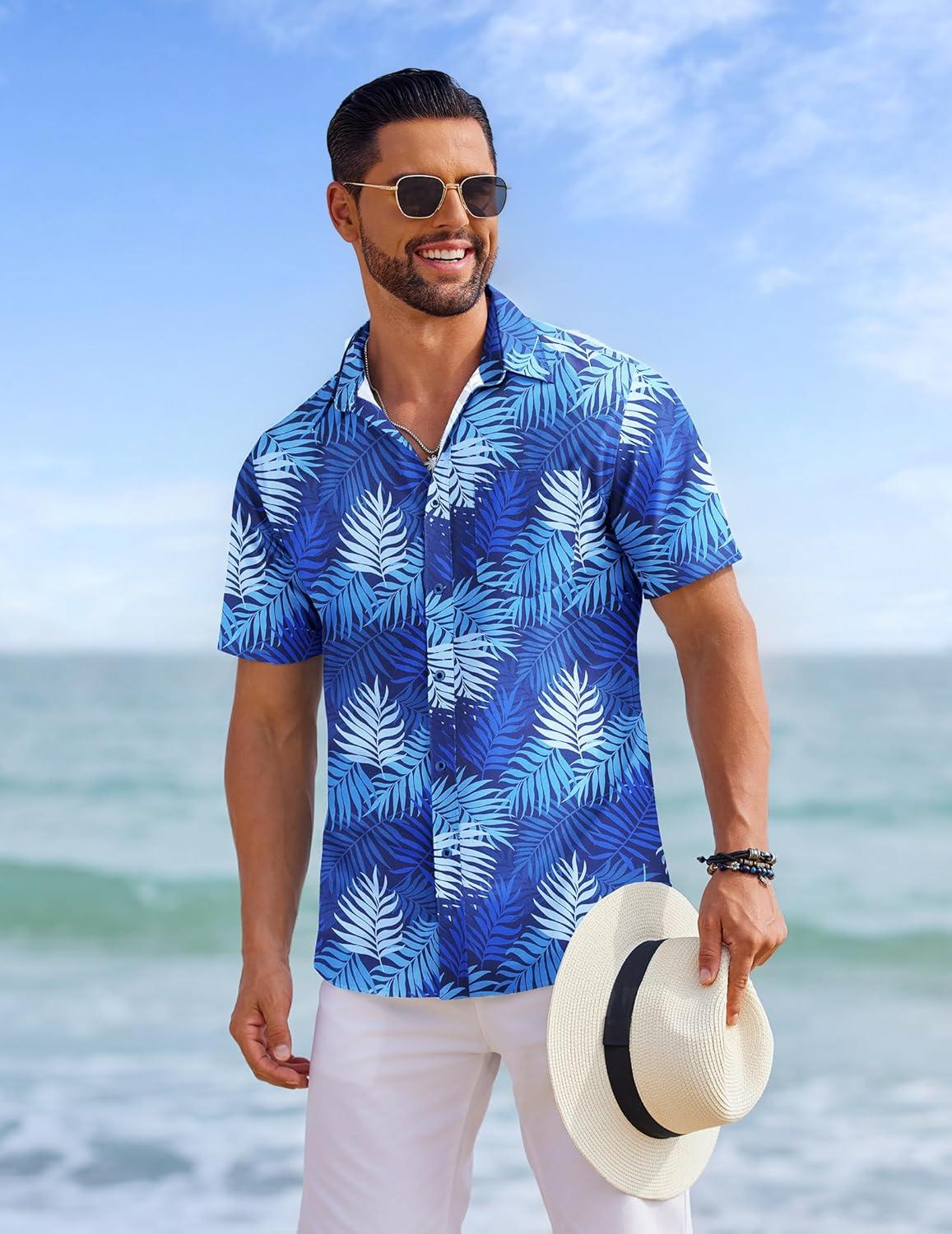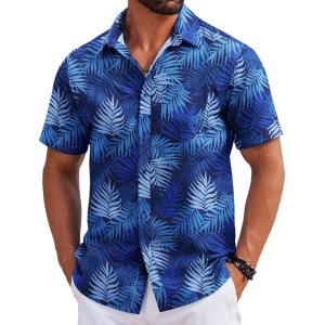 COOFANDY Mens Hawaiian Shirts Short Sleeve Tropical Button Down Shirts Floral Summer Beach Shirt(Blue – Palm Leaf)
