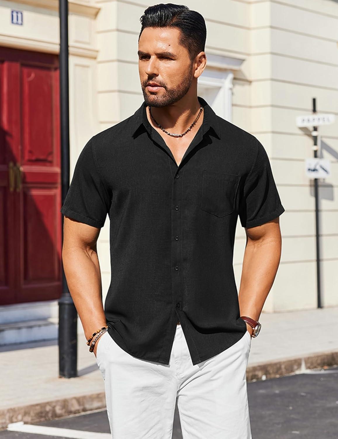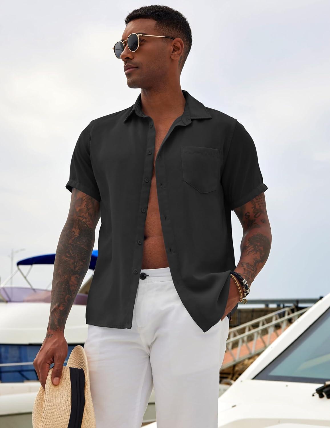 COOFANDY Mens Casual Short Sleeve Shirts Button Down Textured Shirts Summer Beach Shirt with Pocket(Black)