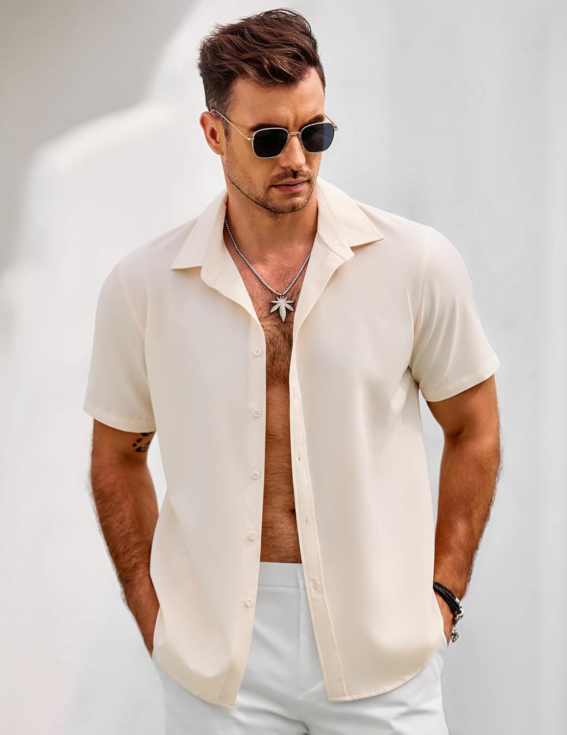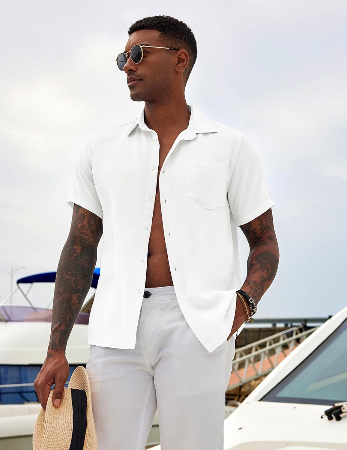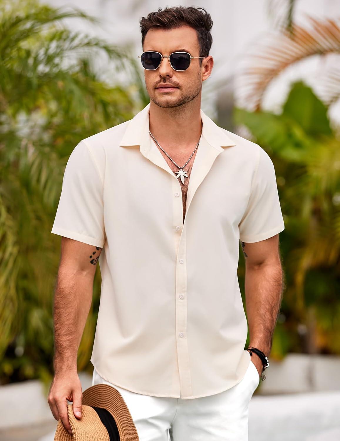 COOFANDY Men’s Short Sleeve Casual Button Down Shirts Textured Summer Beach Shirt with Pocket(White)